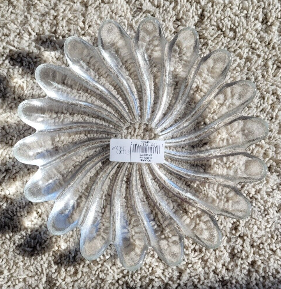 This Studio Nova Solaris Plate is a beautiful addition to any dining collection. The plate measures 8 1/4 inches in diameter and features a unique swirl pattern in clear glass. Made in Germany in 1998, this late 20th century plate is perfect for all occasions and is machine washable up to 100°F for easy care. The glossy finish adds a touch of elegance to any table setting and the plate is ideal for serving your favorite dishes. This plate is a must-have for any collector of decorative cookware, dinnerware, and serveware.