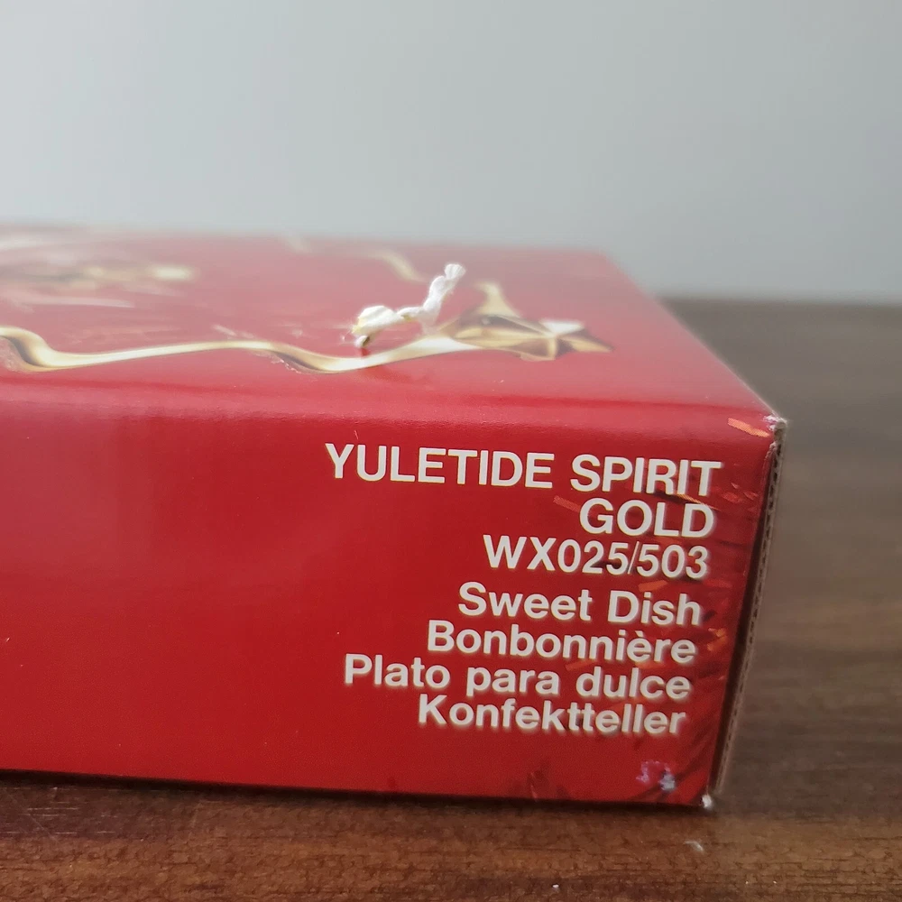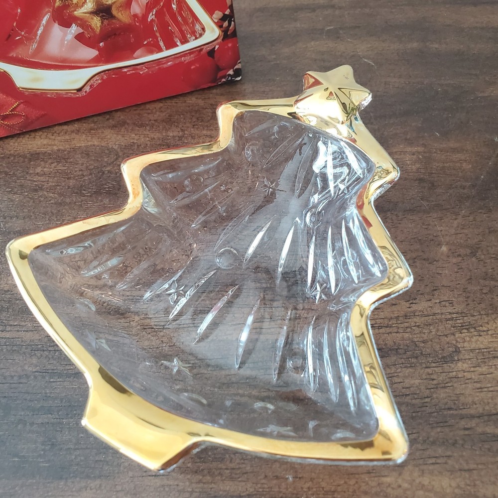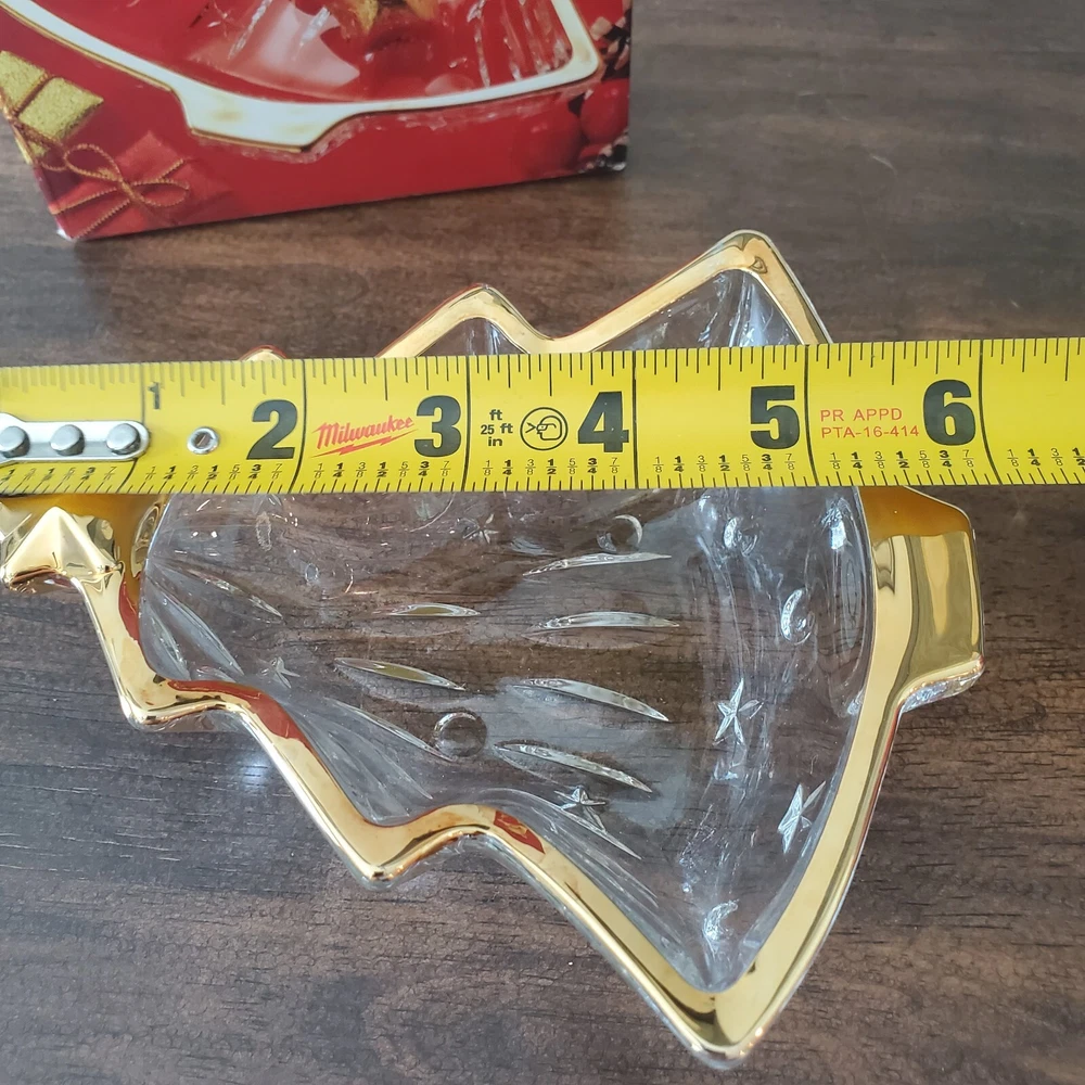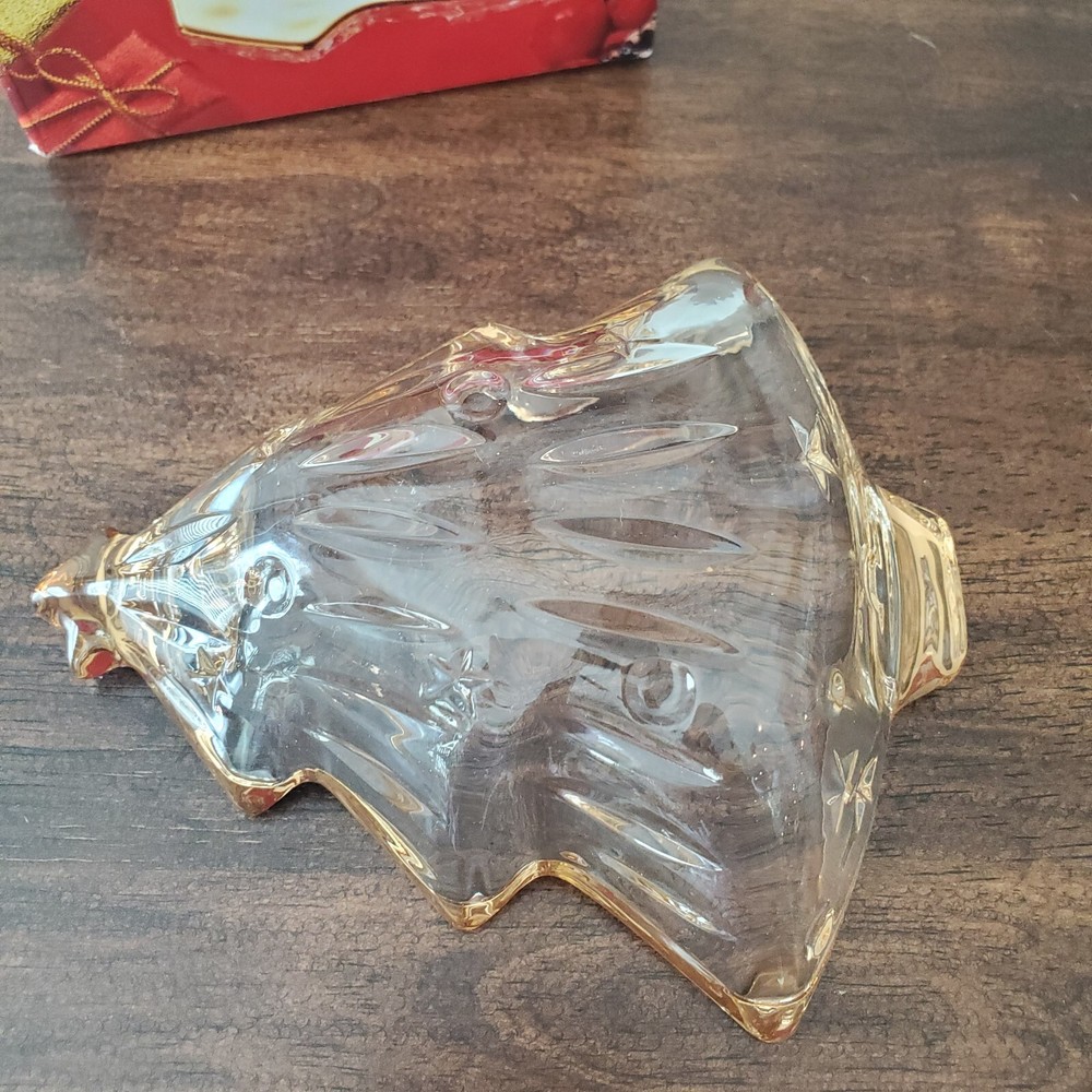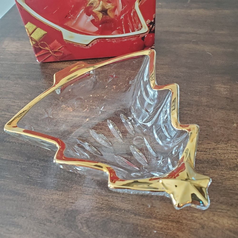 STUDIO NOVA Spirit Gold Trim Christmas Tree Shaped Glass Candy Dish Original Box. Measurements in photos. Condition is Pre-owned. Shipped with USPS Mail