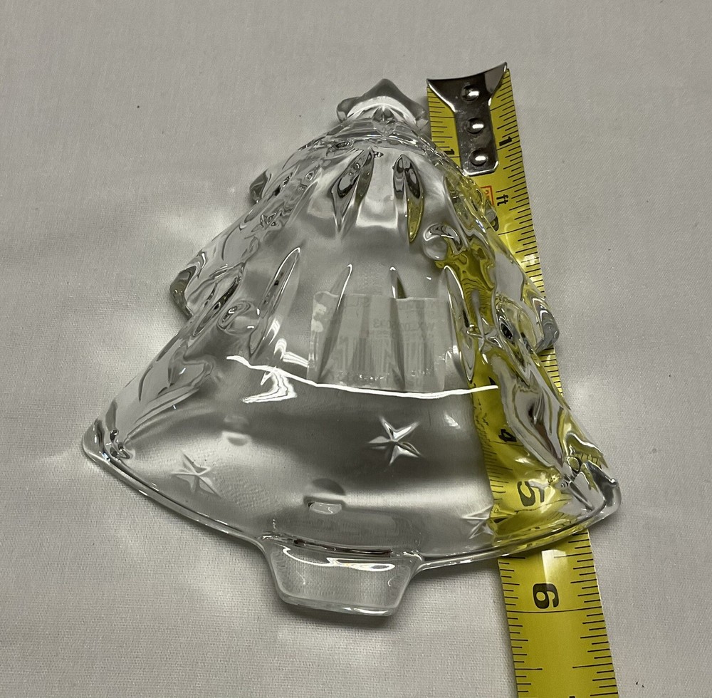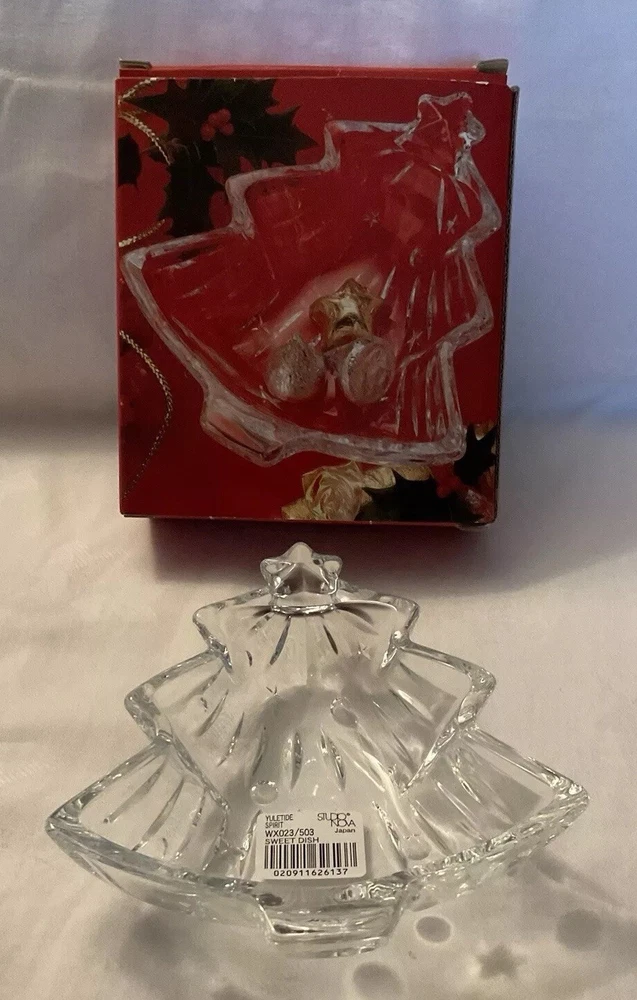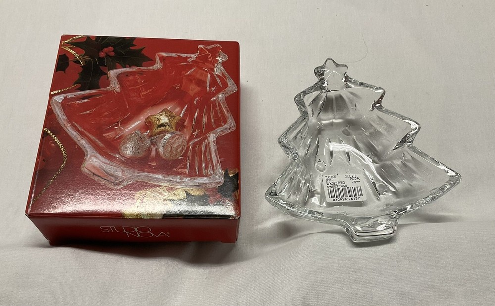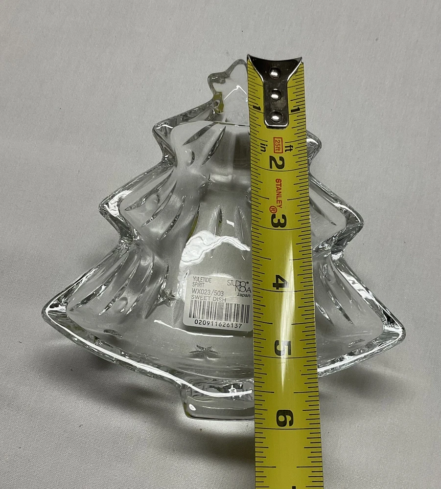 STUDIO NOVA YULETIDE SPIRIT WX023/503 TREE SHAPED GLASS SWEET DISH. Approx. Height top of star to bottom of the tree stand 6”, width longest area bottom side to side 5”. This beautiful candy dish by Studio Nova is the perfect addition to your Christmas table decor. Its clear glass material and tree shape design make it a lovely piece to display during the holiday, Use it to serve candy, nuts, or other small treats.