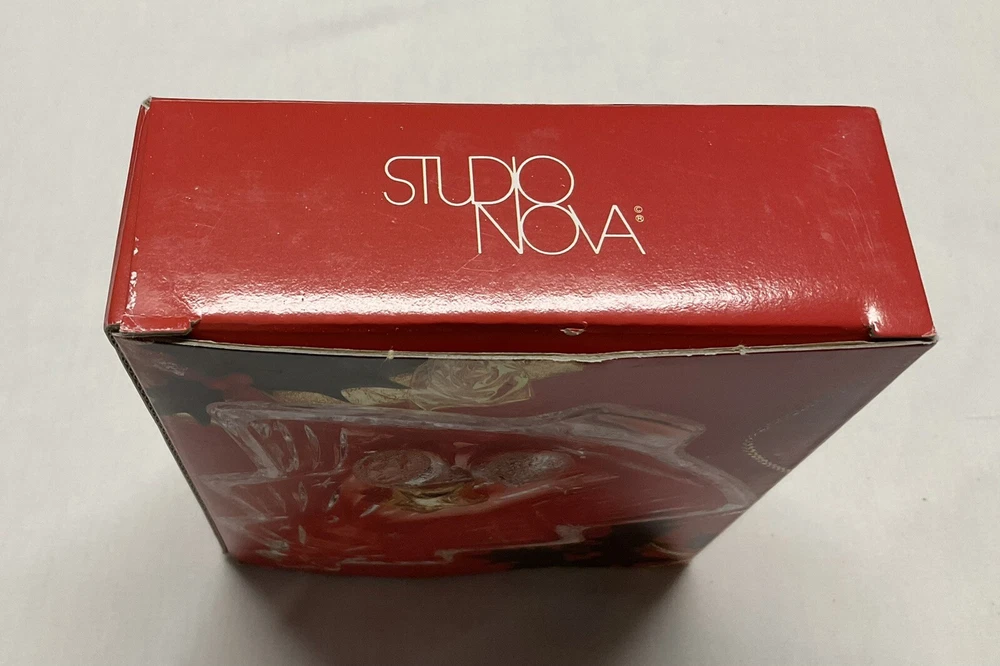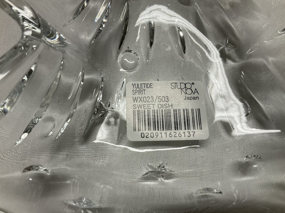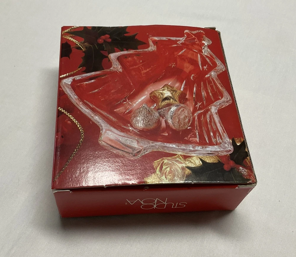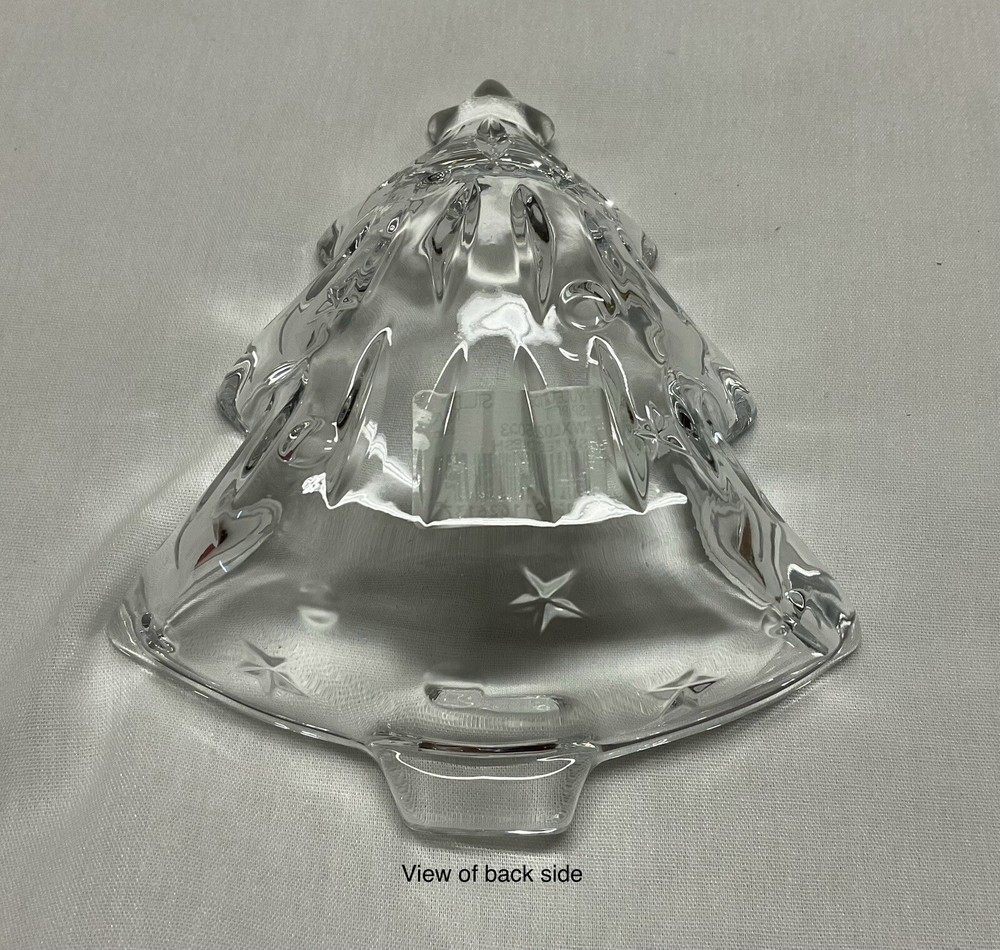 STUDIO NOVA YULETIDE SPIRIT WX023/503 TREE SHAPED GLASS SWEET DISH. Approx. Height top of star to bottom of the tree stand 6”, width longest area bottom side to side 5”. This beautiful candy dish by Studio Nova is the perfect addition to your Christmas table decor. Its clear glass material and tree shape design make it a lovely piece to display during the holiday, Use it to serve candy, nuts, or other small treats.