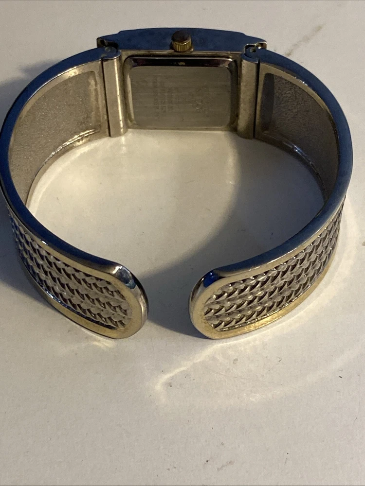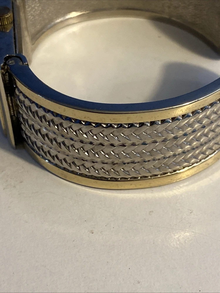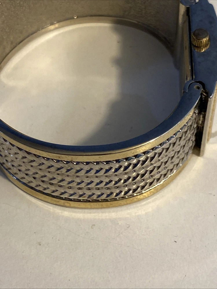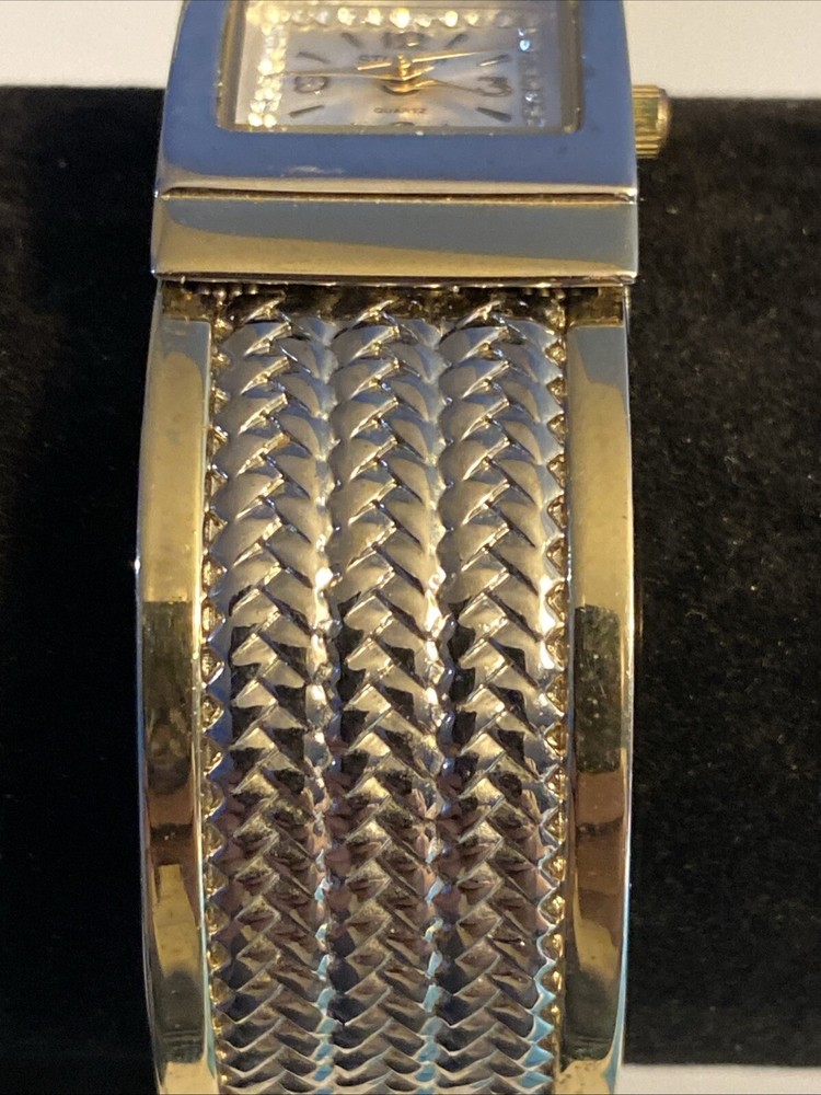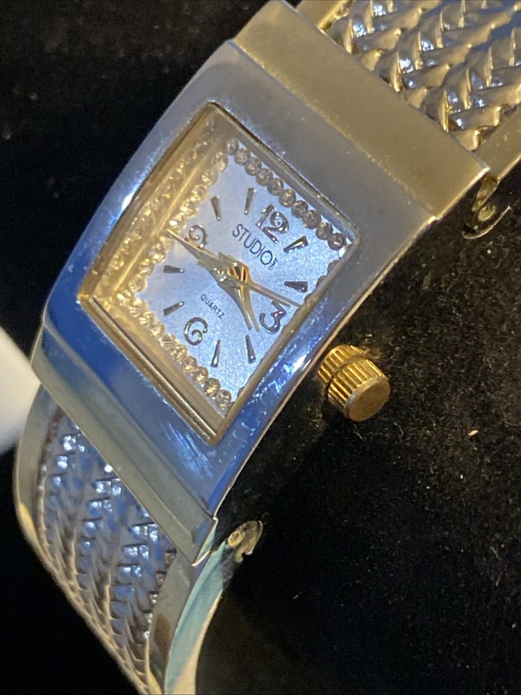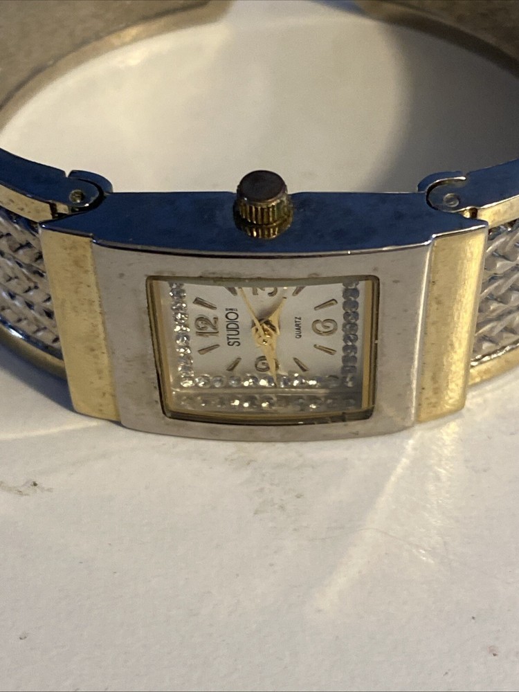 Elevate your wardrobe with the Studio Time Ladies Watch, a timeless accessory that seamlessly blends classic and contemporary style. Featuring a polished silver case with a fixed gold bezel, this watch presents an elegant sunburst dial with Arabic numerals and baton indexes. The central second hand, diamond accent, and 12-hour dial provide a harmonious display, while the push/pull crown allows for easy adjustments.The watch's most distinctive feature is its wheat pattern bangle, crafted from a durable metal alloy with a butterfly clasp closure, designed to fit wrist sizes up to 6 inches. Whether you're dressing up for a formal event or adding a touch of sophistication to your casual look, this Studio Time wristwatch, modeled after the Swatch Lady, is a stylish addition to any outfit.