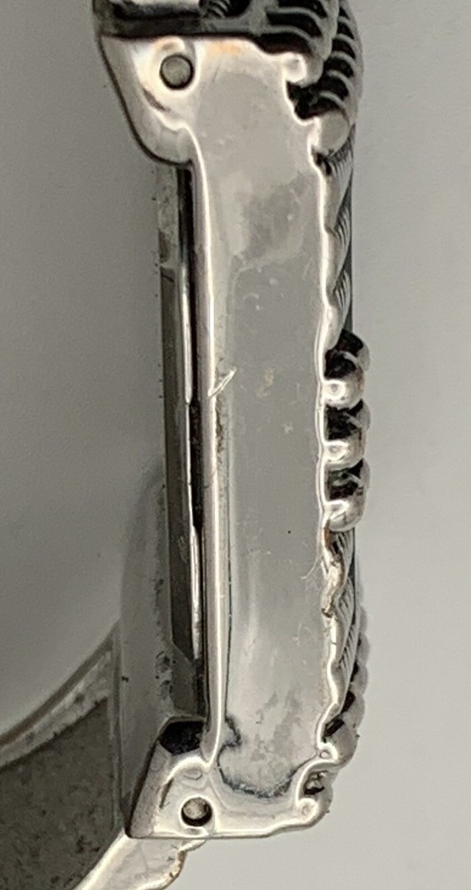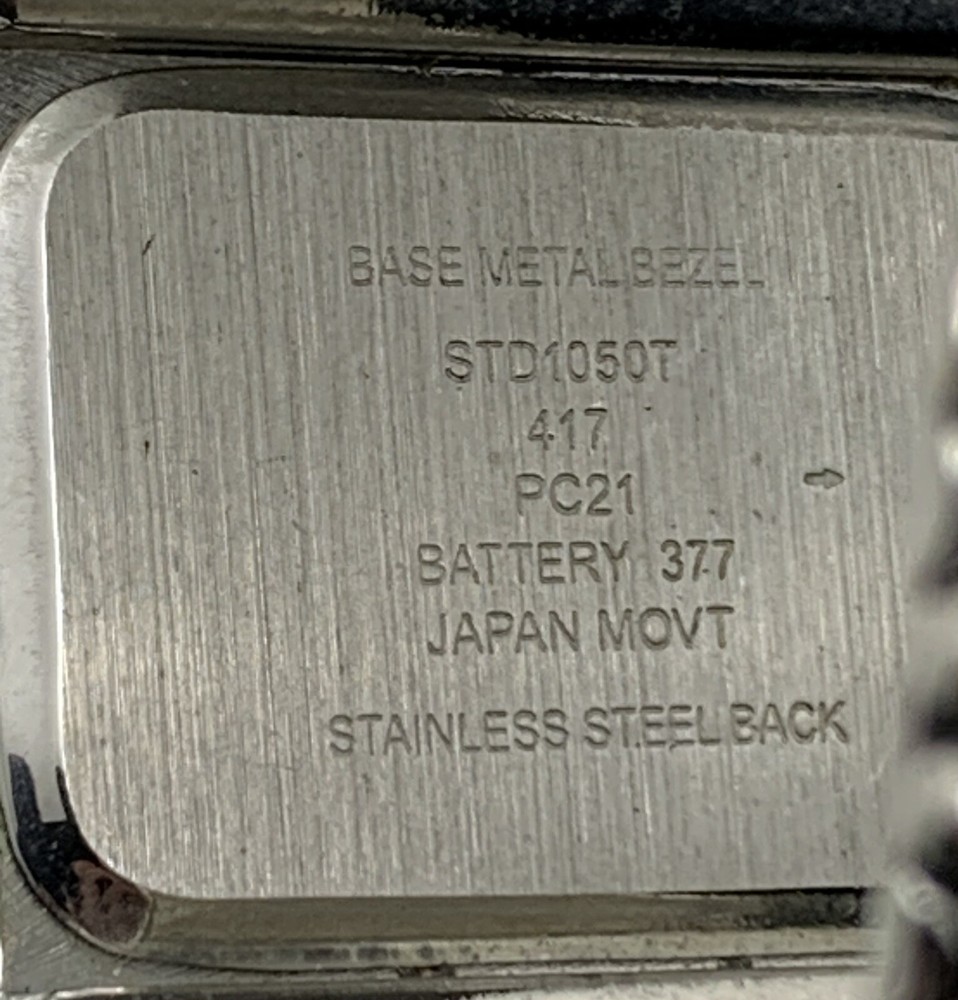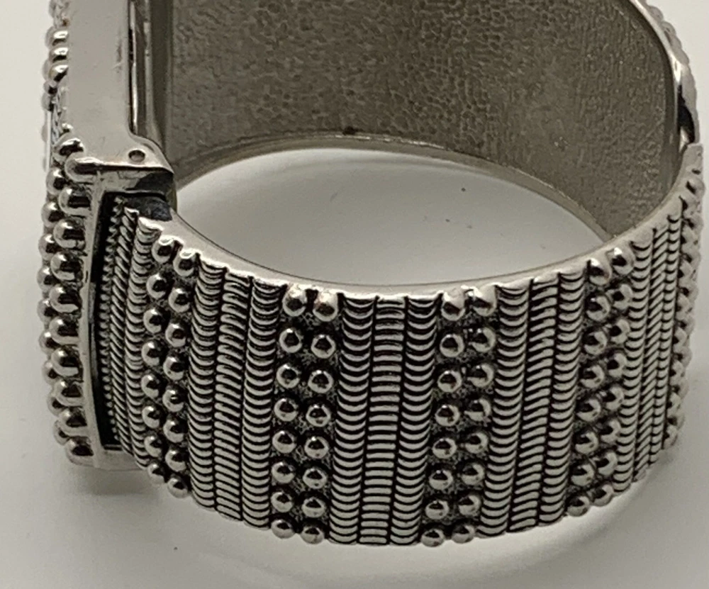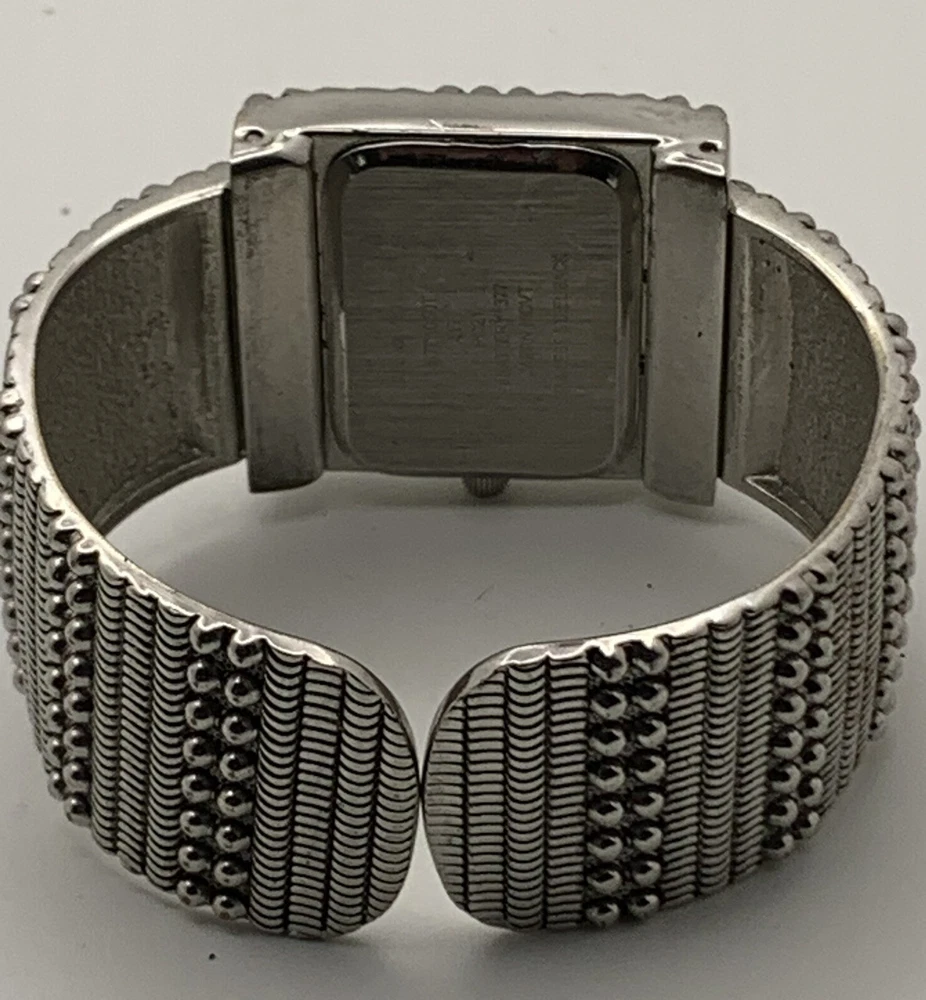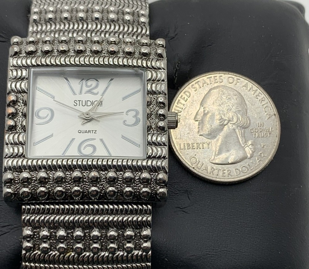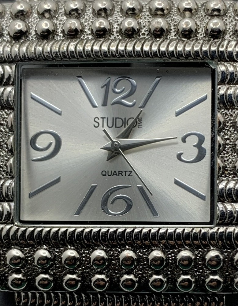 This Studio Time ladies watch is stylish and functional for any outfit. The watch has a large silver-tone cuff with cream bezel and studded details, and a solid silver dial with Arabic and Baton indices. The band/strap is made of silver metal. The watch features a quartz movement and a seconds hand, and is not water resistant. It was manufactured between 2010-2019 and comes without papers, service records, original box/packaging, or manual/booklet. Very good pre-owned condition. It has some slight scratches on the side of the bezel but nothing distracting. Please view the item specifics and photos; email me any questions. Thank you for visiting.