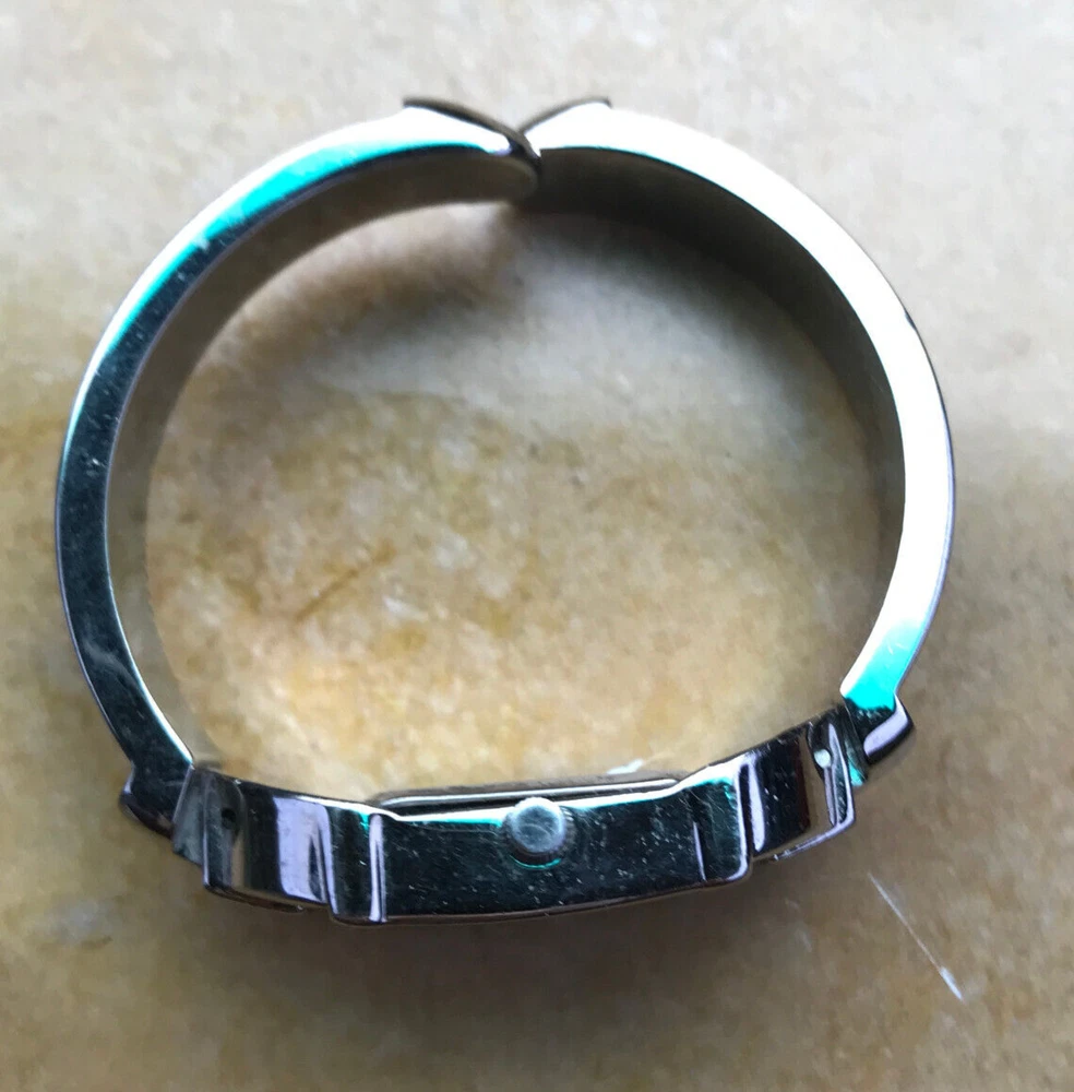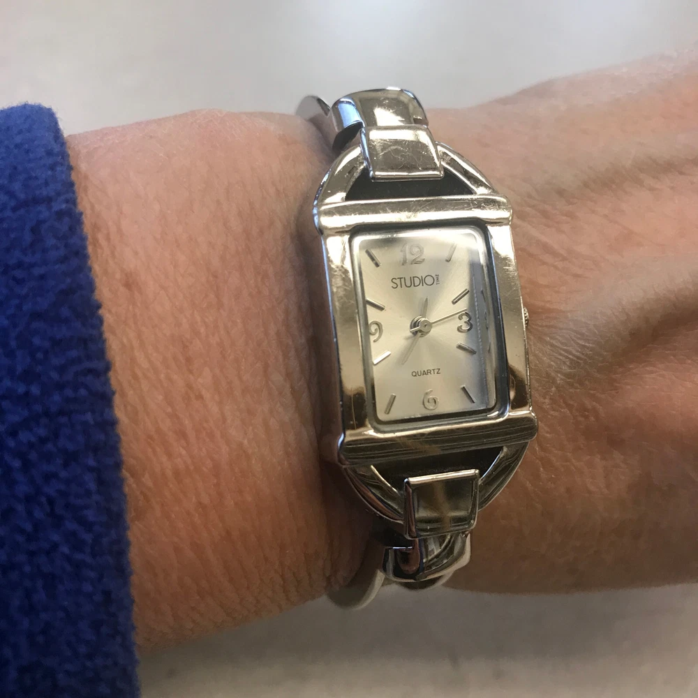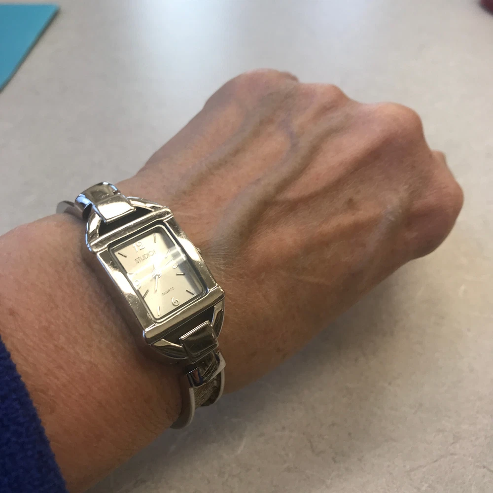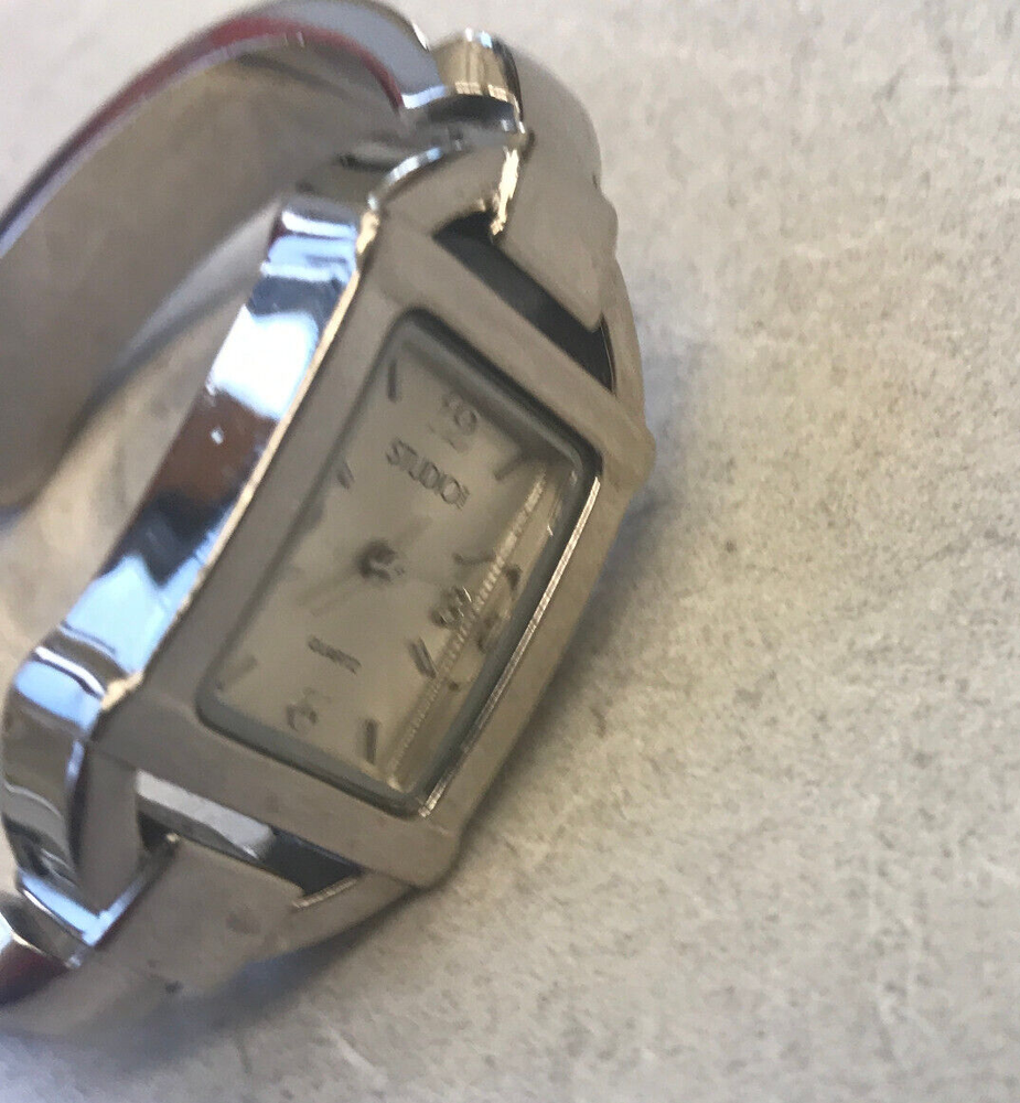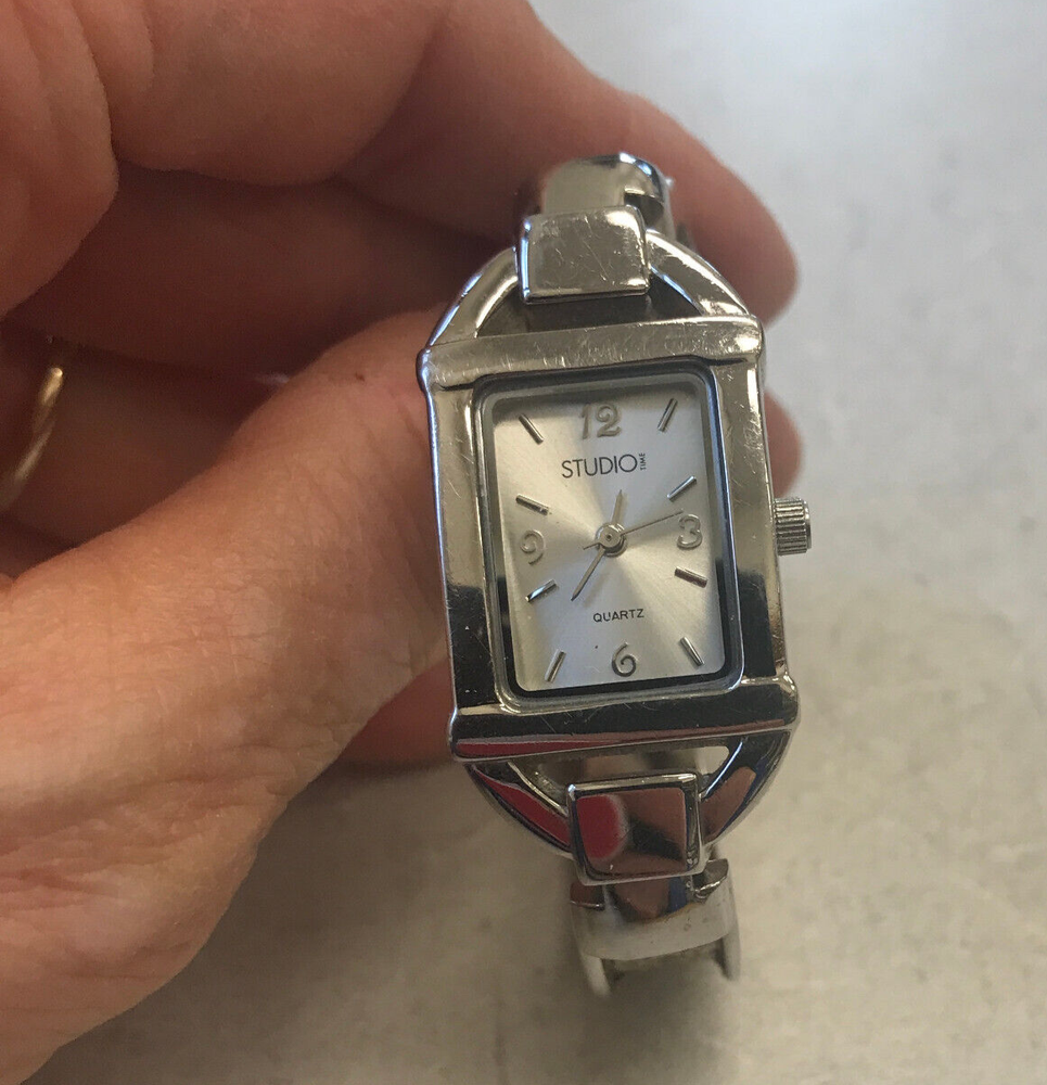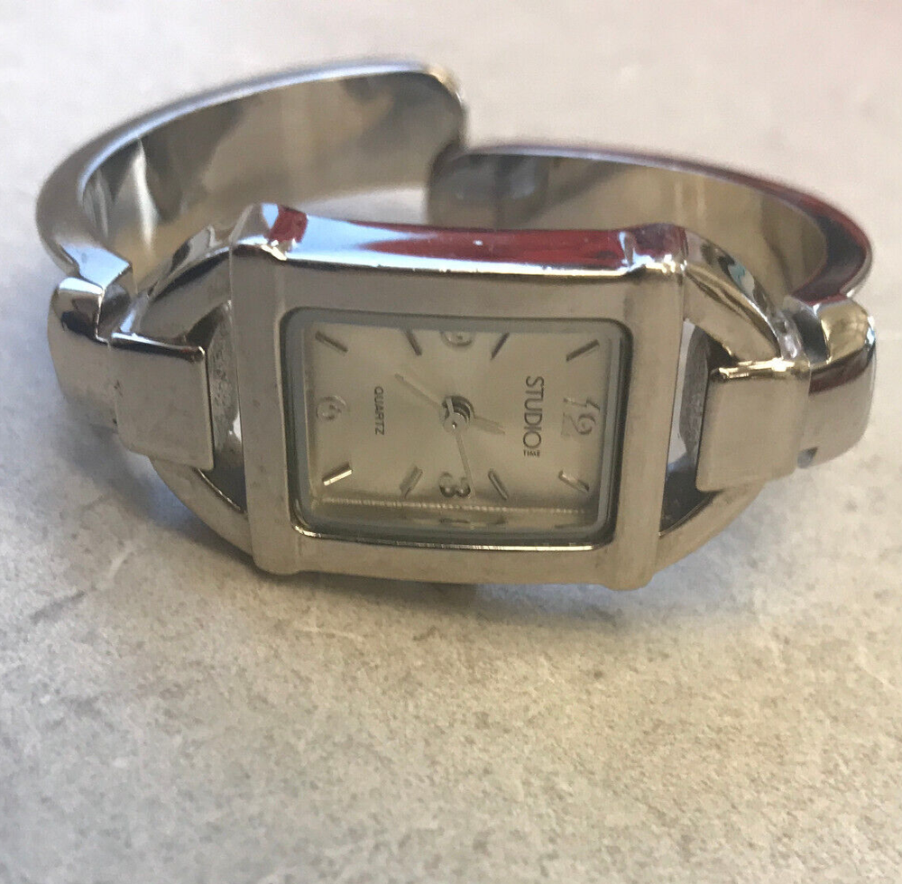 STUDIO TIME Wrist Watch rectangular women's bracelet style with gold-tone design on cuff silver tone with mother-of-pearl inlay and model STD2582 325 PC21 stainless steel back base metal bezel quartz movement/Japan NEW 377 BATTERY Works Great but *PLEASE NOTE*: watch seems to run continuously, so battery will be placed just before the watch is shipped. some cosmetic wear, scratches (please see photos)