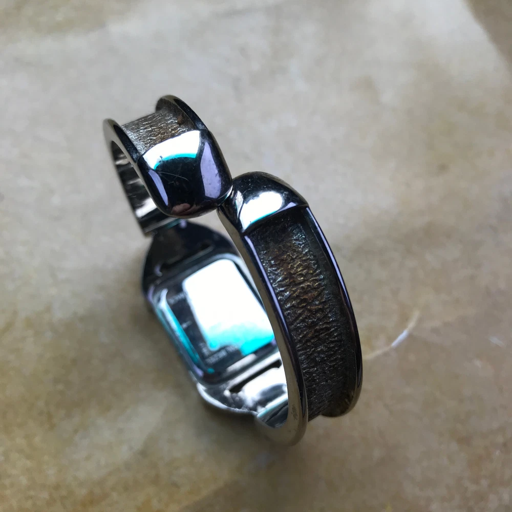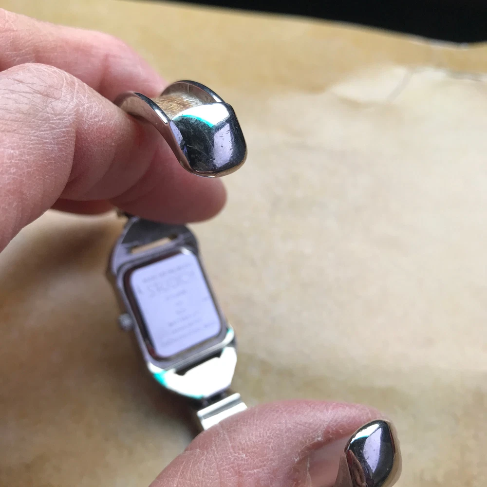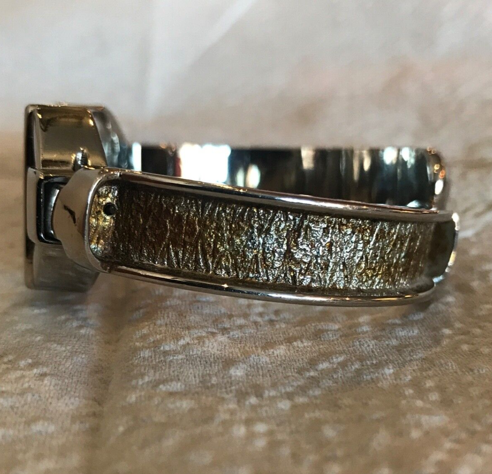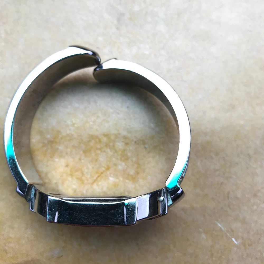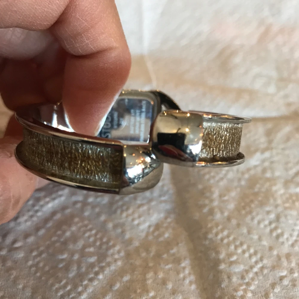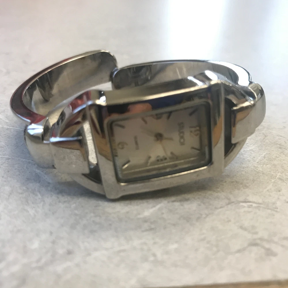 STUDIO TIME Wrist Watch rectangular women's bracelet style with gold-tone design on cuff silver tone with mother-of-pearl inlay and model STD2582 325 PC21 stainless steel back base metal bezel quartz movement/Japan NEW 377 BATTERY Works Great but *PLEASE NOTE*: watch seems to run continuously, so battery will be placed just before the watch is shipped. some cosmetic wear, scratches (please see photos)