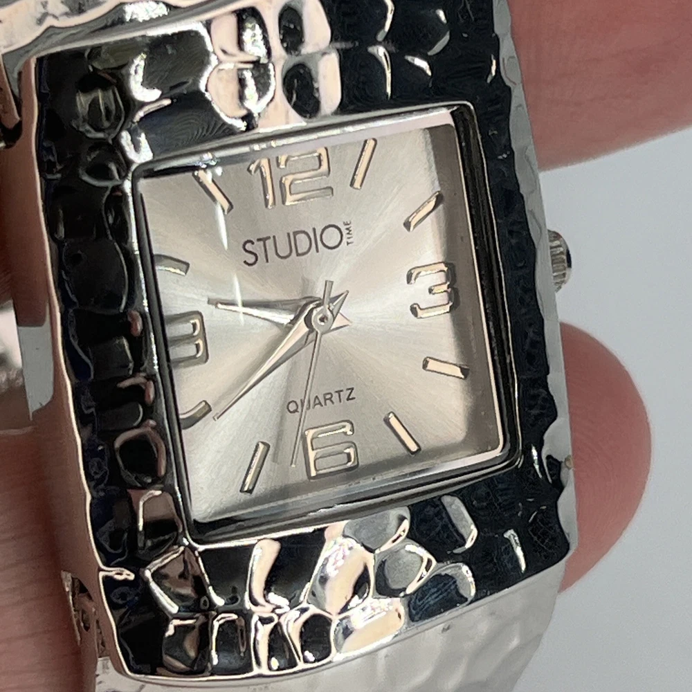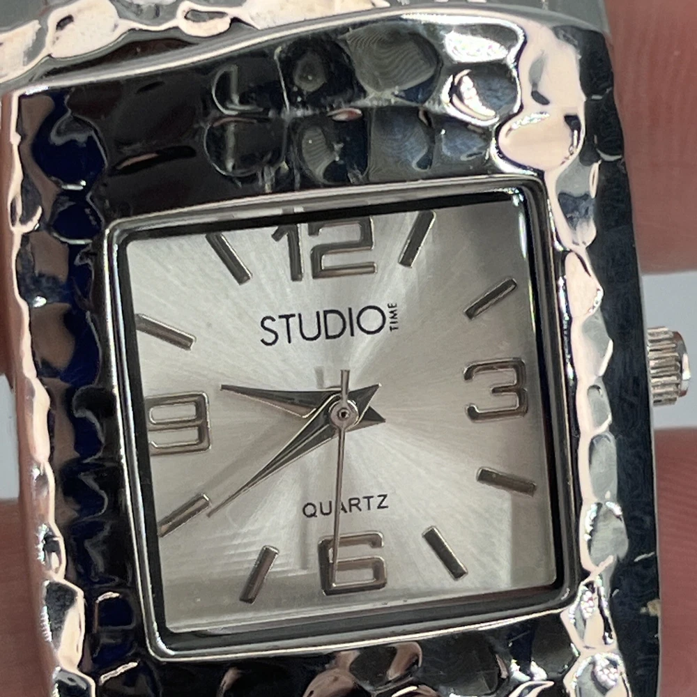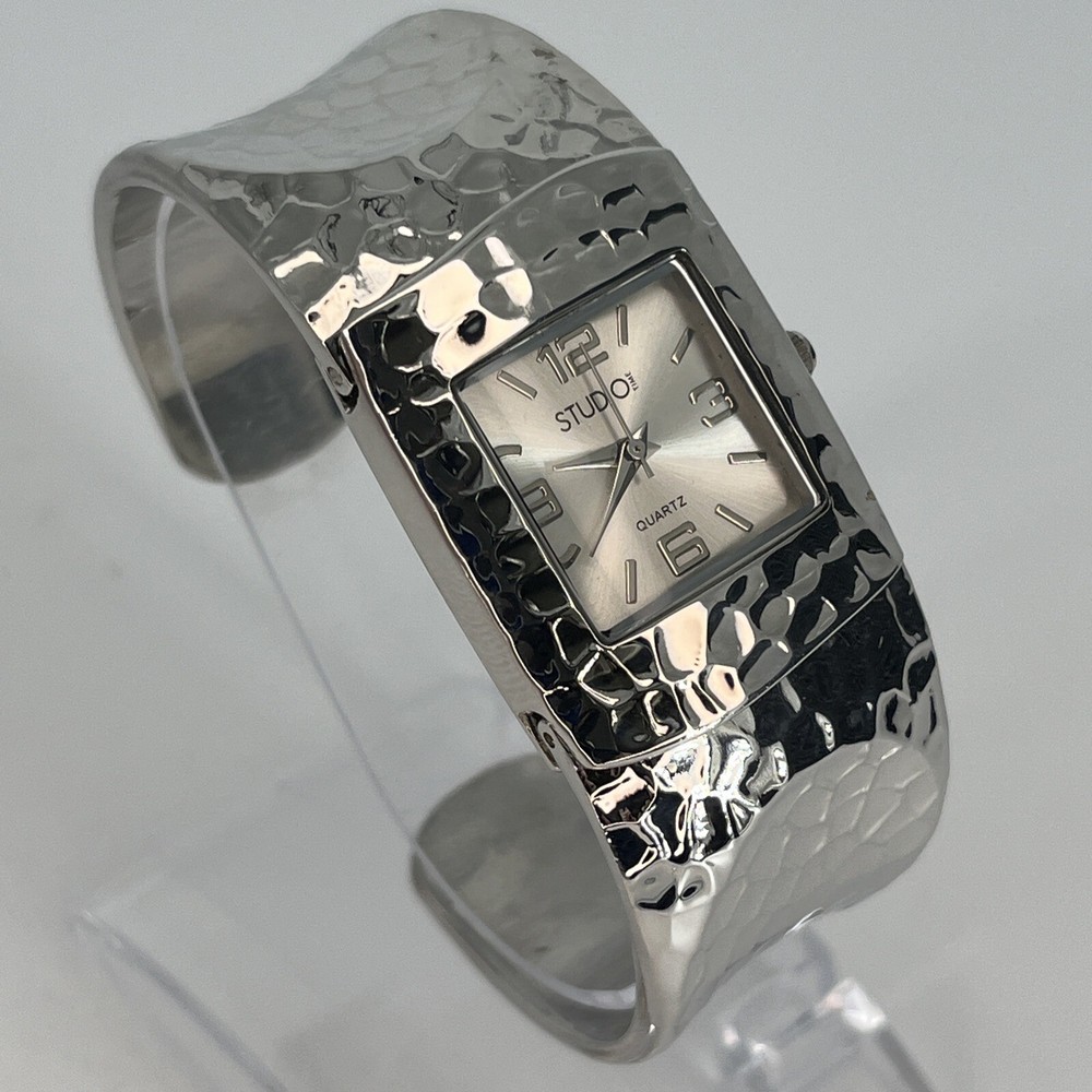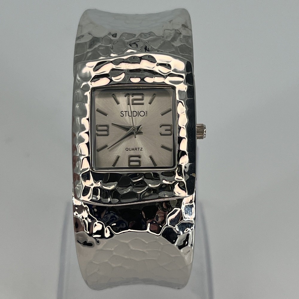 STUDIO TIME Women's Watch Hinged Shiny 6” Hammered Wide Hinged Cuff NEW BATTERY This is a pre-owned watch. Please review all pictures for condition. All watches are tested for functionality, which includes installing a new battery. Key Dimensions: Wrist Size 6 Inches Case Width 27 mm Band Width 25 mm Please feel free to message any questions about the watch or any additional info or pictures you would like. Always happy to help! :)