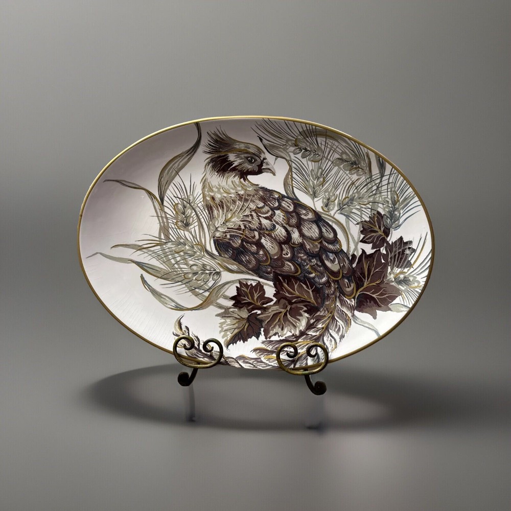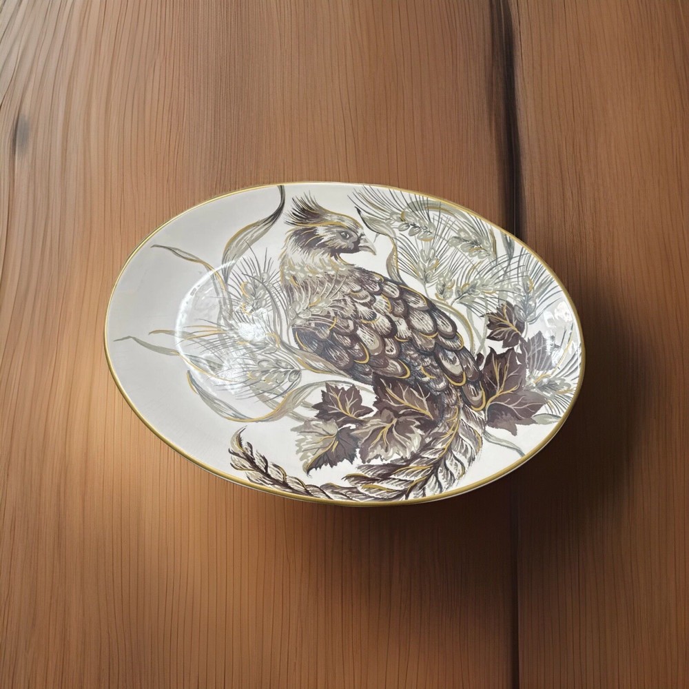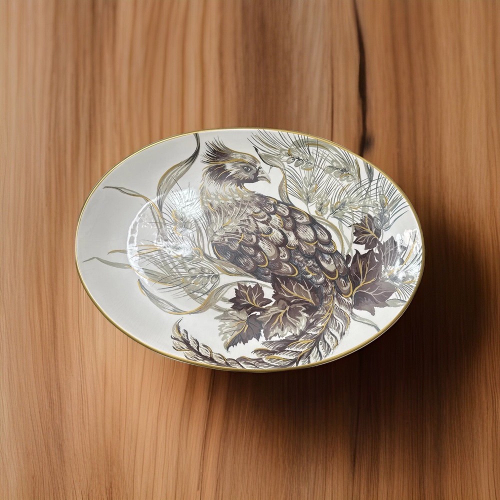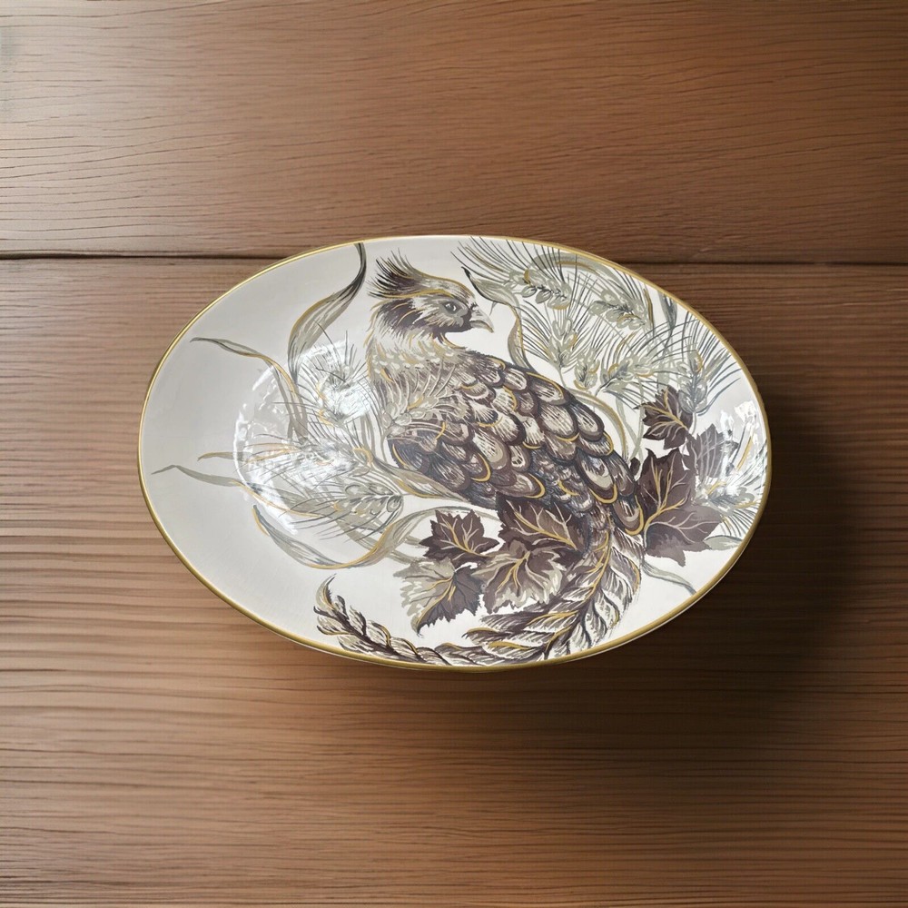 This beautiful large oval platter from Pottery Barn is a must-have for any American-style decor enthusiast. The classic brown and white color scheme and glossy finish make it a stunning addition to any table or display. Crafted from high-quality porcelain, this platter is both decorative and functional, perfect for serving up your favorite dishes. Measuring at 18.5 inches in length and 13.25 inches in width, this platter is lightweight at just 3lbs8oz and dishwasher safe for easy cleaning. Its production technique is pottery, and it has a printed backstamp. This original Pottery Barn platter is sure to impress your guests and add a touch of elegance to your home.