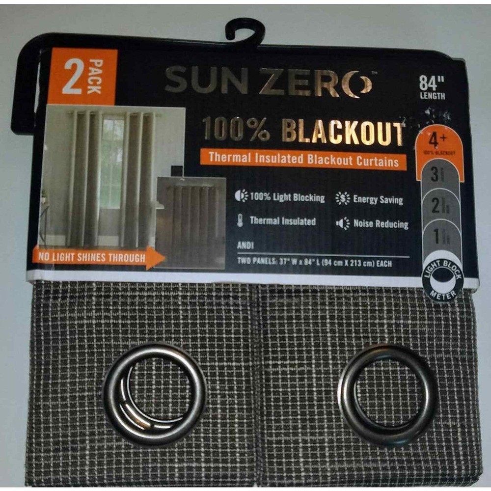 <![CDATA[<div>SUN ZERO 100% Blackout Panels Brown Checked Thermal Insulated Noise Reducing 84" 2 Panels Andi Carob Grommet Top Pin Check Textured Fabric! 100% Polyester Thermal Lining 100% Light Blocking Blackout Noise Reducing Energy Saving Measures 37" W x 84" L Care: Washable New in Package