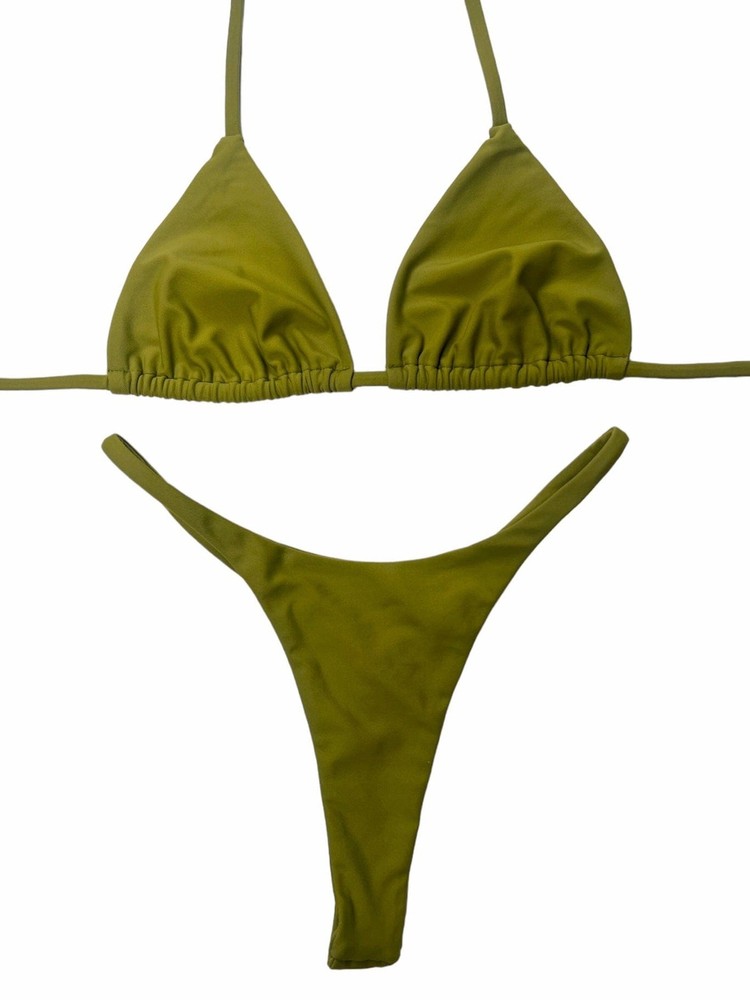 Sage Green Seamless Triangle Top & Dipped Seamless Thong Bottom Bikini Sage Green Seamless Triangle Top & Dipped Seamless Thong Bottom Bikini Introducing the epitome of summer elegance and carefree luxury – our Sage Green Seamless Triangle Top & Dipped Seamless Thong Bottom Bikini. Crafted meticulously to cater to the discerning tastes of women, this bathing suit encompasses both comfort and style, ensuring you look stunning whether lounging by a glittering pool, walking on golden sands, or enjoying the exclusive ambiance of a yacht. The bikini features an innovative seamless triangle top that enhances your natural silhouette while providing optimal coverage and support. The adjustable ties at both the neck and back allow you to customize the fit to your physique, ensuring maximum comfort throughout the day. Coupled with removable padding, this design not only offers versatility but also the promise of a flattering look tailored yet effortlessly chic. Our thong bottom is designed to promote confidence and freedom, with a g-string like rear coverage that guarantees minimal tan lines. This design element makes it perfect for the beach, yacht, pool party, and resort vacation, allowing you to achieve a seamless tan while indulging in sumptuous sunbaths or playful waterside activities. The luxury fabric selected for this swimsuit is lightweight and breathable, giving it a barely-there feel while ensuring quick drying after a dip in the ocean or pool. Available in a beautiful shade of sage green and various other captivating colors, like Ginger Orange, White, Black, Red, Tan, and Gray, this swimsuit caters to diverse tastes and preferences. Sizes range from XXS to XXL, making it accessible for every woman wanting to elevate her swimwear collection. Fully lined for your comfort and peace of mind, each piece promises a secure and soft fit against your skin. This luxury women’s bathing suit not only sets the bar high for beachside fashion but also invites you to embrace your inner goddess. It’s time to be bold, beautiful, and beat the heat in style. Don’t miss out on this exquisite blend of form, function, and fashion - a true staple for any summer wardrobe. Dive into elegance; your ideal swimwear is just a click away.