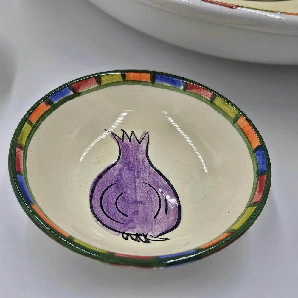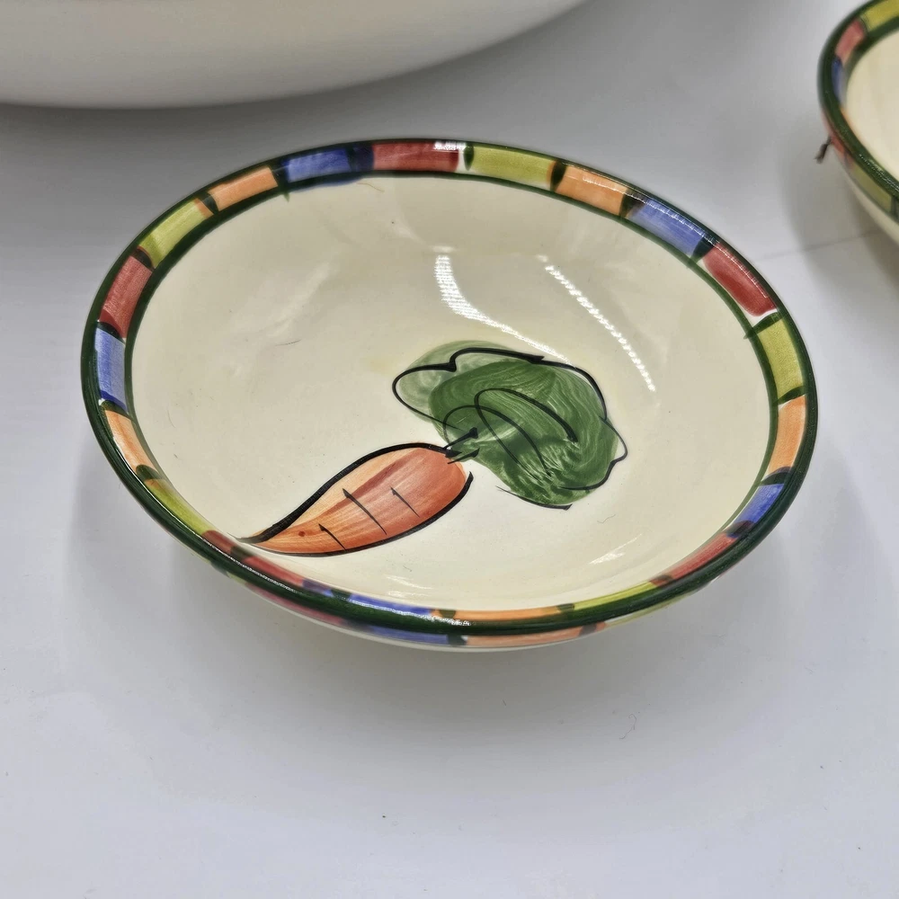 Salad For 4, Vintage Ceramic Large Salad Bowl Vinegar & Oil Decanters and 4 Mini Dip Bowls. No Cracks or Chips and is in Excellent Pre-owned Condition.