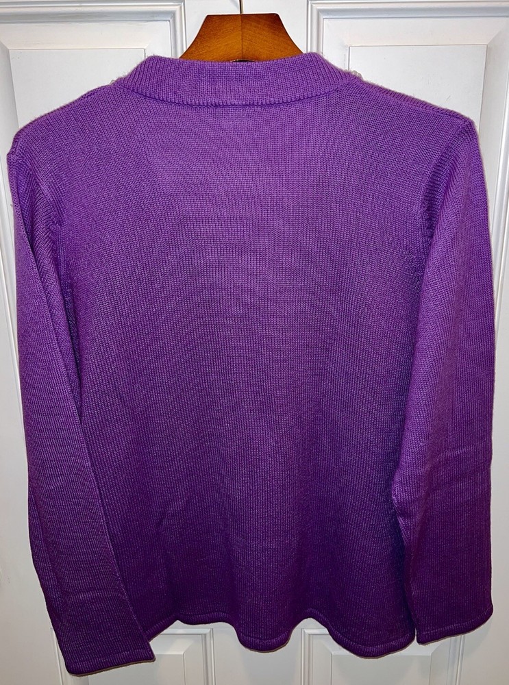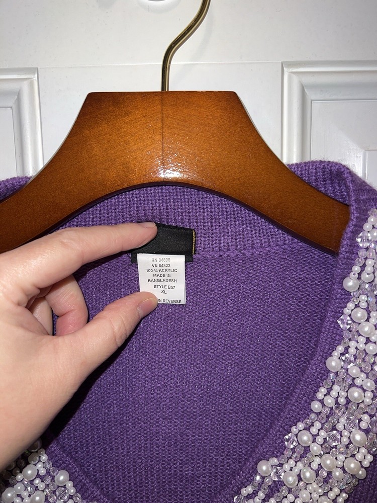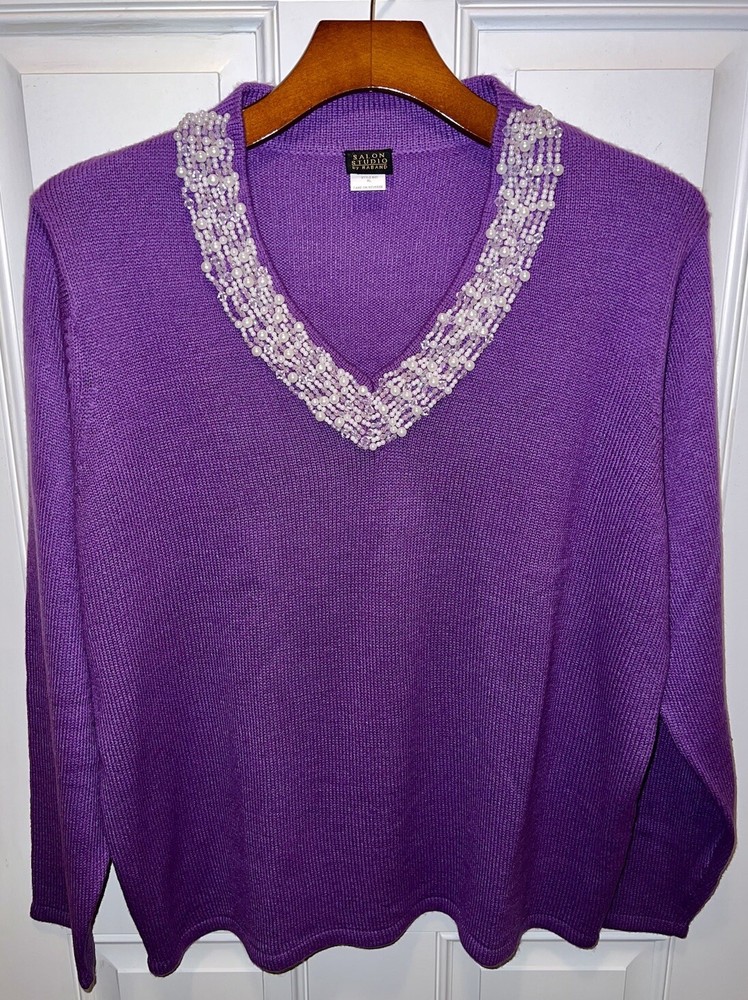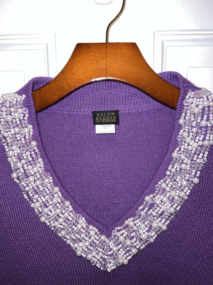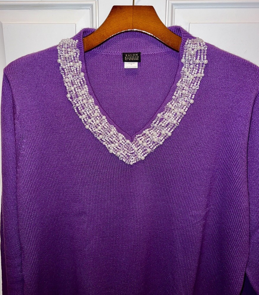 Item: Women’s Sweater With Beaded Neckline Brand: Salon Studio by Haband Material: 100% Acrylic Size: XL Fit: Regular Sleeve Length: Long Sleeve Color: Purple Pattern: Solid Occasion: Business/Casual 27” Top of back of shirt to bottom of back of shirt 25” Armpit to armpit Item is in gently worn used condition. There are no obvious defects. All reviews are greatly appreciated and helpful in building my business. Thank you.