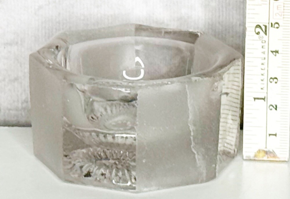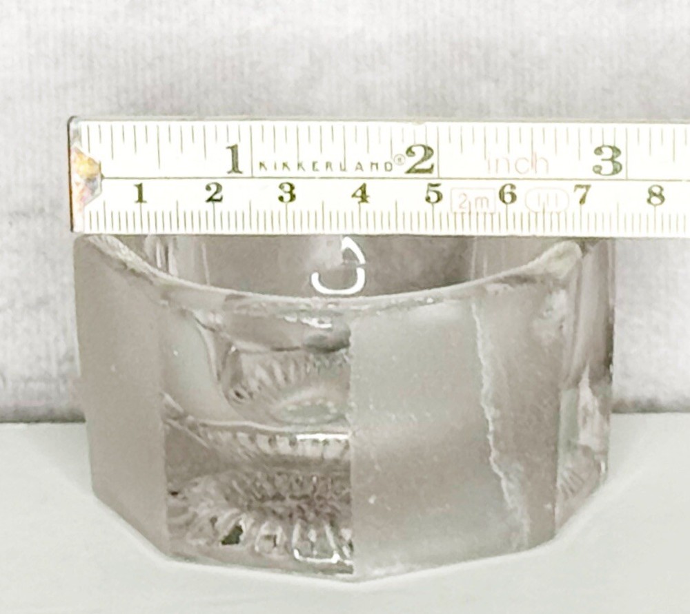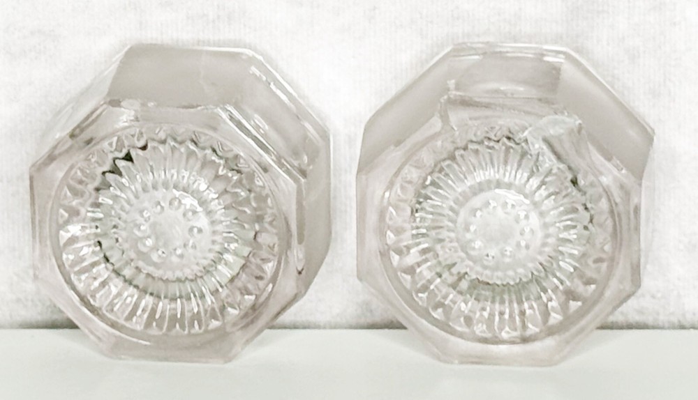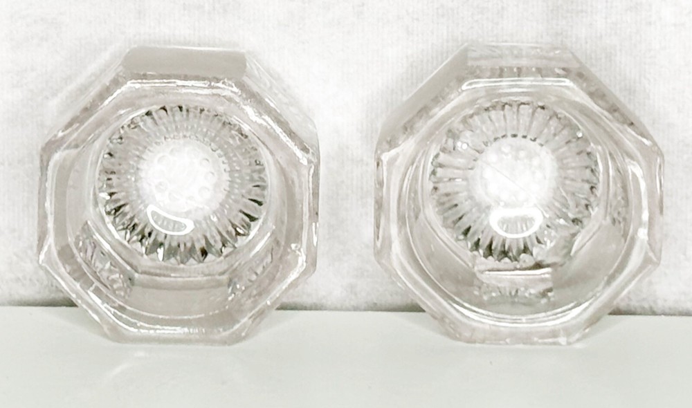 Add some vintage charm to your kitchen with this set of two octagonal clear and frosted glass salt cellars. These mid-century modernism style open salt dishes are perfect for all occasions and feature a small size of 3 inches in width and 1.5 inches in height. Crafted from durable glass material, these dishes are easy to fill and dishwasher safe for hassle-free cleaning. The set comes with two items, and the clear finish adds a touch of elegance to your dining table. Ideal for food and drink enthusiasts, these salt cellars are a must-have addition to your collection. These salt cellars are in excellent used condition. There are light scratches on the bottom from normal wear. Please check out the other unique items listed in our eBay store. We are happy to combine shipping, when possible.