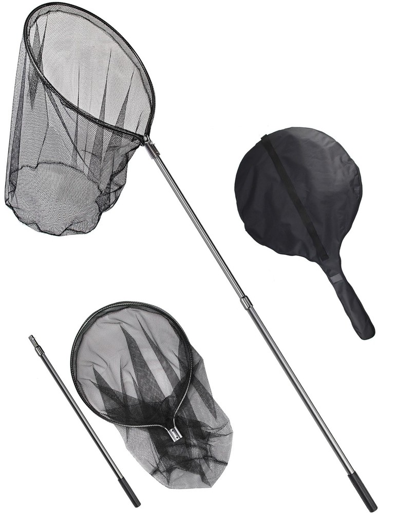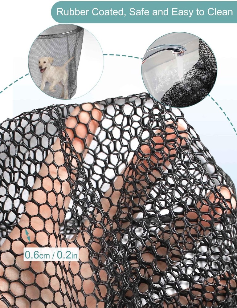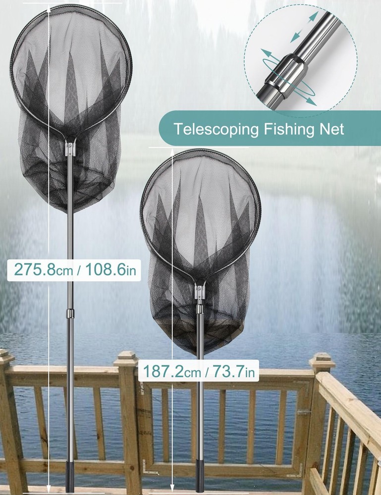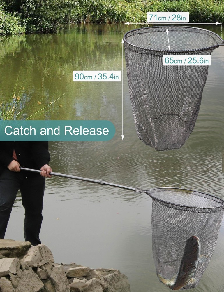 Catch Net Fish Net Large Retractable Fishing Net: Expanded size of fishing net is 74inch in length, can fully expend to 109in. The mesh frame of landing net is 28x26in. Telescoping Fishing net long handle can adjusted for different fishing trip, suitable for offshore fishing, inshore fishing and saltwater fishing. Fishing Nets for Saltwater: Made of aluminum alloy, lightweight but durable, can be used as salmon fishing net, kayak fishing net and boat net. Rubber Fishing Net: Rubber coated mesh perfects for catch and release, prevents hurting fish, animals and easily clean up and maintain. 35.4inch depth, landing nets for fishing is large, heavy duty enough for saltwater fishing. Kayak Dip Net for Fishing: Large fishing net long handle packed in carrying bag. First remove the screw on handle, press the button and push the handle to connect the frame, place screw on joint for locking. Animal Net Catcher: Small and safe mesh holes, can be your useful net tool to manage your farm as cat net catcher trapping net.