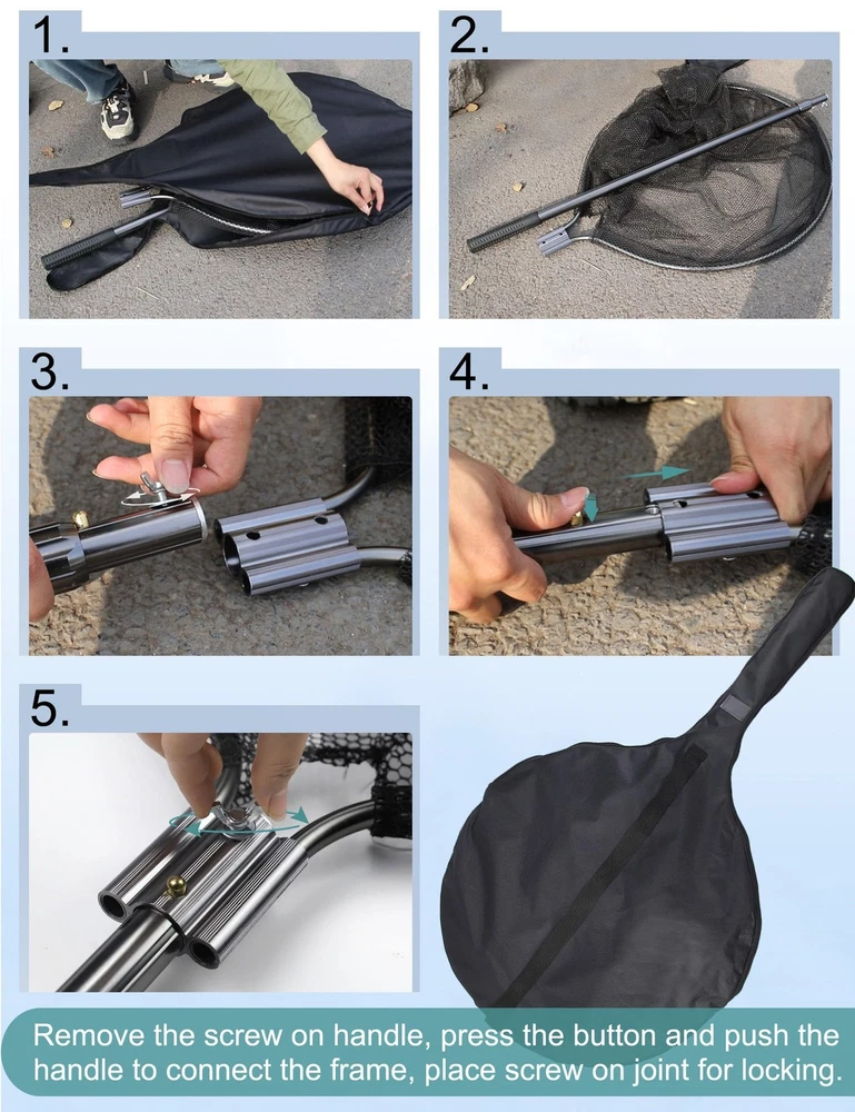Catch Net Fish Net Large Retractable Fishing Net: Expanded size of fishing net is 74inch in length, can fully expend to 109in. The mesh frame of landing net is 28x26in. Telescoping Fishing net long handle can adjusted for different fishing trip, suitable for offshore fishing, inshore fishing and saltwater fishing. Fishing Nets for Saltwater: Made of aluminum alloy, lightweight but durable, can be used as salmon fishing net, kayak fishing net and boat net. Rubber Fishing Net: Rubber coated mesh perfects for catch and release, prevents hurting fish, animals and easily clean up and maintain. 35.4inch depth, landing nets for fishing is large, heavy duty enough for saltwater fishing. Kayak Dip Net for Fishing: Large fishing net long handle packed in carrying bag. First remove the screw on handle, press the button and push the handle to connect the frame, place screw on joint for locking. Animal Net Catcher: Small and safe mesh holes, can be your useful net tool to manage your farm as cat net catcher trapping net.