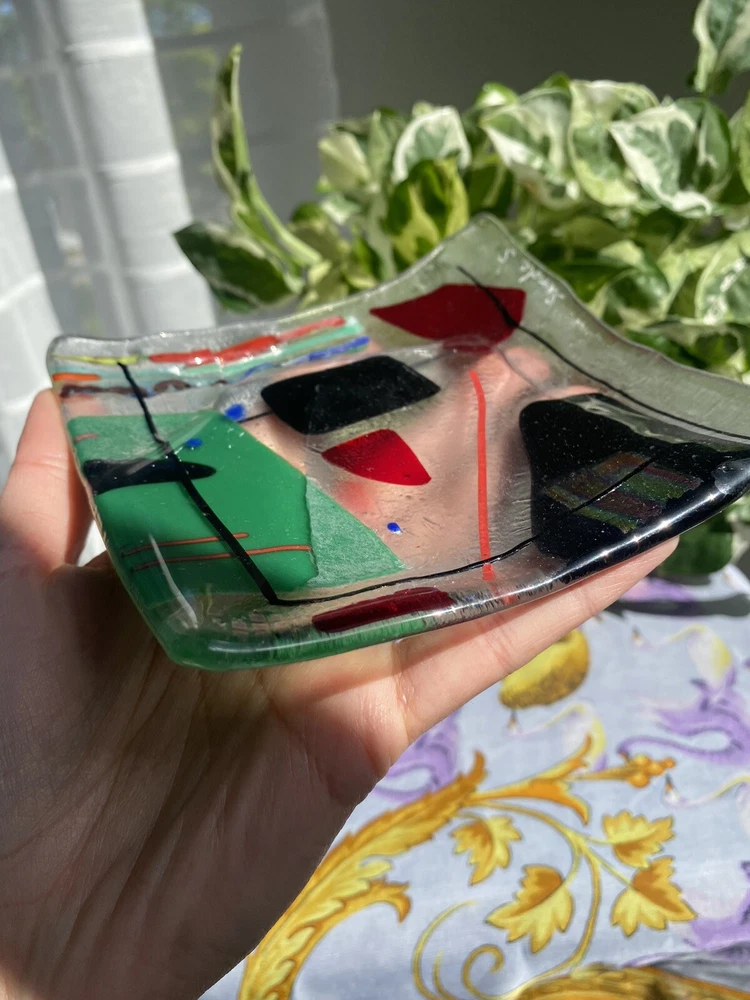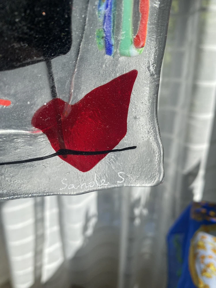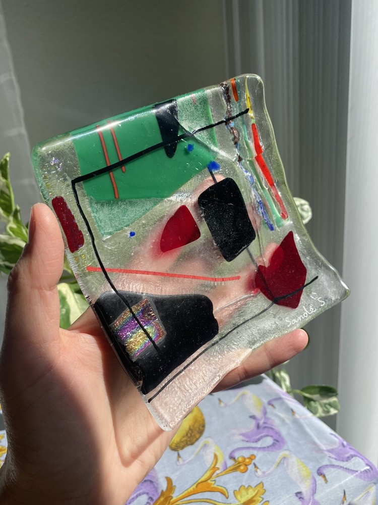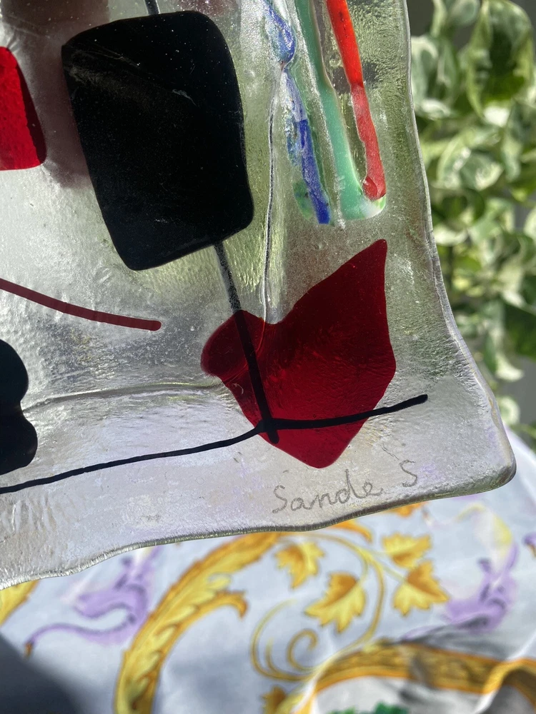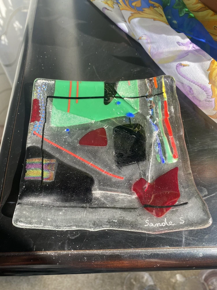 Sandi Sande S Signed Art Studio Hand made Modernist Color Trivet Plate Staples. Beautiful arrangement of colors and textures in one small art glass trivet platter. Dichroic parts are really eye catching. Photos don’t do justice. Please see all the photos as they’re a part of the description. Approximately 5.2” x 5”. Shiny and matte mix very unique. Don’t miss it