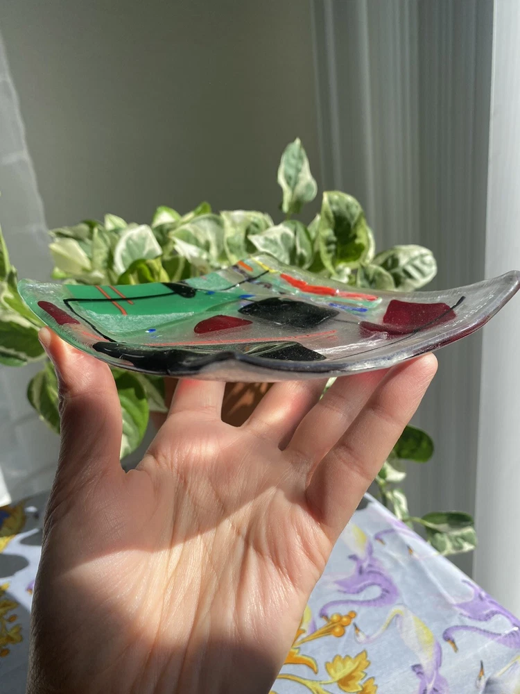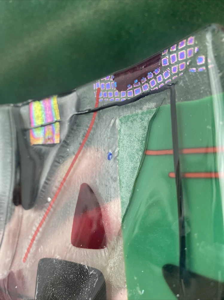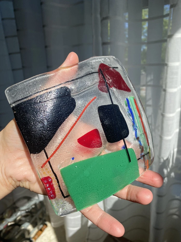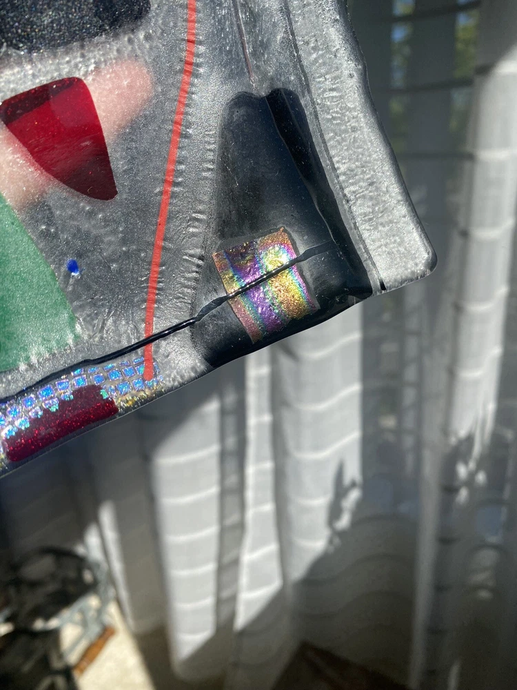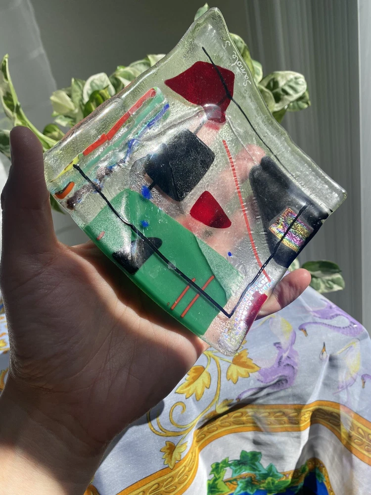 Sandi Sande S Signed Art Studio Hand made Modernist Color Trivet Plate Staples. Beautiful arrangement of colors and textures in one small art glass trivet platter. Dichroic parts are really eye catching. Photos don’t do justice. Please see all the photos as they’re a part of the description. Approximately 5.2” x 5”. Shiny and matte mix very unique. Don’t miss it