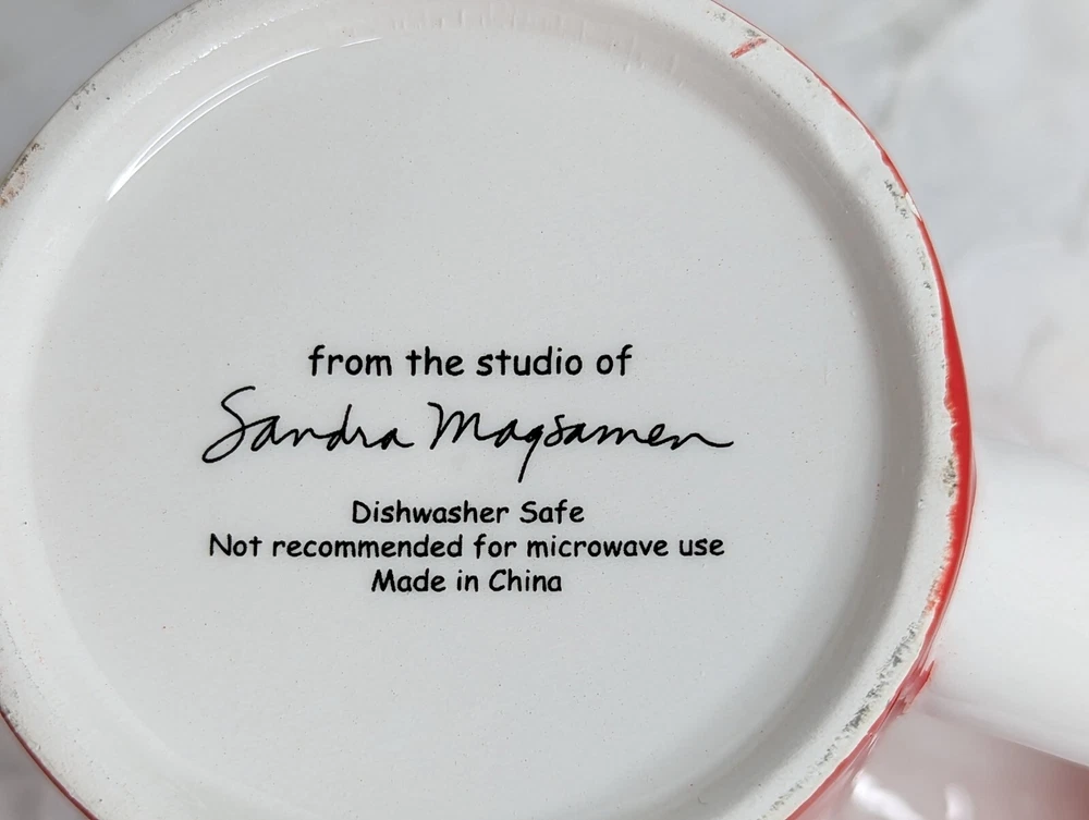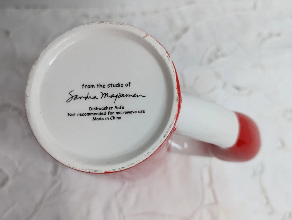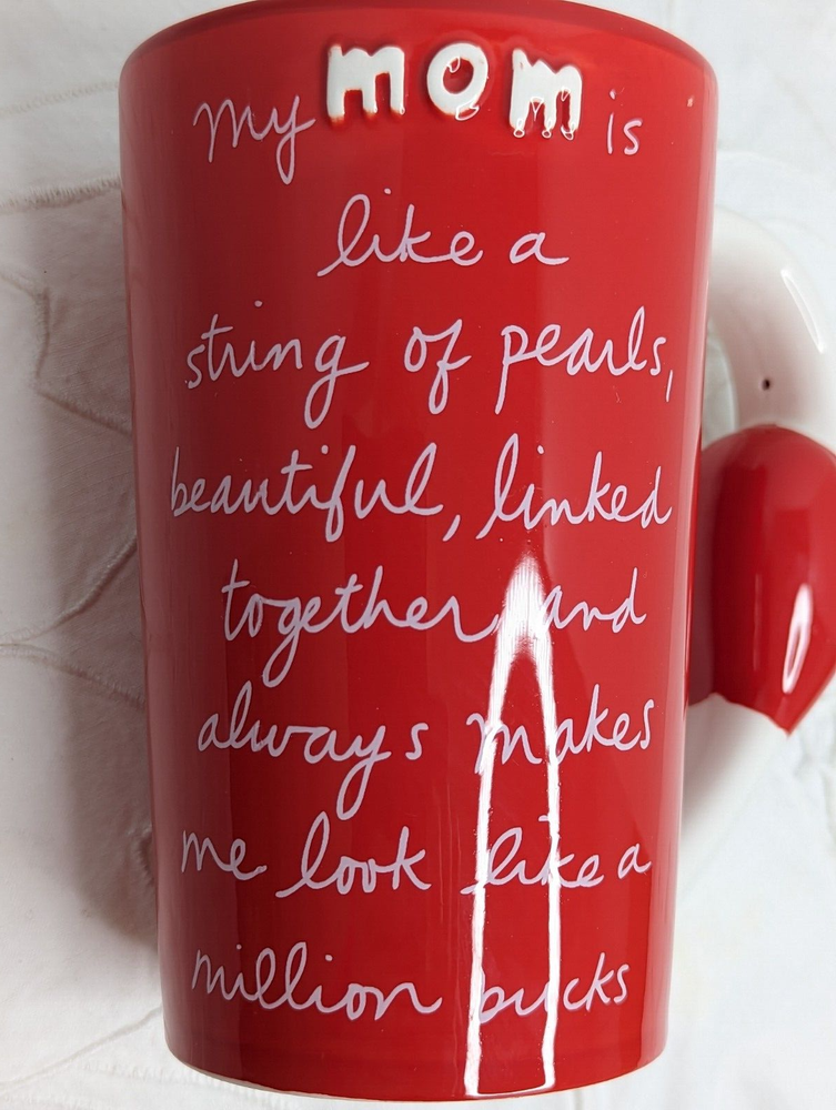 Sandra Magsamen Studio Coffee Mug Tea Cup My Mom Is Heart Handle Red White Gift. This great coffee mug is in very good condition, see note. NOTE: 1 very tiny chip along bottom edge (see pic # 4); 1 manufacturing blemish (pic # 3, right & up from "is"). It measures ap proximately 5.5" tall x 3.5" in diameter at top. See the pictures to verify the condition. <div style="text-align:center"><a style="text-decoration:none" href="httpss://mostpopular.sellathon.com/?id=AC1375651"><img src="httpss://www.sellathon.com/Resources/Images/countercredit.gif" border="0"></a></div>