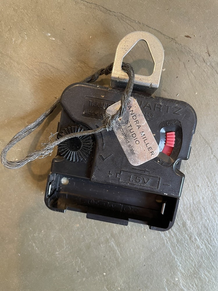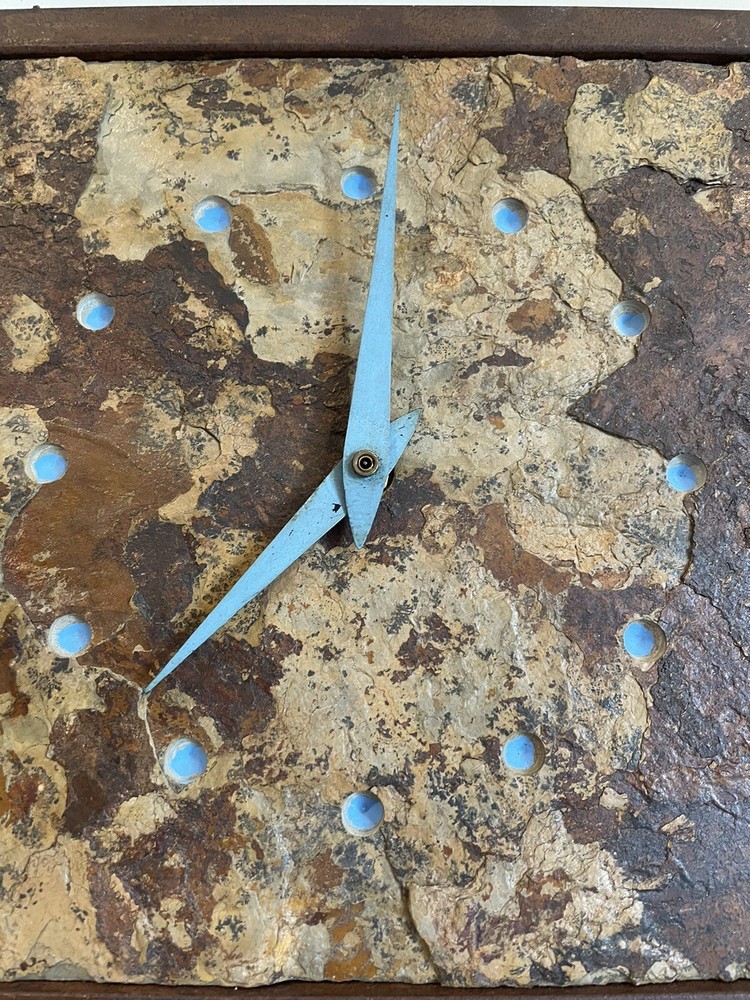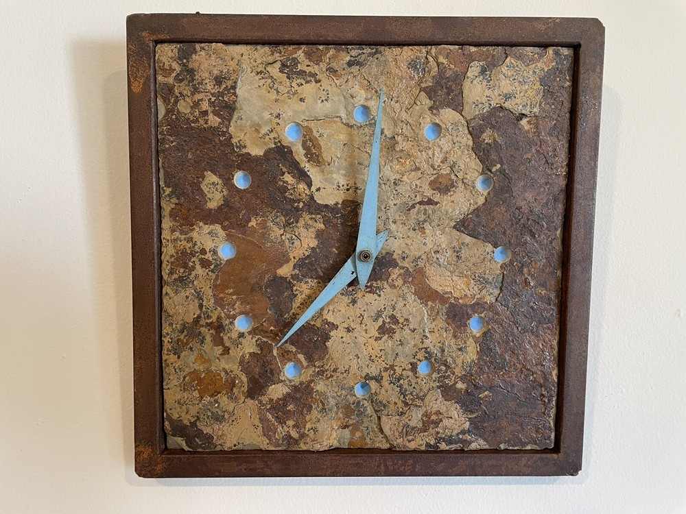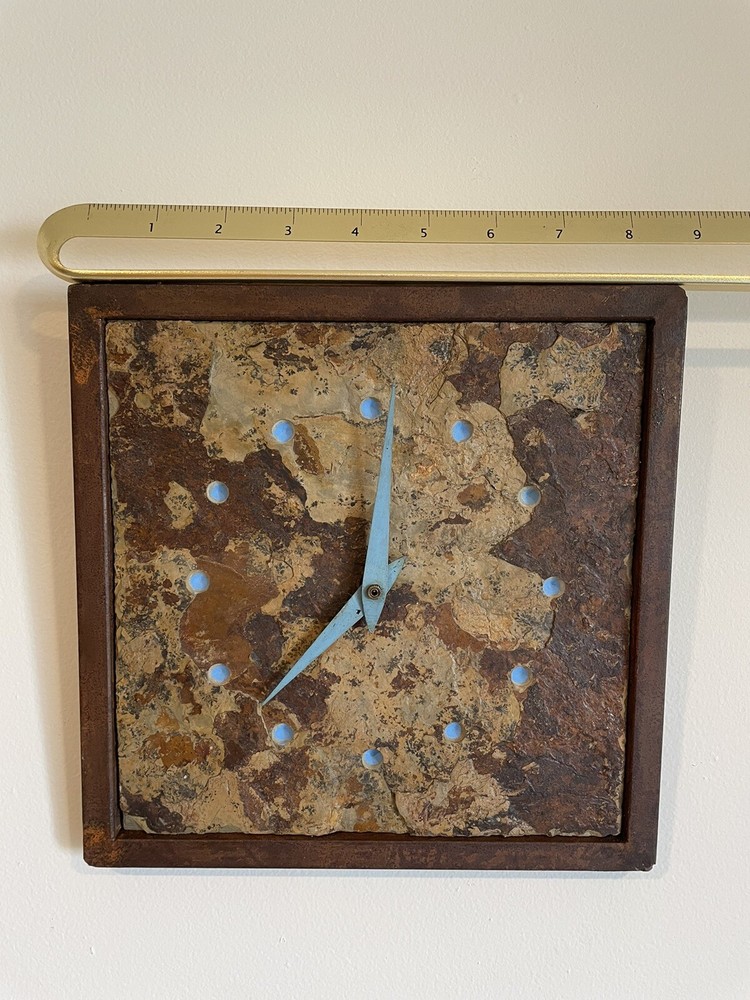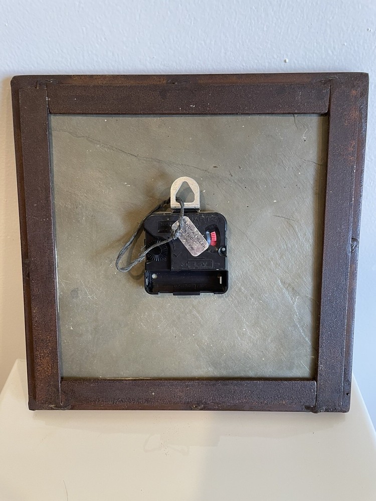 This vintage handmade wall clock by Sandra Miller Studio is a unique addition to any home decor. Hand crafted from slate and iron, this clock is sure to catch the eye of your guests. The clock features a beautiful design that blends seamlessly with any style of home decor. Its brand value is enhanced by its handmade quality, making it a great conversation starter. Excellent condition, vintage patina. Measures 9β Square.