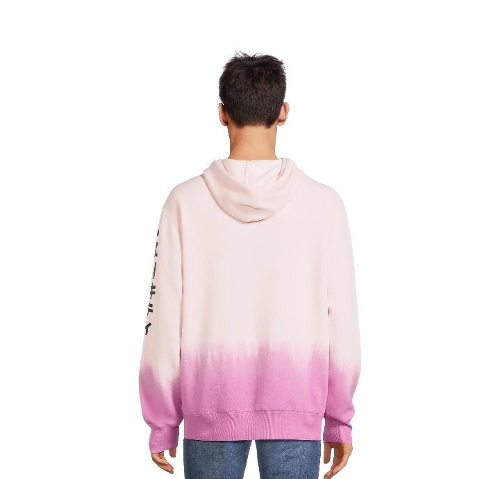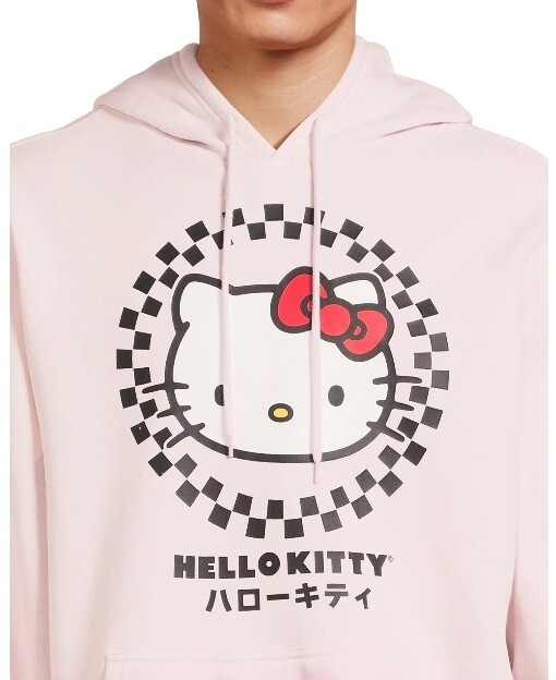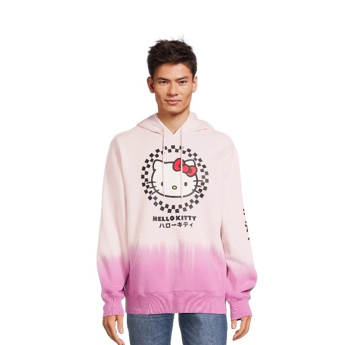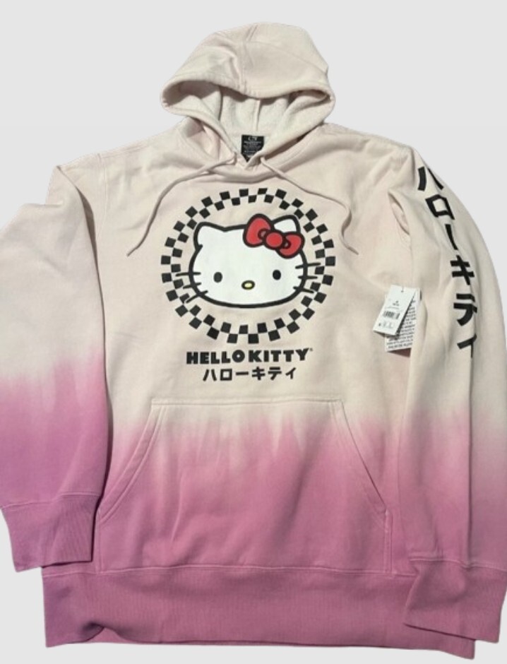 Stay warm and cozy in this Hello Kitty hoodie! This hoodie is officially licensed Hello Kitty apparel. It's made of 60% cotton and 40% polyester fleece for a comfort fit. It features a hood, drawstring neckline, cuffed sleeves, and a kangaroo pocket. It has a "dip dye" wash effect, fading from a light pink into a darker pink. The artwork features the image of Hello Kitty, with kanji writing on the sleeve.