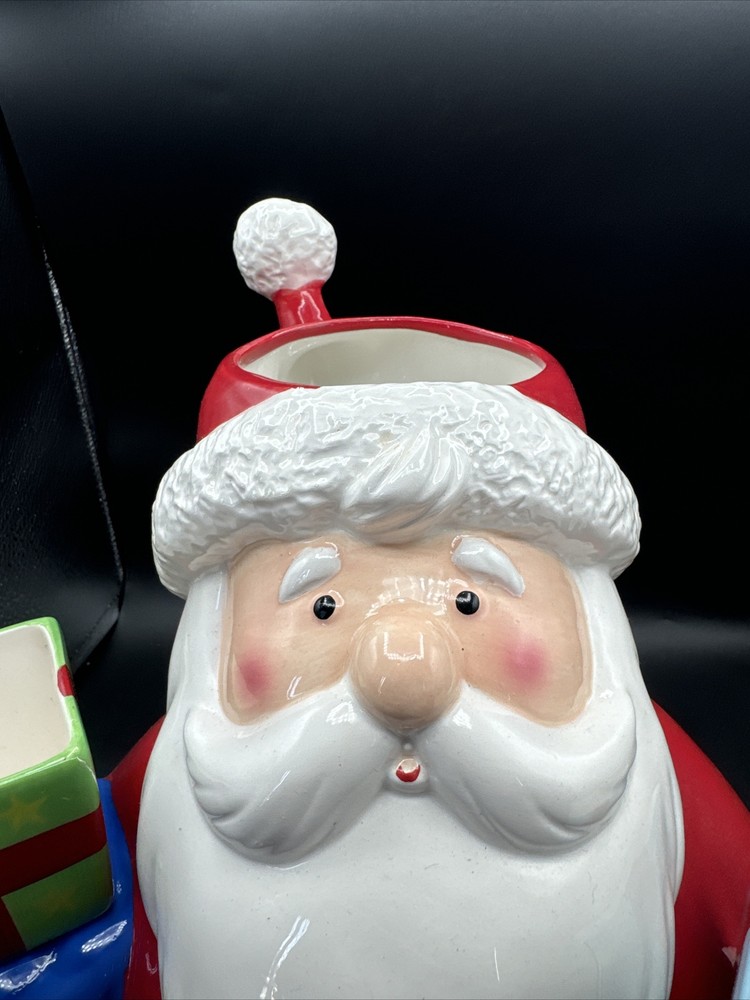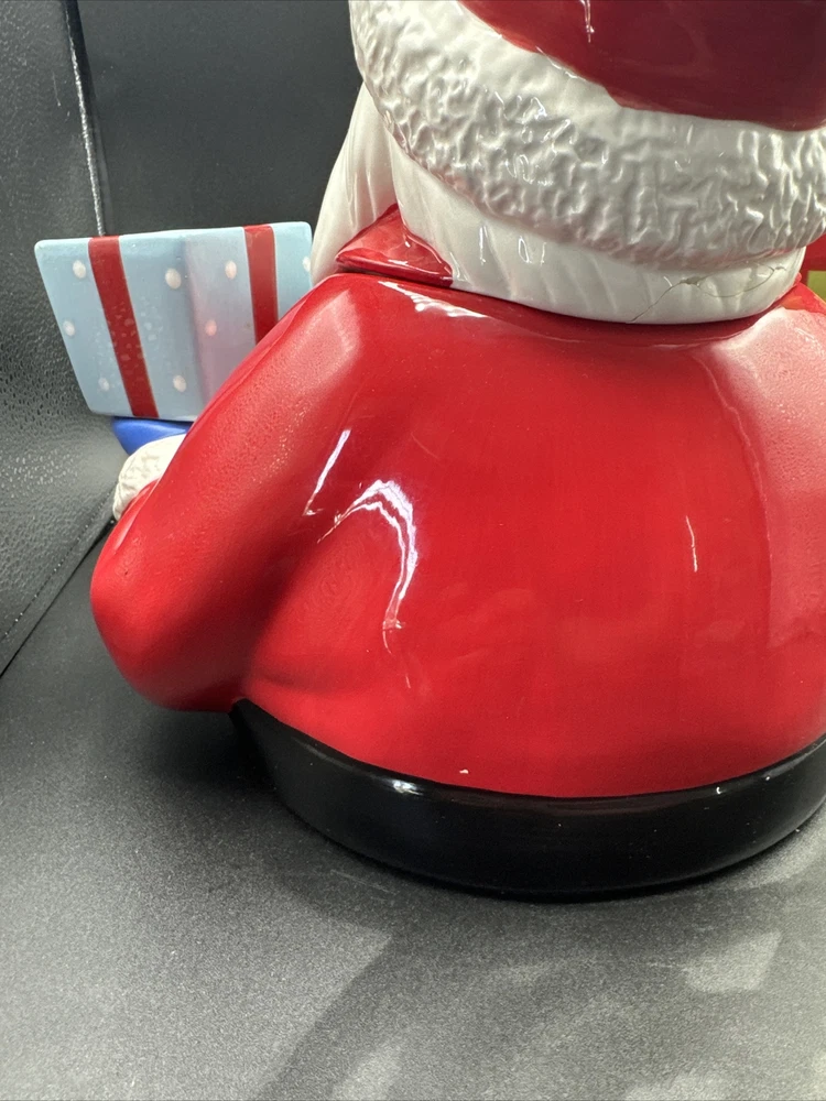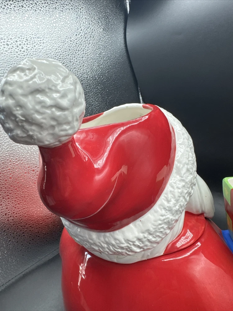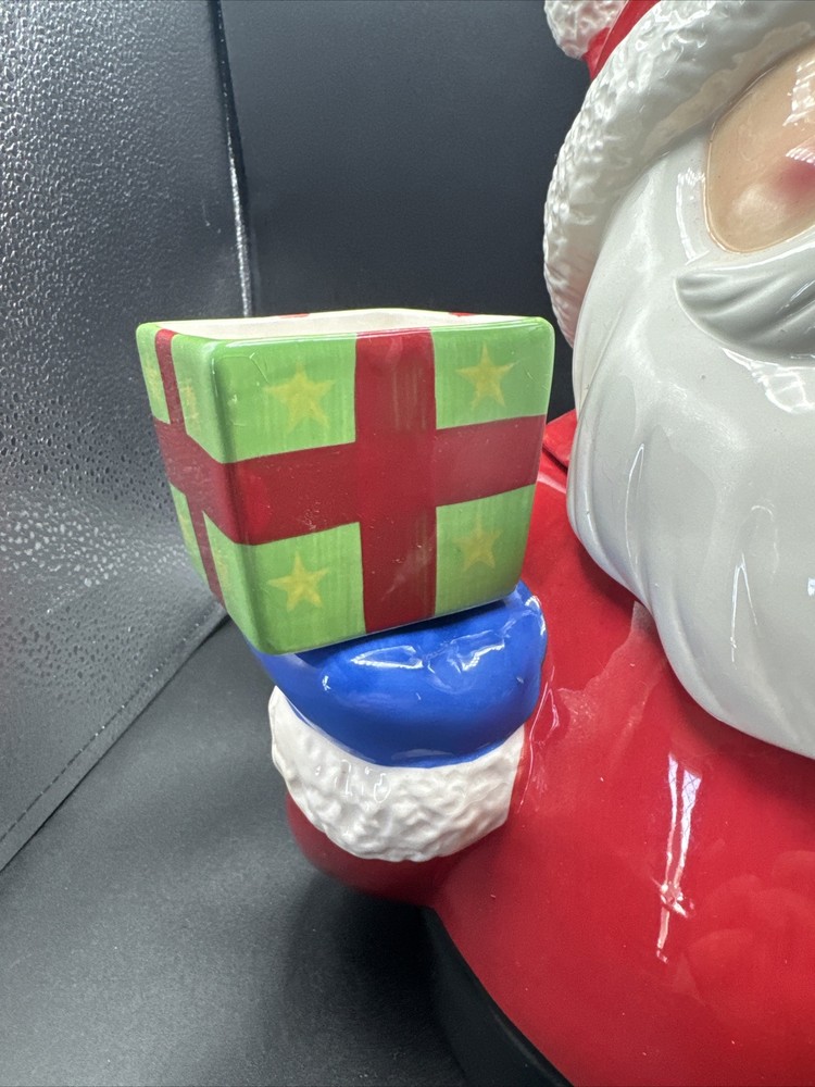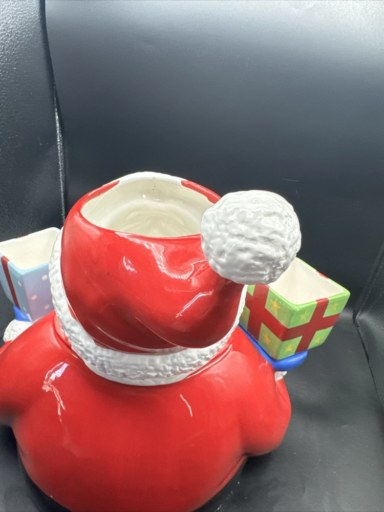 Add some festive cheer to your kitchen with this Santa Serves Holiday Goodies Cookie Jar! This large ceramic jar features a traditional Santa shape and a colorful all-over pattern. It comes with a sit-on lid and a removable chip and dip, making it perfect for storing and serving holiday treats. With four compartments and a magnetic closure, this jar can hold plenty of cookies, candies, and other goodies. It's a great addition to any holiday collection and is sure to delight both kids and adults. Get ready to spread some holiday joy with this Santa Serves Holiday Goodies Cookie Jar! Comes with original box and styrofoam. See pictures for condition. **Behind Santa's head a repair was made. Please see pictures prior to buying**