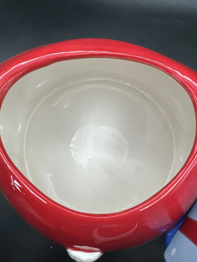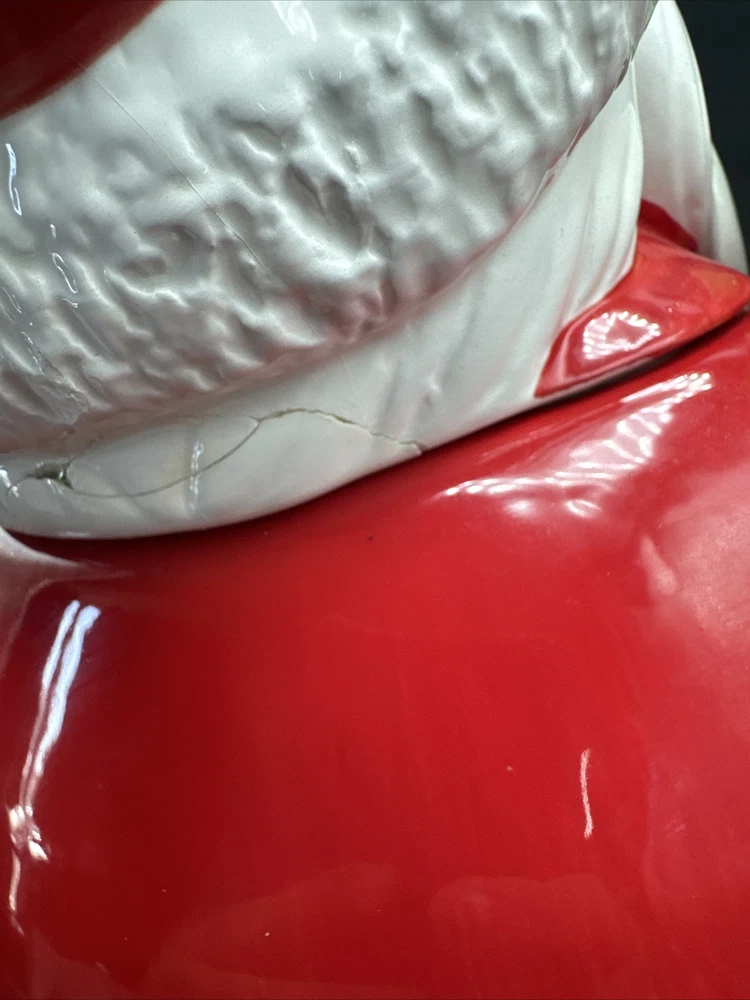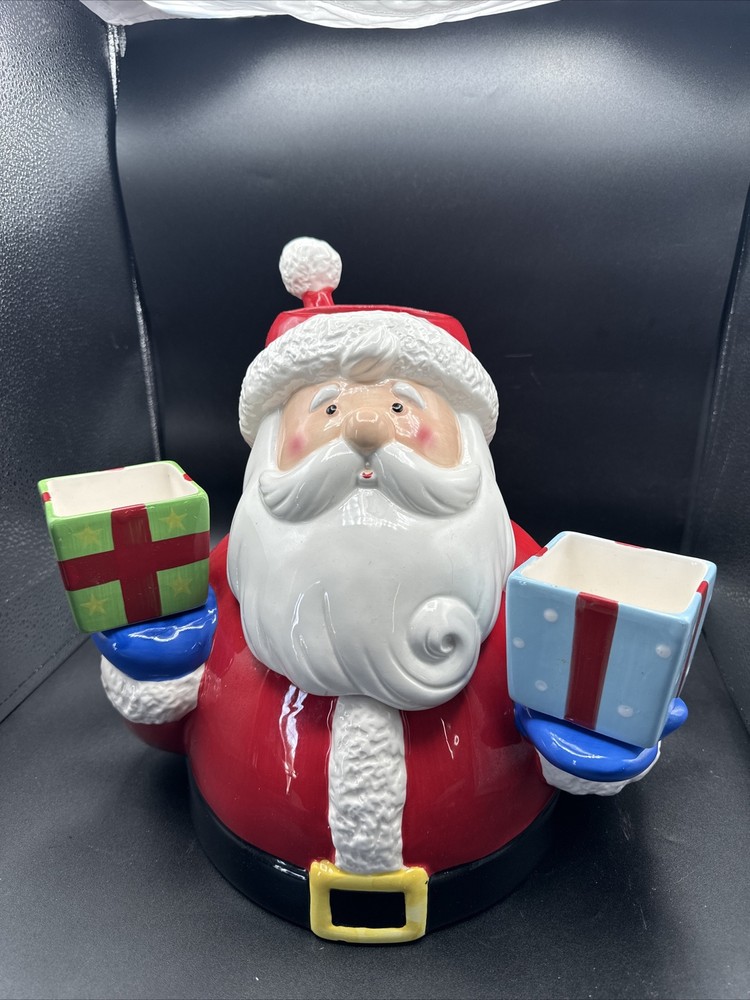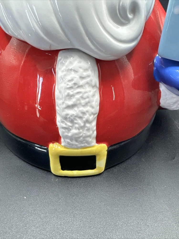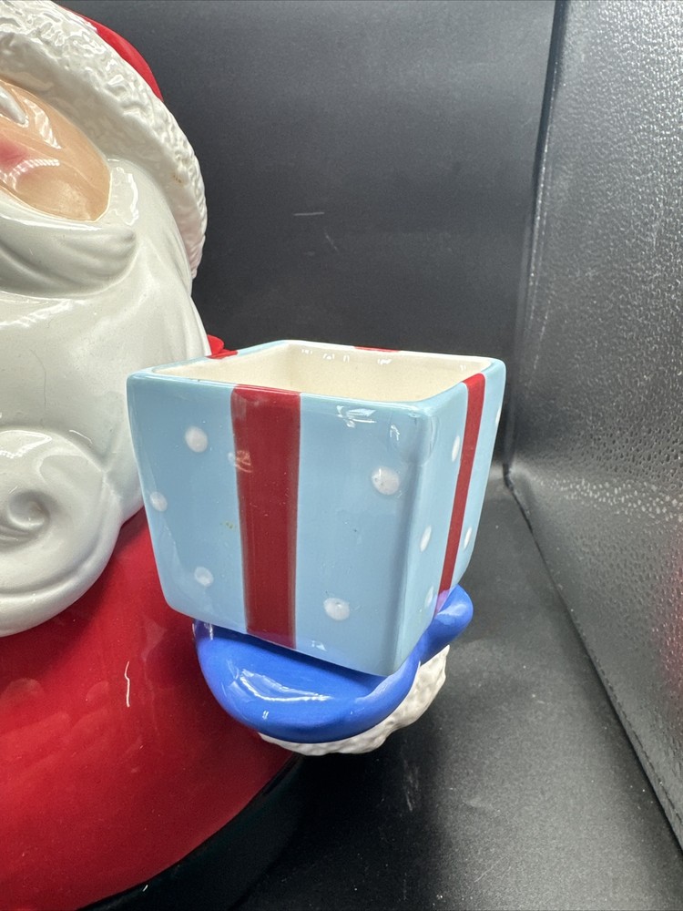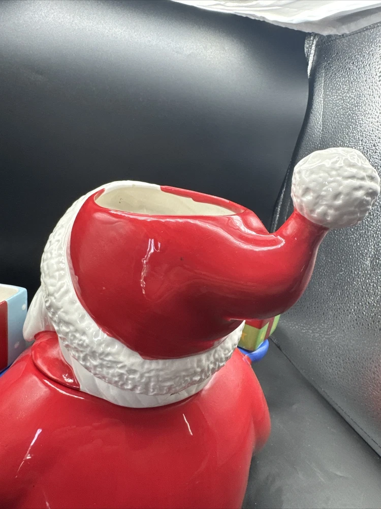 Add some festive cheer to your kitchen with this Santa Serves Holiday Goodies Cookie Jar! This large ceramic jar features a traditional Santa shape and a colorful all-over pattern. It comes with a sit-on lid and a removable chip and dip, making it perfect for storing and serving holiday treats. With four compartments and a magnetic closure, this jar can hold plenty of cookies, candies, and other goodies. It's a great addition to any holiday collection and is sure to delight both kids and adults. Get ready to spread some holiday joy with this Santa Serves Holiday Goodies Cookie Jar! Comes with original box and styrofoam. See pictures for condition. **Behind Santa's head a repair was made. Please see pictures prior to buying**