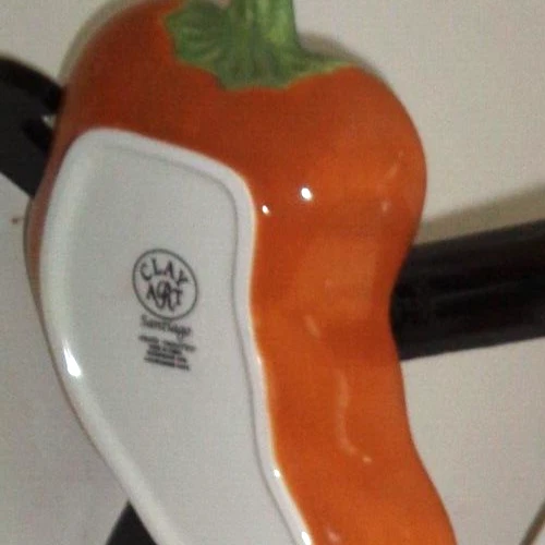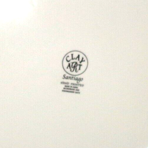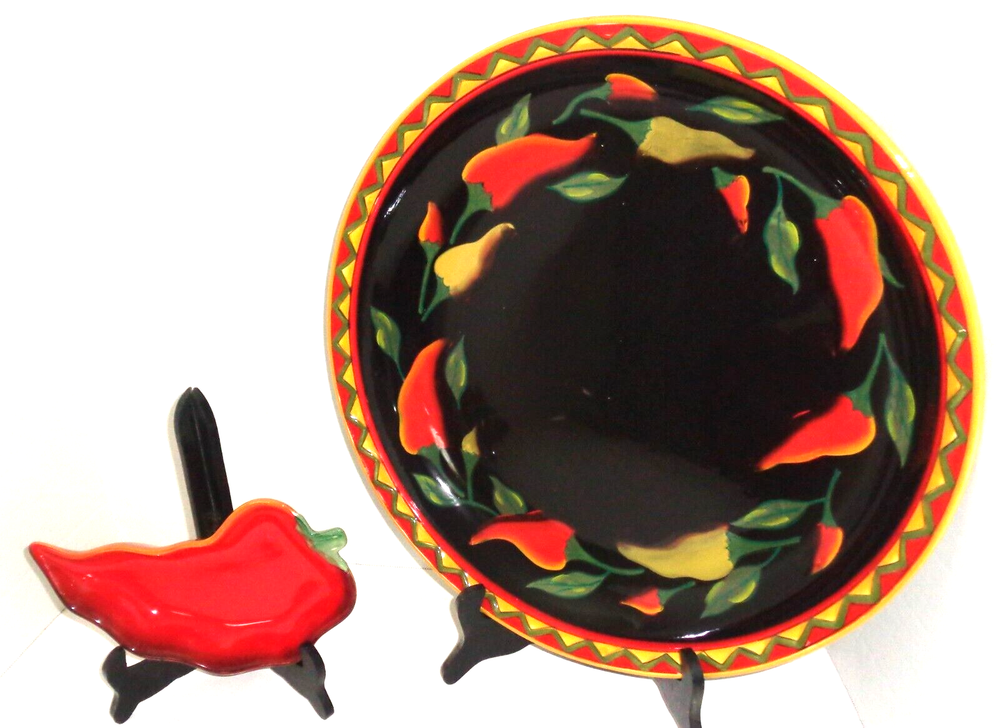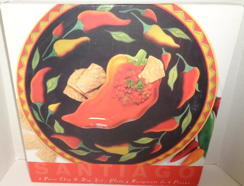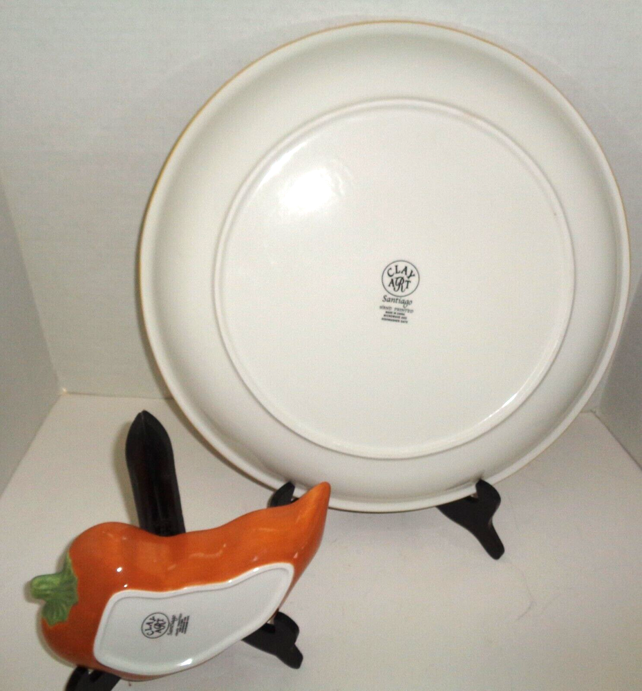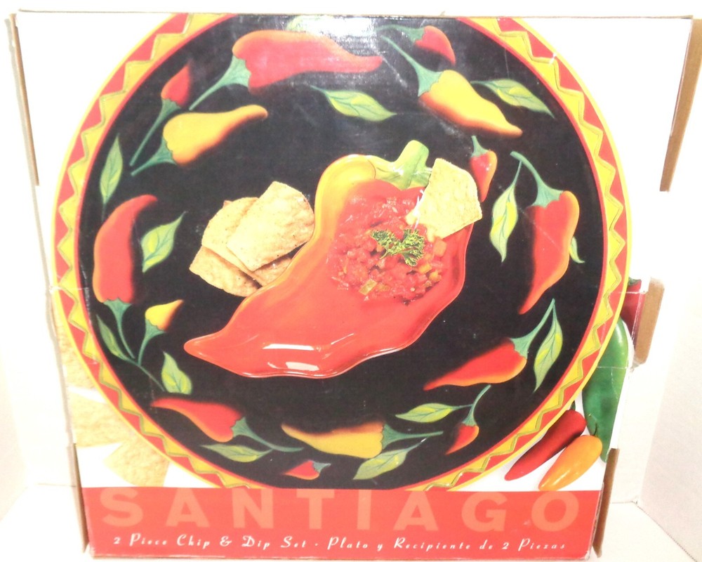 Santiago Clay Art Jalapeños Chip and Dip Set Nachos & Salsa Bowls Hand Painted Measures approx; Chip Bowl: 16" x 16" x 2" Salsa Bowl: 9" x 4 1/4" x 1 1/2" Heavy weighing 7 pounds prior to packing It is new, never used. No chips or cracks. A few manufacturing flaws. Two tiny pops in the glaze and some over paint. See pictures with zoom