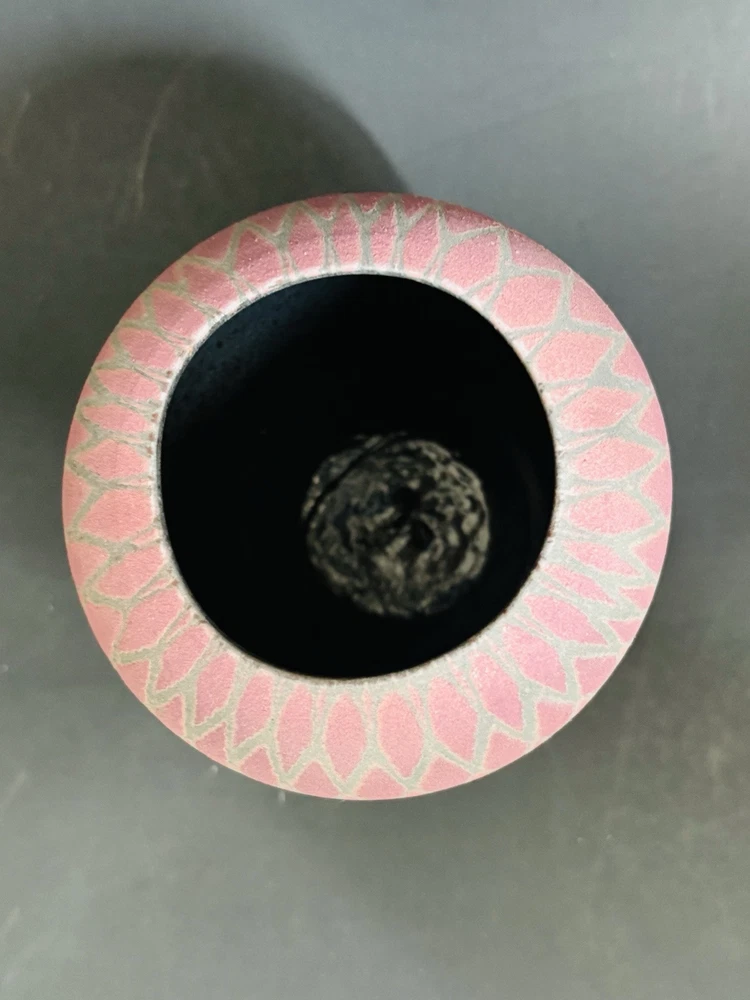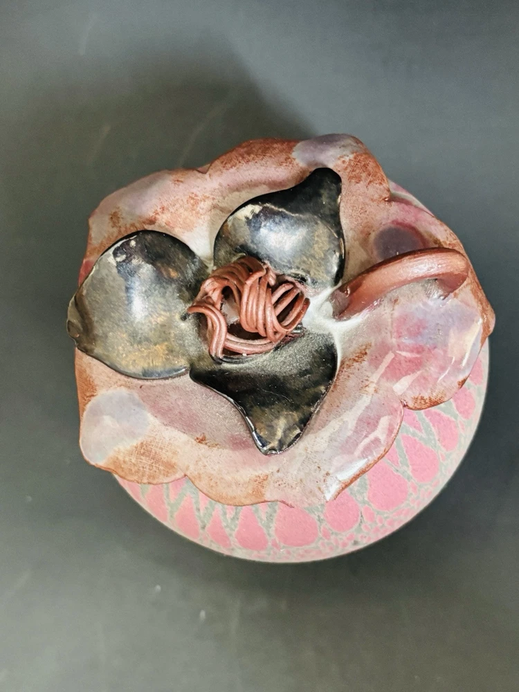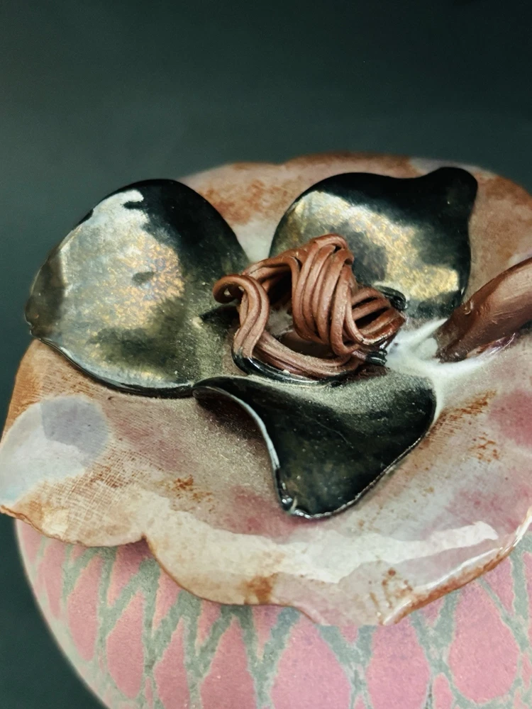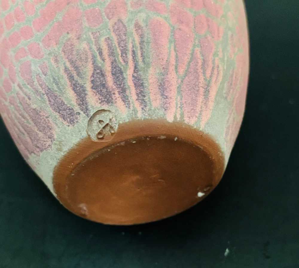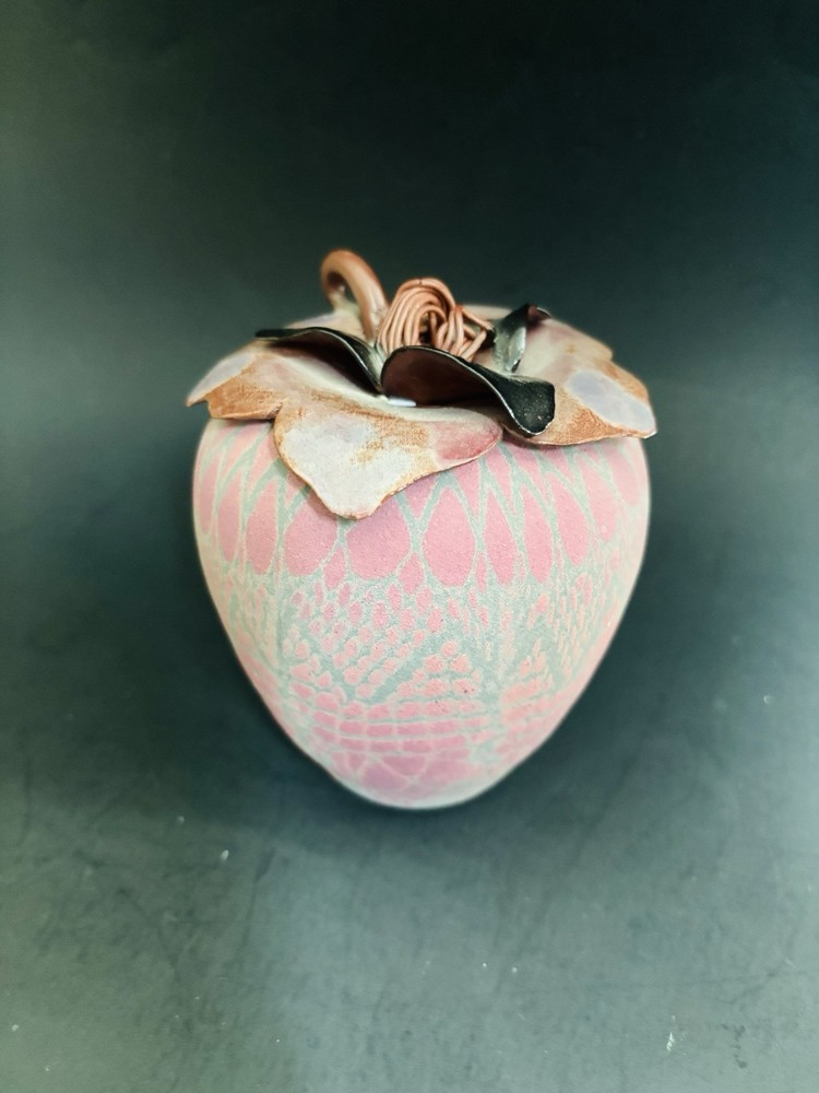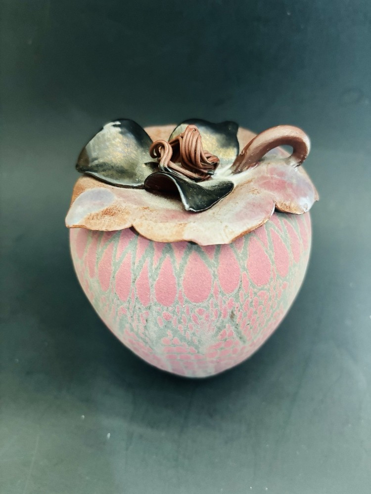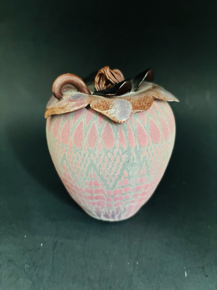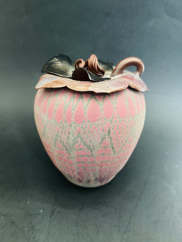 Sarah Frederick Studio Art Pottery Apple Shaped Covered Sugar Bowl Diamond pattern Pink and green matte glaze bowl Glossy lid This is rare. She usually makes vases or oil lamp Signature stamp Lid has tiny chip under tip of 1 petal. Please see last 3 photos. Not noticeable from top Made in USA Sarah Frederick was from Louisville Kentucky Vintage 4.5 inches tall 4 inches diameter
