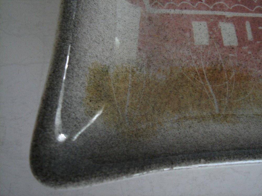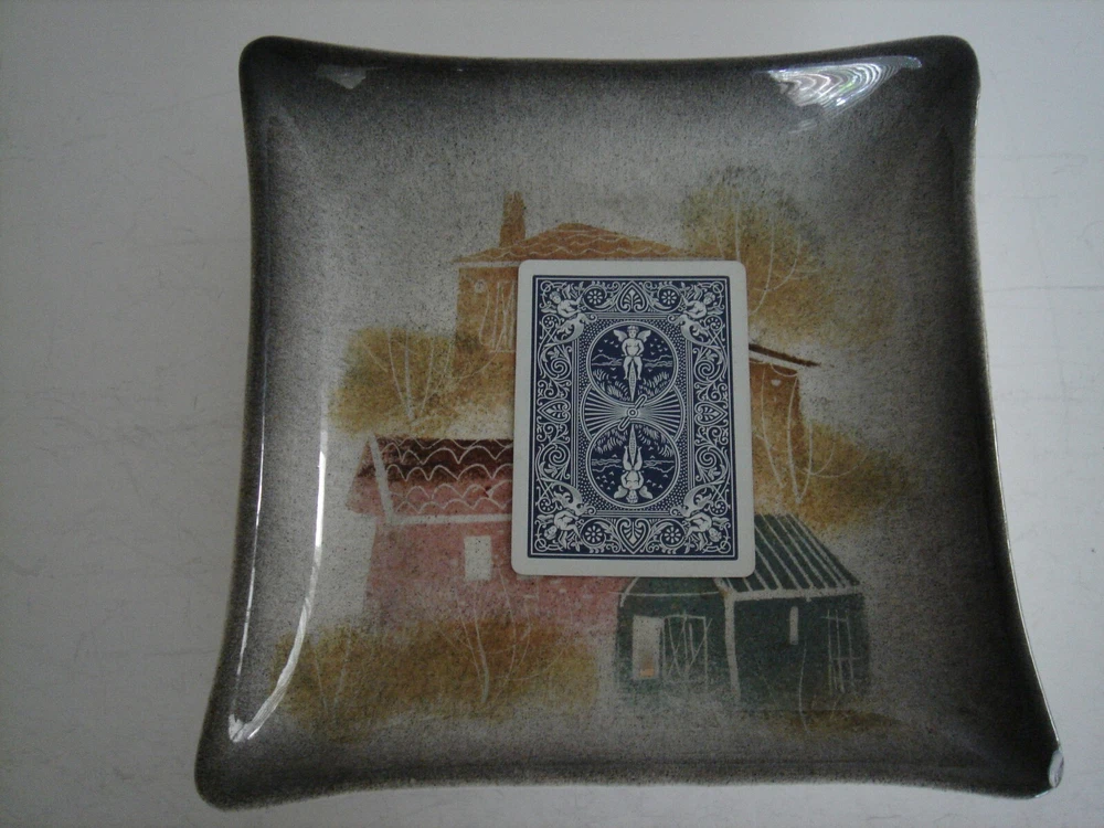 This offer is a Sascha Brastoff mid-century modern studio art pottery signed dish, made in California USA. The subject matter are houses, different shapes and sizes. The d imensions are 7 3/4 inches wide/long and 1 1/2 inches tall. T he condition is good but used there are no rough spots, but there is crazing and a chip on one corner. The colors are black, brown, green, yellow, rust and gold. Please review all the photos for the fine details. Items shipped from a smoke free home. We only ship to confirmed addresses, we are not responsible for dut ies or taxes, no APO/FPO . We take great care to carefully describe each and every item as accurately as possible. Please message any questions and we will do our best to help. Thank you