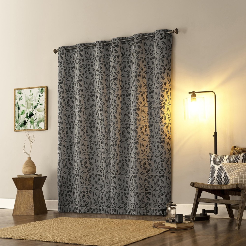 Featuring an intricately embroidered leaf pattern, Satti Embroidered Leaf 100% Blackout Grommet Curtain Panels breathe life into any living space. Equipped with built-in metal grommets for easy hanging on standard curtain rods up to 1.5" in diameter. Extreme Blackout™ Thermal Lining is laboratory tested to block out 100% of light, reduce outside noise by up to 40%, and decrease energy lost through your windows by up to 40%. Comfort is optimized with thermal properties that help keep summer heat and winter chill out of your home. Built-in metal grommets allow for easy slide-through installation on curtain rods up to 1.5" in diameter. Hang in your entertainment room to eliminate screen glare and reduce distracting outside noise, or in your bedroom for enhanced privacy and a sounder, more uninterrupted sleep. Sold as individual panels measuring 40" width by 84" length in color pearl/gray. Measure carefully before selecting your desired size and quantity. Rod not included. Machine wash cold on gentle cycle. Use non-chlorine bleach when needed. Tumble dry on low heat, using a cool iron as needed. Intricately embroidered leaf pattern adds botanical detail Extreme Thermal Blackout technology blocks out 100% of outside light Thermal properties help keep summer heat and winter chill out of your home Noise reduction up to 40% helps you get a sounder, more uninterrupted sleep Built-in metal grommets fit curtain rods up to 1.5" in diameter Panels sold individually. Measure carefully prior to purchase. (Image features 2 panels)