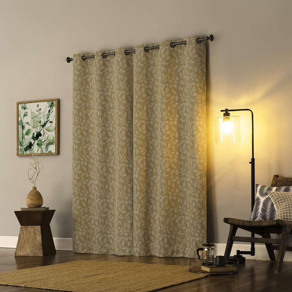 Intricately embroidered leaf pattern adds botanical detail Extreme Thermal Blackout technology blocks out 100% of outside light Thermal properties help keep summer heat and winter chill out of your home Noise reduction up to 40% helps you get a sounder, more uninterrupted sleep Built-in metal grommets fit curtain rods up to 1.5" in diameter Panels sold individually. Measure carefully prior to purchase. (Image features 2 panels)