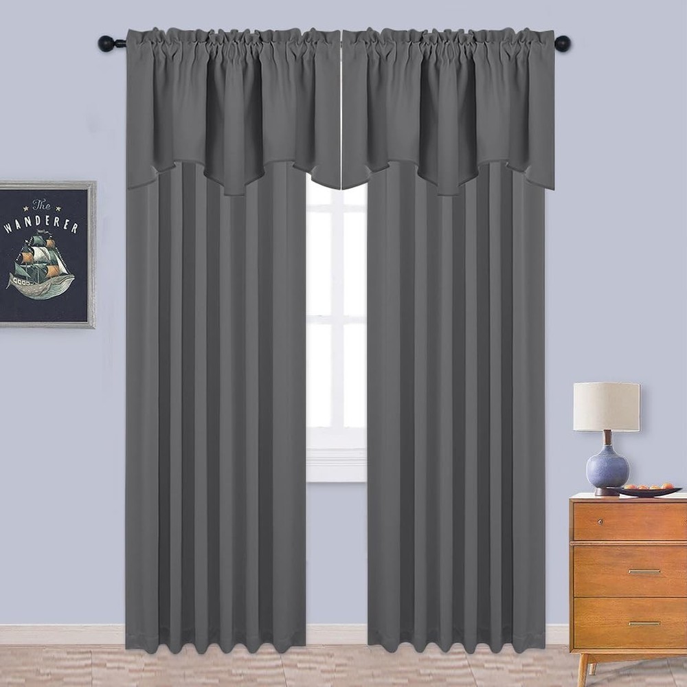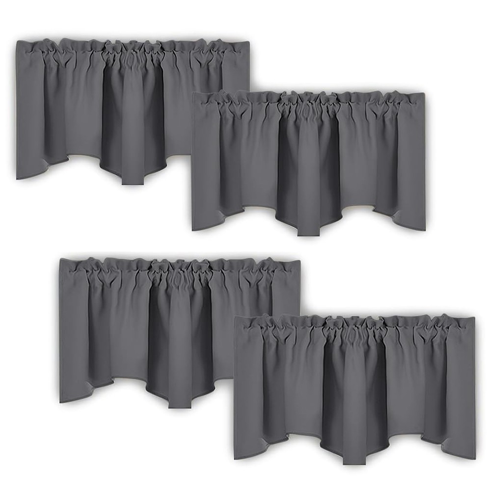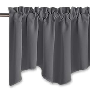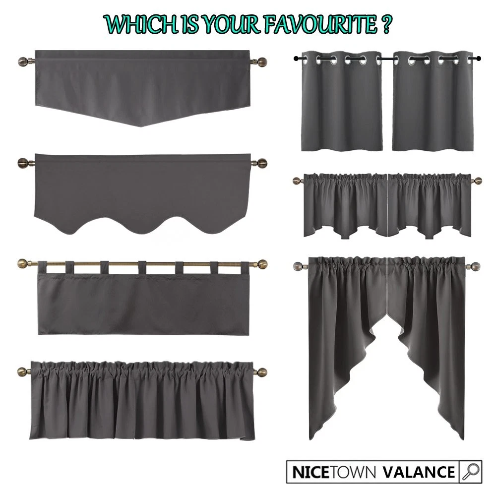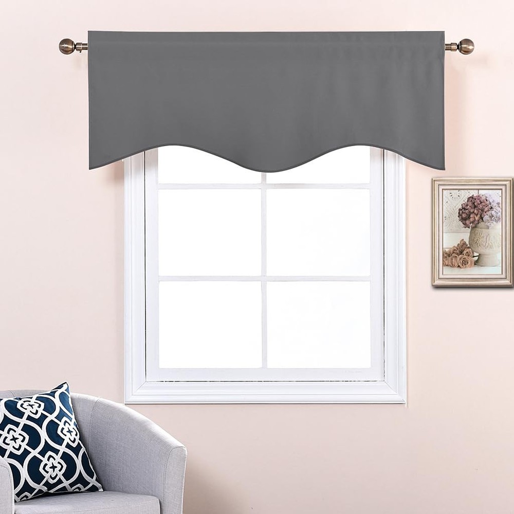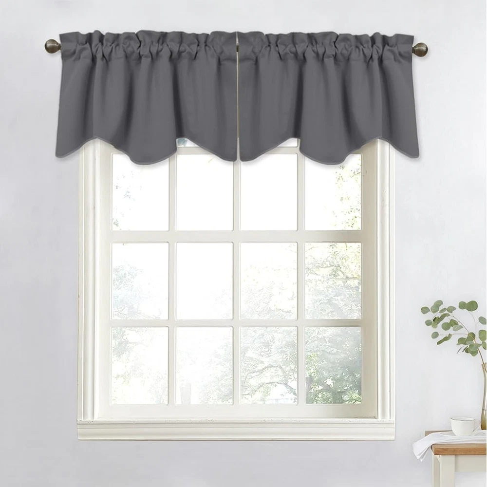 Choose scalloped valances, add elegance to your home decor With SCALLOPED VALANCE , there is more to it. FIT NICELY: The scalloped valance is constructed with a 2-inch rod pocket and multiple solid color options. It measures 52-inches wide; length is measured overall 18-inches from the rod pocked top to bottom of the panel. Sold as 4 panels. PERFORMANCE: Different from other ordinary lightweight fabric, with super soft and heavy innovative triple-weave 200 GSM polyester fabric, this product has better shading performance. Perfect for kitchen, bedroom, living room or bath. And you can match the same color scheme of Blackout Curtains in . Adds an elegant and smart look for your living space. EASY CARE: Machine washable, recommended hand wash or dry cleaning. Wash the water temperature below 86℉. Advocate for the use of flexible detergents, no bleaching. Low-temperature ironing if necessary. OTHER DESIGN VALANCE Welcome to the shop, you can find a variety of different designs of the valances. There must have your favorite models. READY MADE: 4 panels per package. Each panel measures 52" wide x 18" long. The design of pocket (2 inches diameter) makes the curtains easy to install and slide and creates casual elegance for your home. STYLISH DESIGN: The Blackout Scalloped Valances bring soft sophistication to your home. And the solid color will perfectly complement any existing home decor. Simple pleats on the rod pocket add an elegant look. AMAZING MATERIAL: Super heavy and soft Blackout Drape Panels are very upmarket. No coating, no formaldehyde, Fade-resistant, skin-friendly, creates a harmonious environment. The same materials are on both sides. WIDE COMPATIBILITY: You will be easy to find a similar style blackout curtains with the same color in the store. These valances are your perfect choice for the bathroom, kitchen, cafe store or any small window. EASY CARE: Machine wash in cold water below the temperature 86℉. Low ironing to remove wrinkles. Products have 30 days money-back Guarantee! Come and contact us if you have any questions or requests!