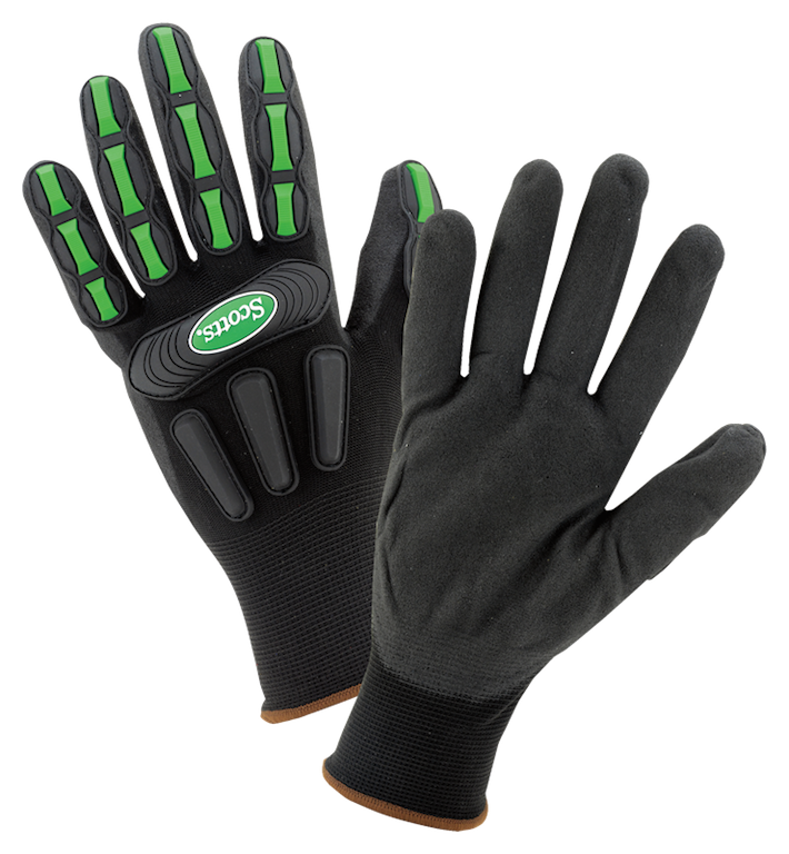 SCOTTS IMPACT PROTECTION DIP GLOVES SIZE: LARGE Heavy-duty foam nitrile coating provides excellent grip, abrasion resistance and water resistance. The elastic knit wrist provides perfect fit and keeps dirt and debris out of the glove. The stretch knit shell is breathable and comfortable. The TPRs on the back of fingers and back of hand offers great impact protection. FEATURES • Foam nitrile coating provides excellent grip, abrasion resistance and water resistance Elastic knit wrist keeps dirt and debris out of the glove TPRs on the back of fingers and back of hand offers great impact protection Stretch knit shell is breathable and comfortable GLOVE LENGTH: 10.25" PALM WIDTH: 4" HEM COLOR: BLACK THANK YOU FOR LOOKING