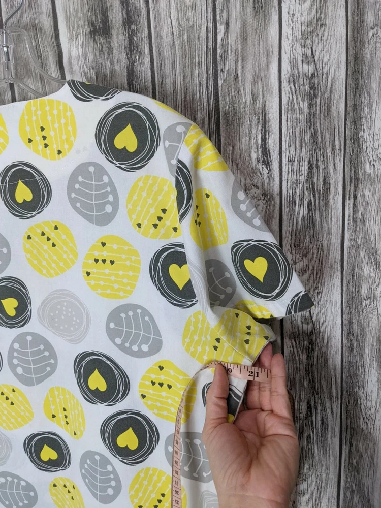 Scrub Studio Women's White Gray/Yellow Heart Themed Scrub Shirt Size Small RN#57623 Note: Mild normal wear. And the yellow color as a lime green undertone. Shipped With USPS First Class....