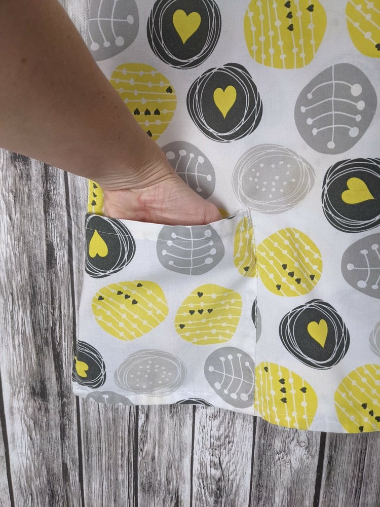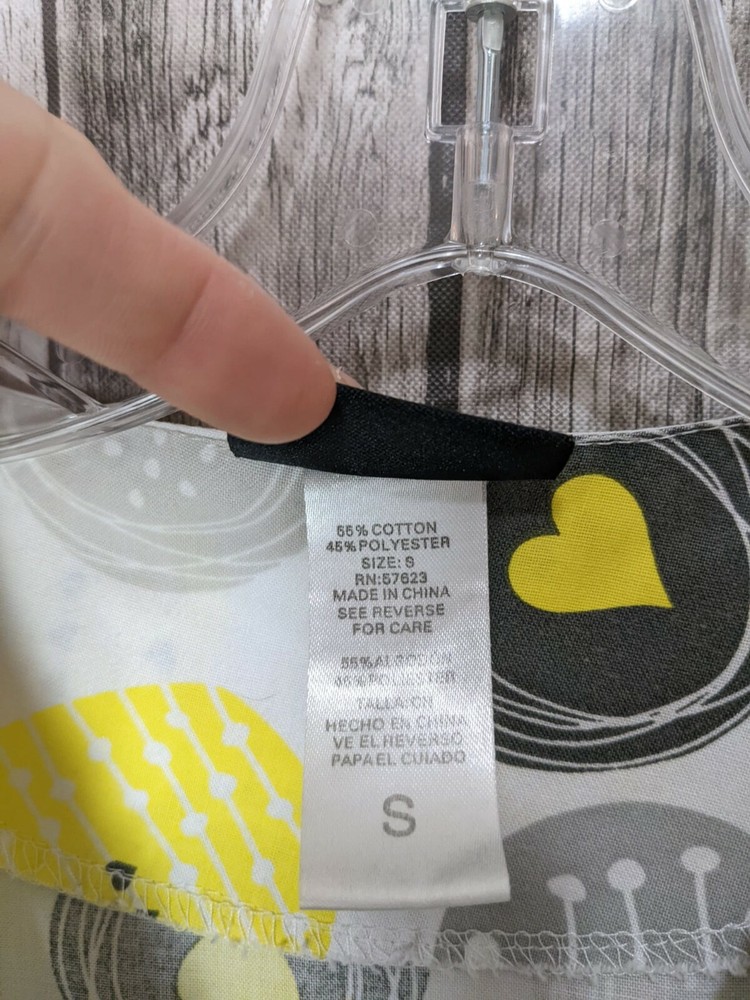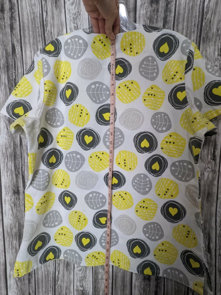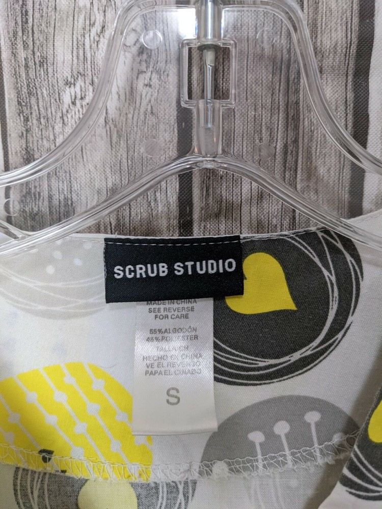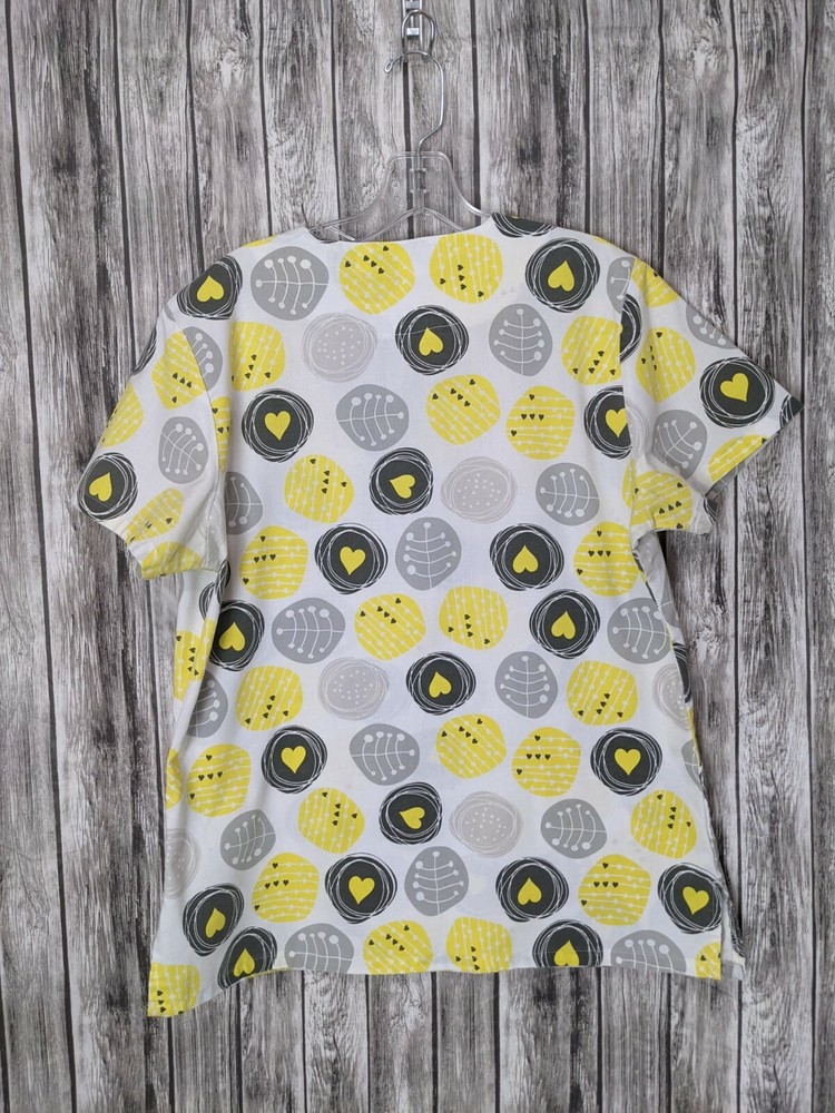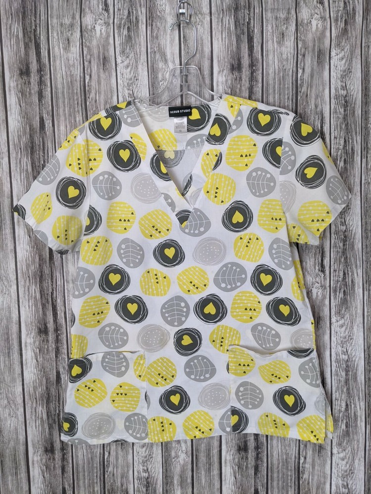 Scrub Studio Women's White Gray/Yellow Heart Themed Scrub Shirt Size Small RN#57623 Note: Mild normal wear. And the yellow color as a lime green undertone. Shipped With USPS First Class.
