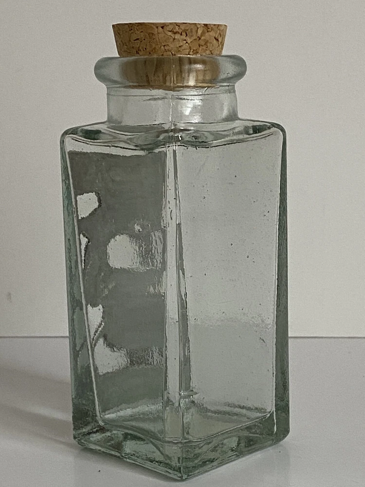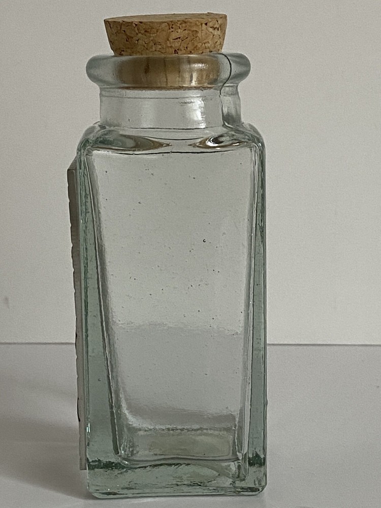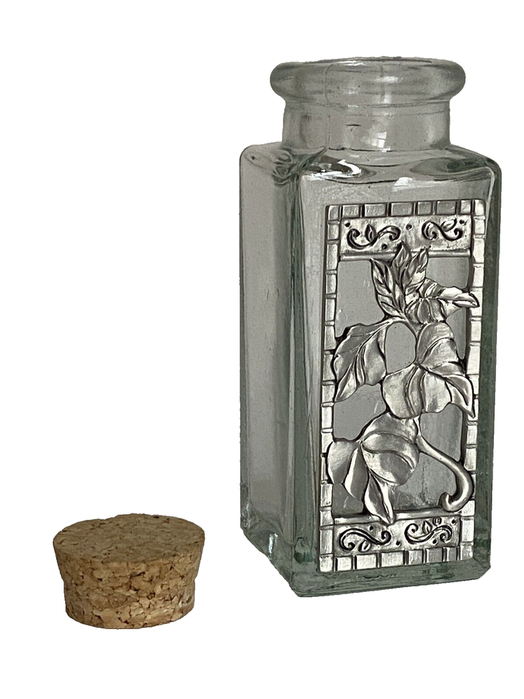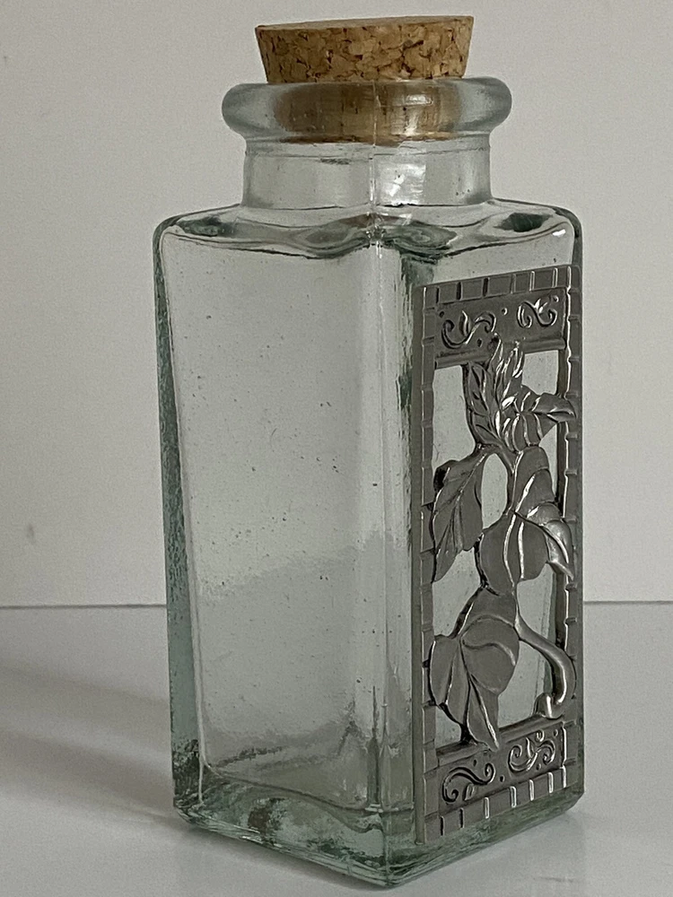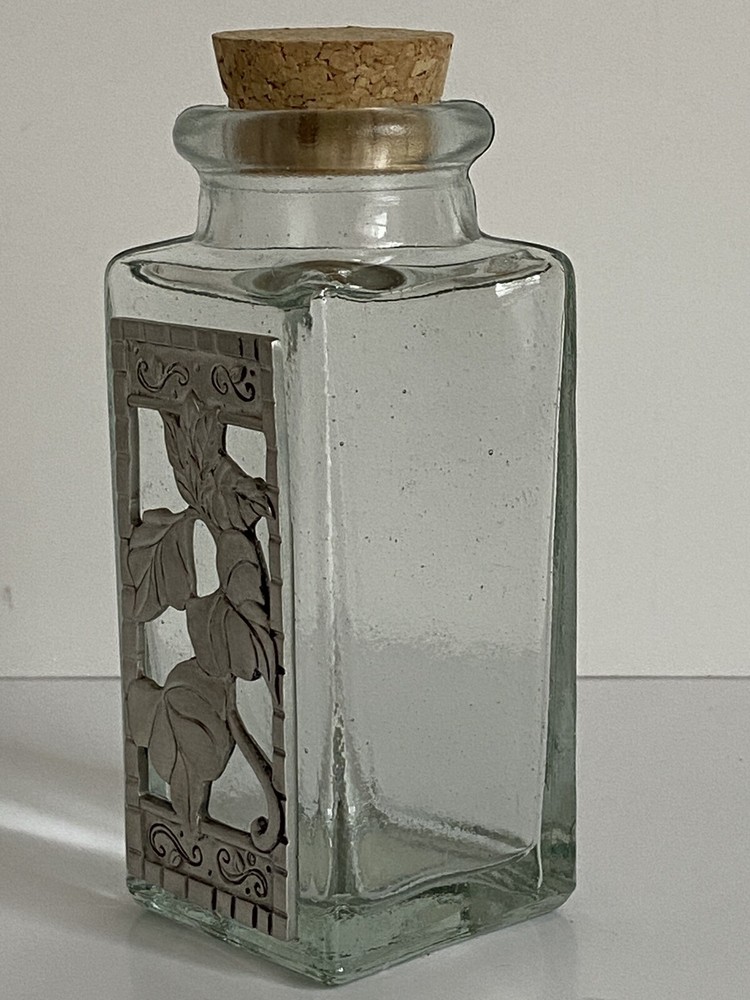 Seagull Pewter studio recycled square glass spice herb jar Spain cork stopper Glass jar made in Spain Pewter handcrafted in the artists' studio in Canada Dimensions: Height, including stopper = 4.75" tall Length of each side = 1.75" long Jar opening = 1" diameter * Clear recycled glass * Gorgeous handcrafted pewter piece has been affixed to one side, depicting leaves and scrolls * Use for spices, herbs, decor, or even small treasures! Excellent pre-owned condition. No damage. From a clean, smoke-free, pet-free home. We re-use clean and undamaged materials for packing and shipping whenever possible. (We love Mother Earth!)