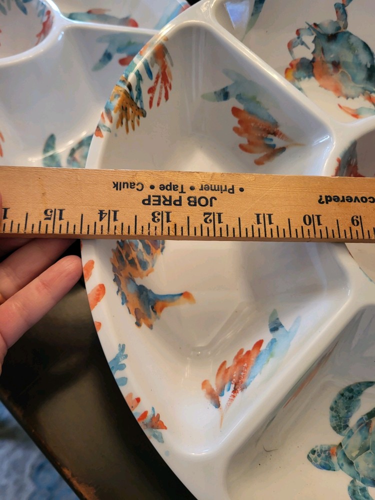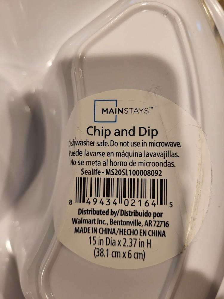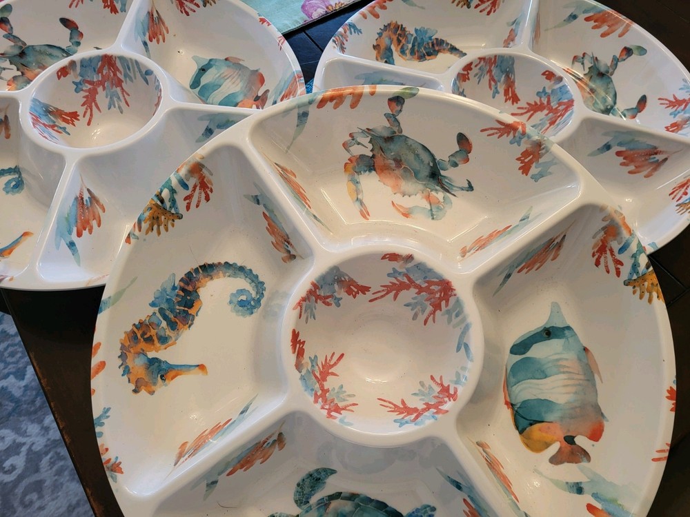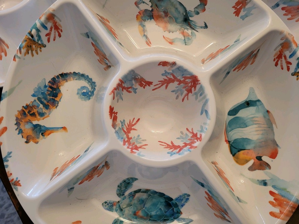 This Sealife Chip And Dip Tray by Mainstays features a circle shape with 5 compartments, making it perfect for serving snacks at any occasion. The tray is large in size and is adorned with a vibrant multicolor beach and tropical theme. Made of durable melamine material, it is dishwasher safe and chip resistant for easy cleaning and long-lasting use. This set includes 3 identical trays, each designed with a fun sealife theme to add a touch of whimsy to your serving collection. selling as a set of 3.