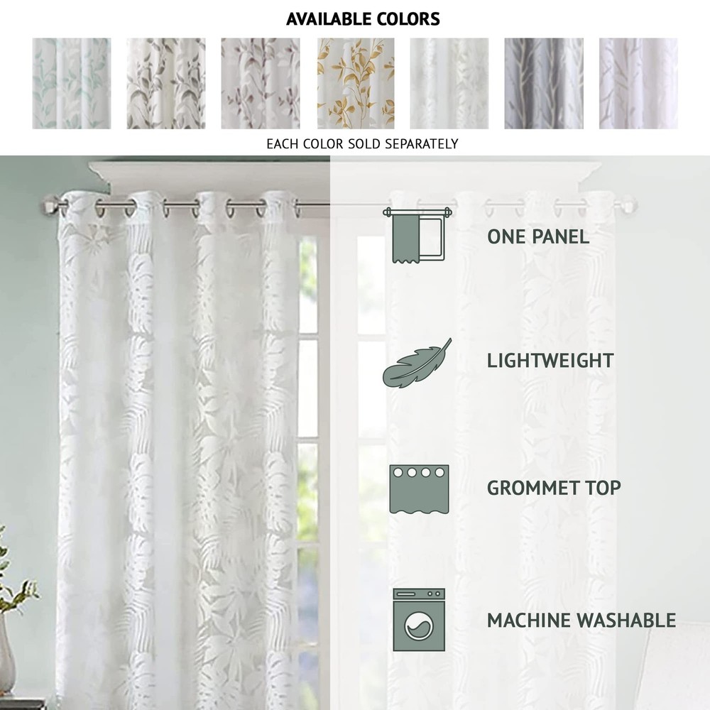 " All over burnout bird on branches window curtain panel Silver grommet top that fits up to 1.25 inches in diameter rod Lightweight sheer and see through fabric Great for layering curtain as the second panel " 57% Rayon 43% Polyester Burn Out; Grommet Top 1 Window Panel:50x95" HAND WASH IN COLD WATER SEPERATELY. DO NOT BLEACH. HANG TO DRY.