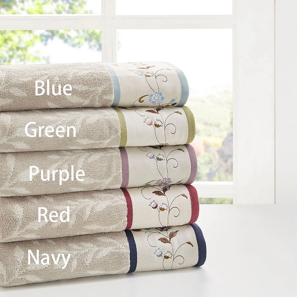 Add a touch of elegance to your bathroom decor with our Serene Embroidered Cotton Jacquard 6 Piece Towel Set. These cotton towels feature a jacquard leaf pattern with a floral embroidered hem, and blue contrast piping details to create a beautiful and sophisticated look. This cotton towel set is also OEKO-TEX certified(Made in Green), meaning it does not contain any harmful substances or chemicals, ensuring quality comfort and wellness. Highly absorbent and incredibly soft from its medium weight terry loop construction, this towel set is also machine washable for easy care for the perfect addition to any bathroom. Set includes: 2 standard 27x52" bath towels, 2 standard 16x28" hand towels, and 2 standard 12x18" fingertip towels. Add a touch of elegance to your bathroom decor with our Serene Embroidered Cotton Jacquard 6 Piece Towel Set These cotton towels feature a jacquard leaf pattern with a floral embroidered hem, and color contrast piping details to create a beautiful and sophisticated look This cotton towel set is also OEKO-TEX certified, meaning it does not contain any harmful substances or chemicals, ensuring quality comfort and wellness Set includes: 2 Bath Towels: 27"W x 52"L, 2 Hand Towels: 16"W x 28"L, 2 Fingertip Towels: 12"W x 18"L Care Instructions: Machine Washable. New towels tend to lint at first but after several washes, lint will diminish. Towels should be washed separately to minimize lint