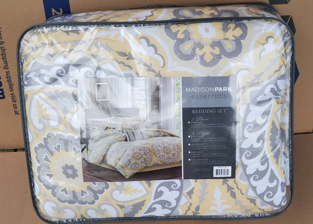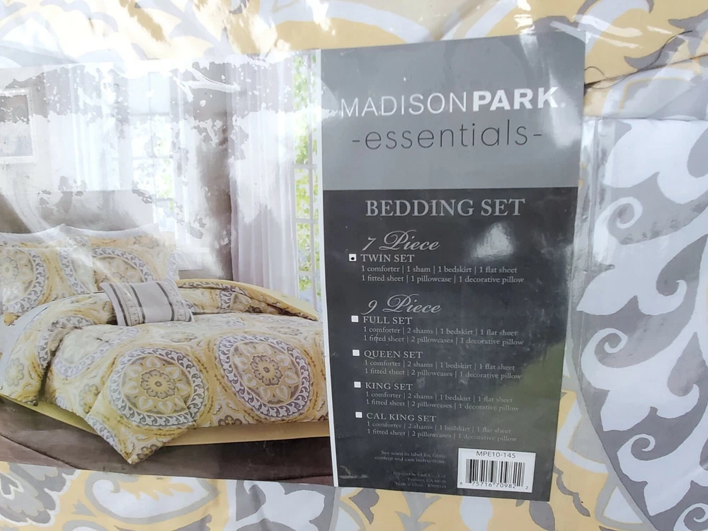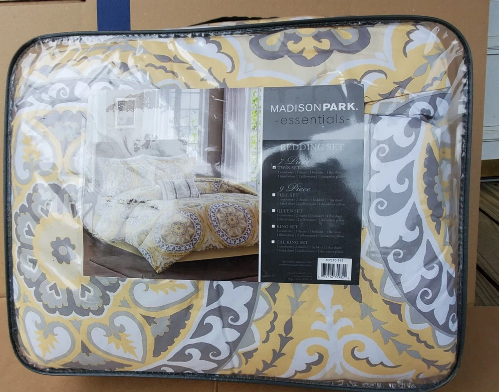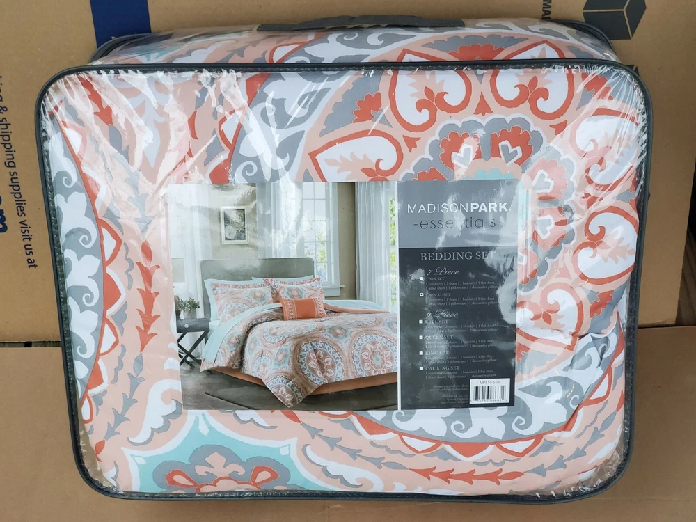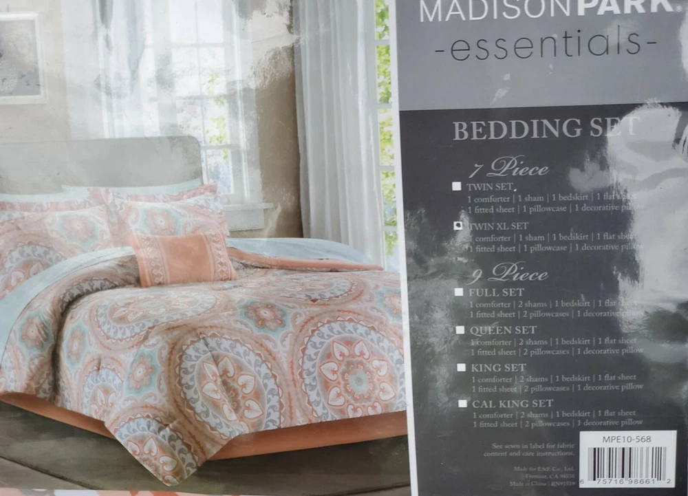 Description: Serenity Complete Bed and Sheet Set by Madison Park Essentials. 100% Polyester. Condition is New with tags. The price is for one comforter set. There is a discount for buying more than one and a shipping discount. Contents & Measurements: Twin: 1 Comforter 68"x86" 1 Standard Sham 20"x26" 1 Pillowcase 20"x30" 1 Flat Sheet 66"x96" 1 Bed Skirt 39"x75" +15" 1 Fitted Sheet 39"x75" +12" 1 Decorative Pillow 12"x18" Twin XL: 1 Comforter 68"x90" 1 Standard Sham 20"x26" 1 Pillowcase 20"x30" 1 Flat Sheet 66"x102" 1 Bed Skirt 39"x80" +15" 1 Fitted Sheet 39"x80" +12" 1 Decorative Pillow 12"x18" Shipping: Carrier: FedEx Ground or FedEx Home Delivery. Shipping Time: Departs same day or the following business day. **If you have time, check out some of my other items. If possible, I will combine shipping. You will need to message me before you place an order to get this discount.**