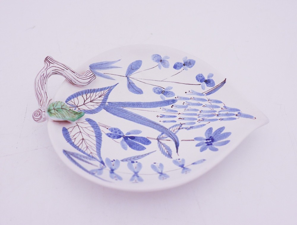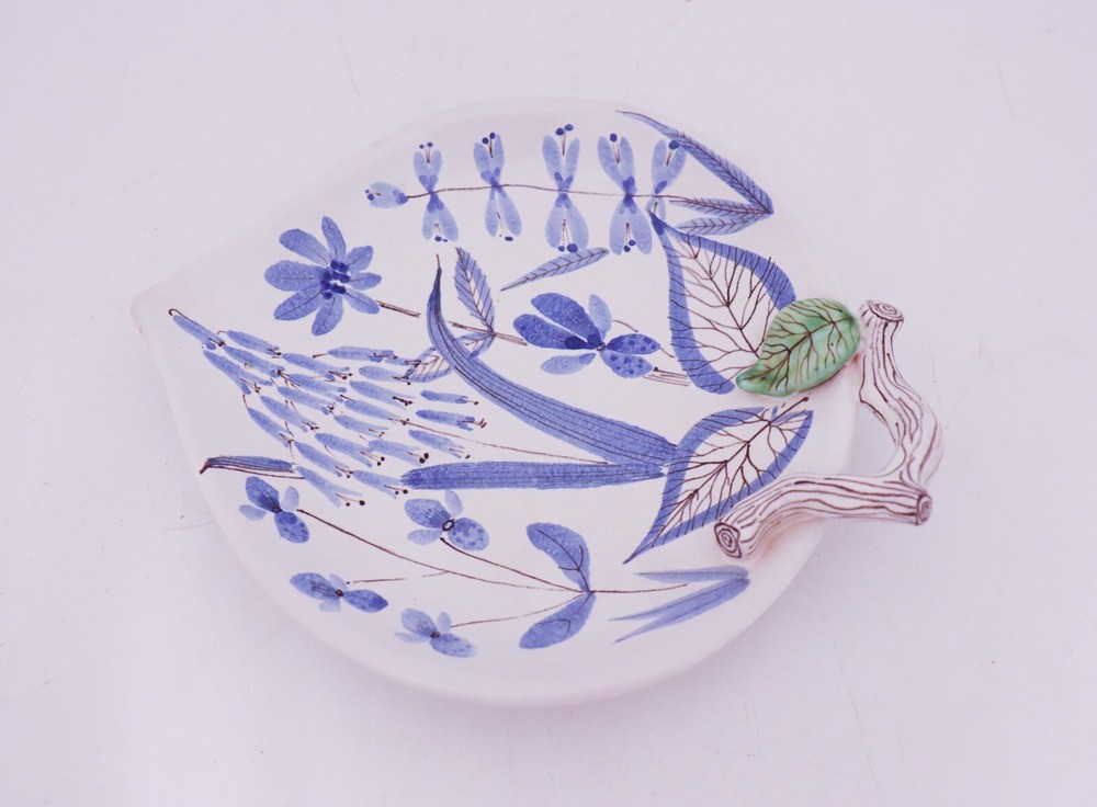 A lovely serving dish in faience designed by Stig Lindberg t Gustavsbergs studio. The dish is 21 x 17 cm (8.4" x 6.8") and in mint condition. It´s marked as on photo. This bowl was painted by the faience painter Eva Bergman at Gustavsberg In 1942, Gustavsberg opened the exhibition “Faience painted in spring” in Stockholm. The press screening of this exhibition was attended by a lot of journalists because an invitation card made of faience had been sent out, which can perhaps be considered one of the first ingenious PR strategies in the industry. These faiences became incredibly popular and have since become somewhat of a hallmark of Stig Lindberg’s design. The forms were created by Stig Lindberg and Gustavsberg had a number of faience painters who painted these characteristic patterns.y. These faiences became incredibly popular and have since become somewhat of a hallmark of Stig Lindberg’s design. The forms were created by Stig Lindberg and Gustavsberg had a number of faience painters who painted these characteristic patterns. Please observe that you need to pay import fees if you are a US buyer.