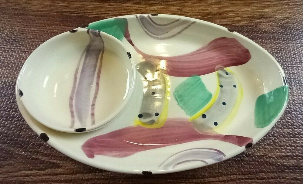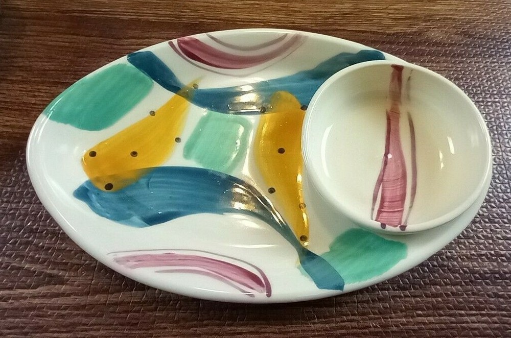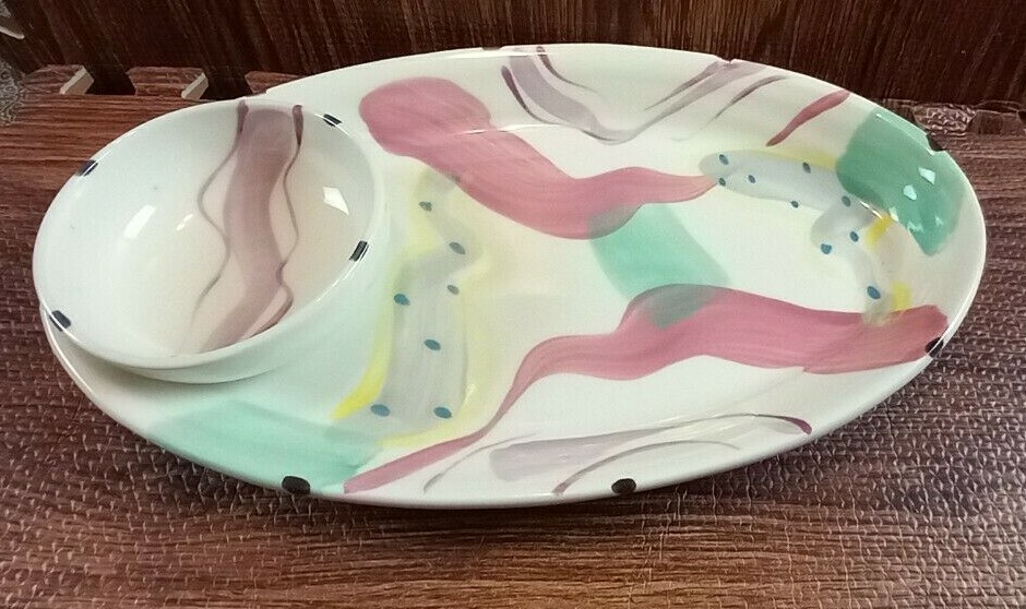 3 Serving Plates Ceramic With Attached Dipping Bowl 1 Large 15" long - 2 Small 12" long. Good used Condition Smoke & Pet free home