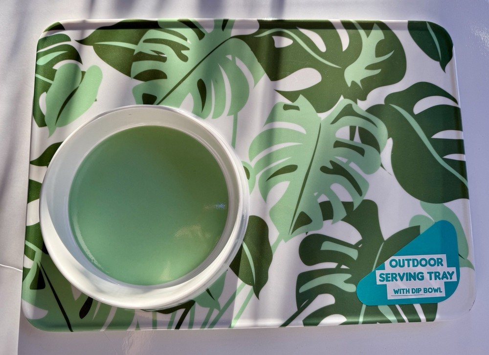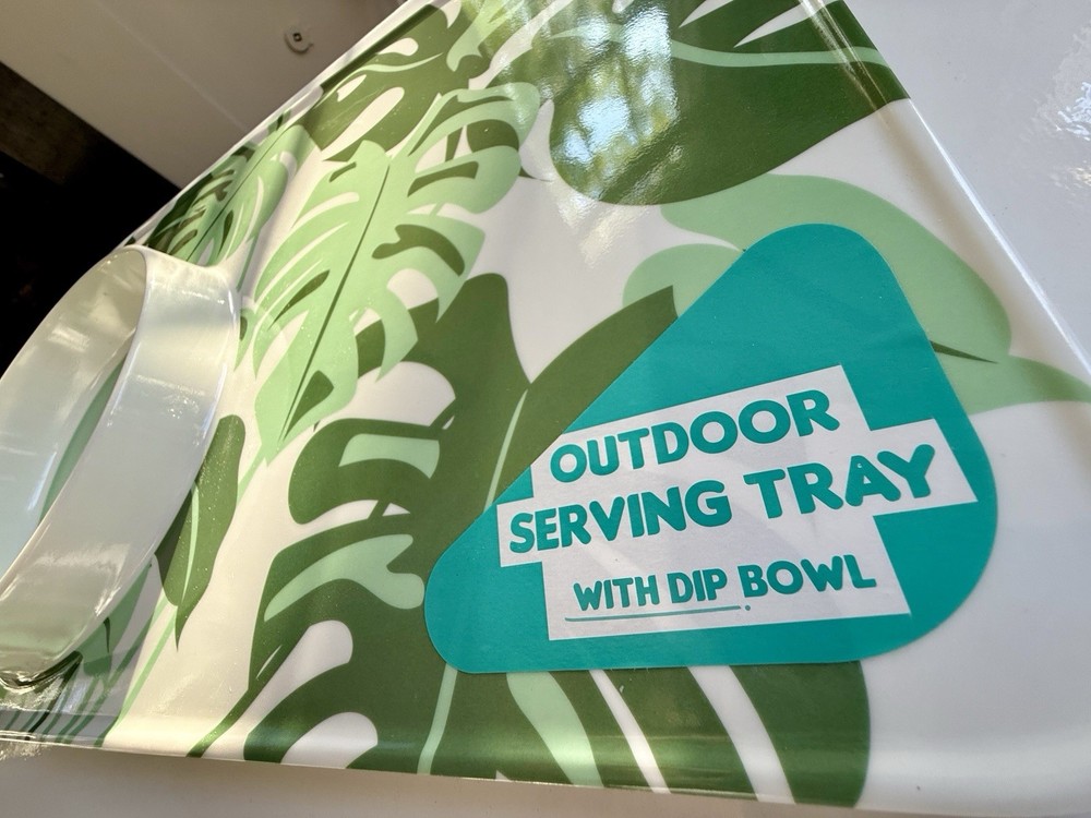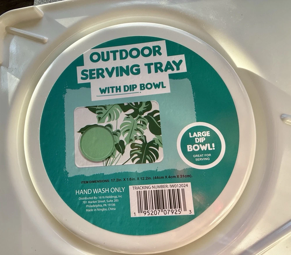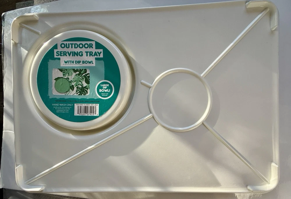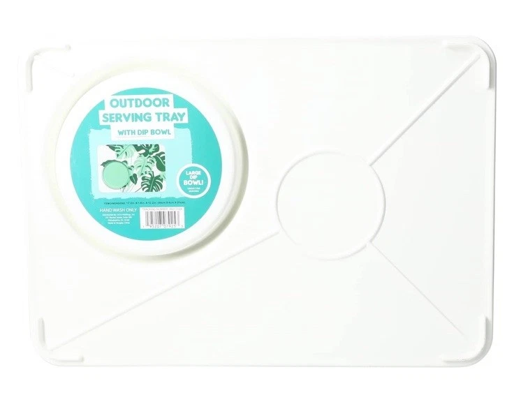 - brand new - great for parties and celebrations - there may be minor scuffs - great condition! - dips for nachos, bread, etc Use an Outdoor Serving Tray to take your food presentation seriously! Perf for parties, charcuterie & picnics. Features a large bowl for easy dipping - yes, please! Size: 17.2in (W) x 12.2in (L) x 1.6in (D) Care Instructions: Hand wash only. Country of Origin: Imported