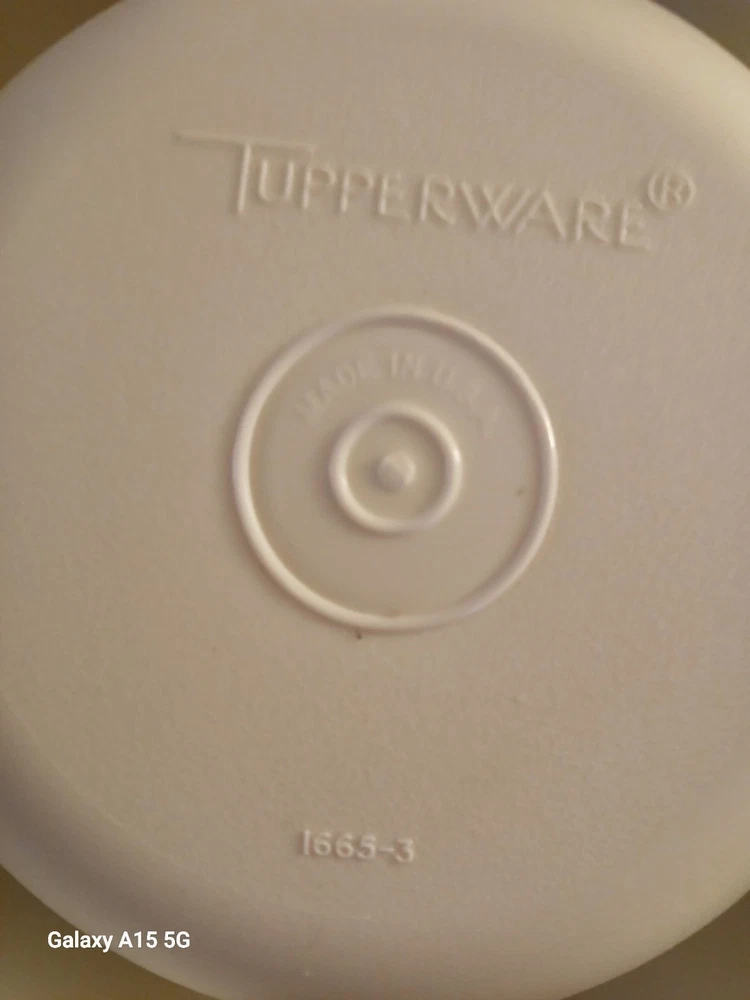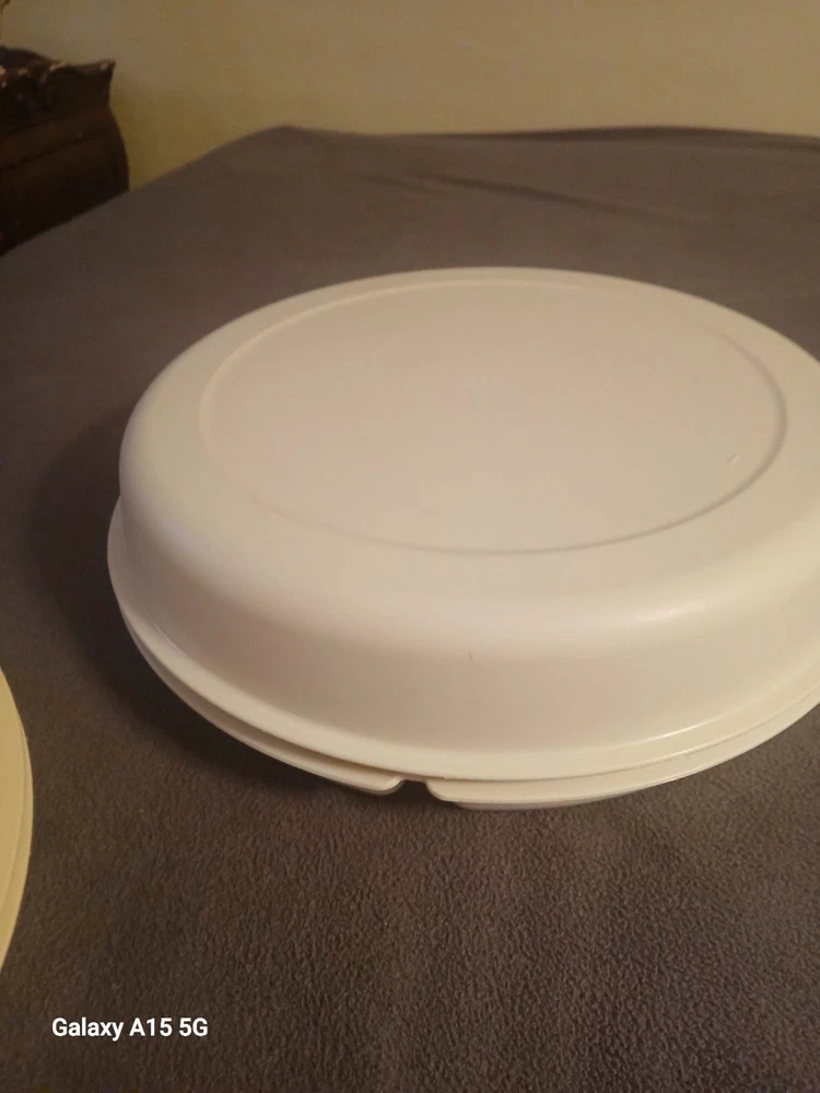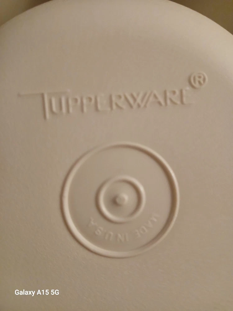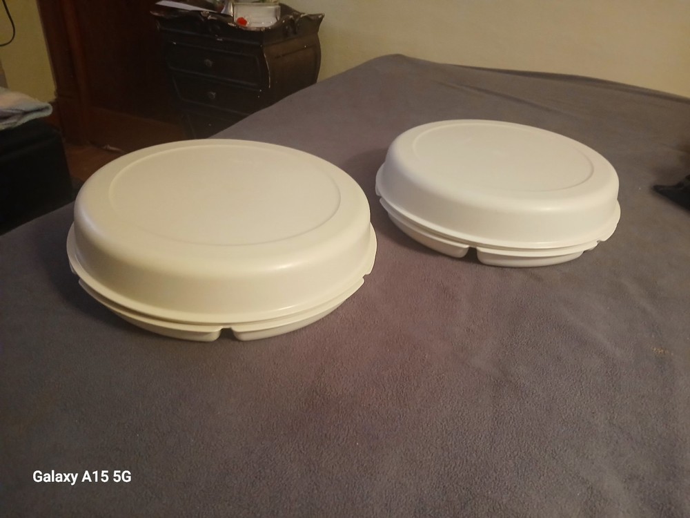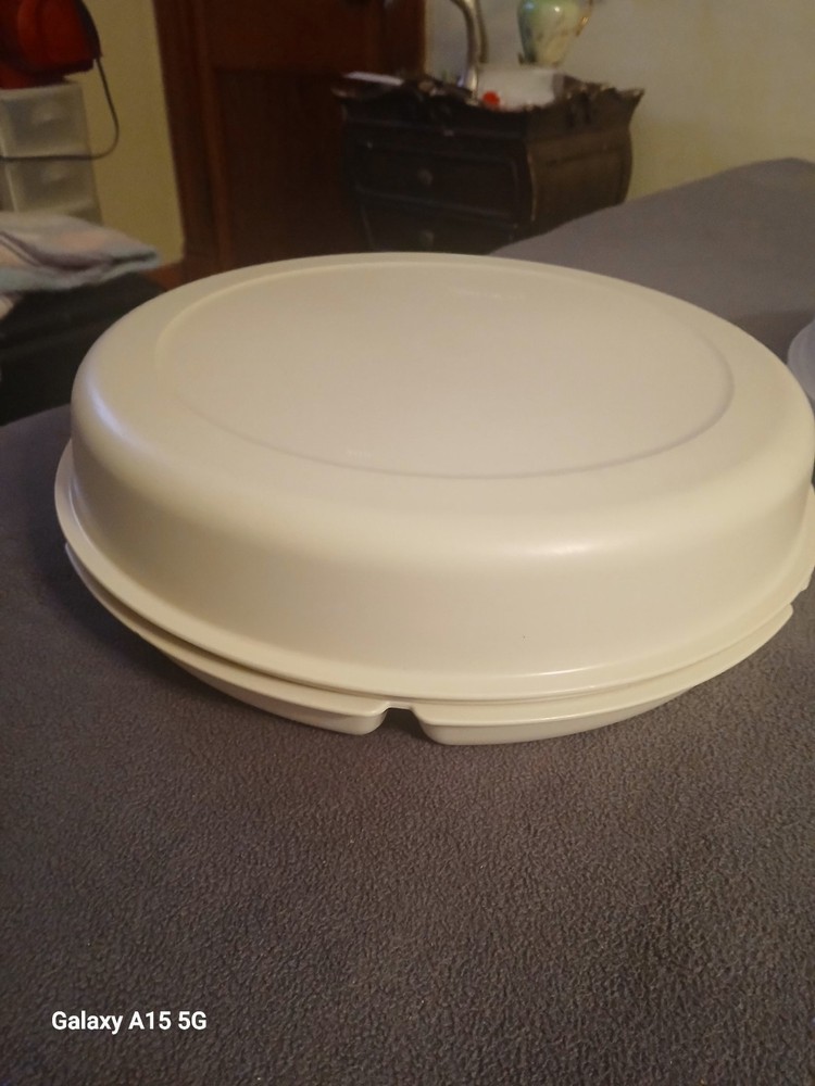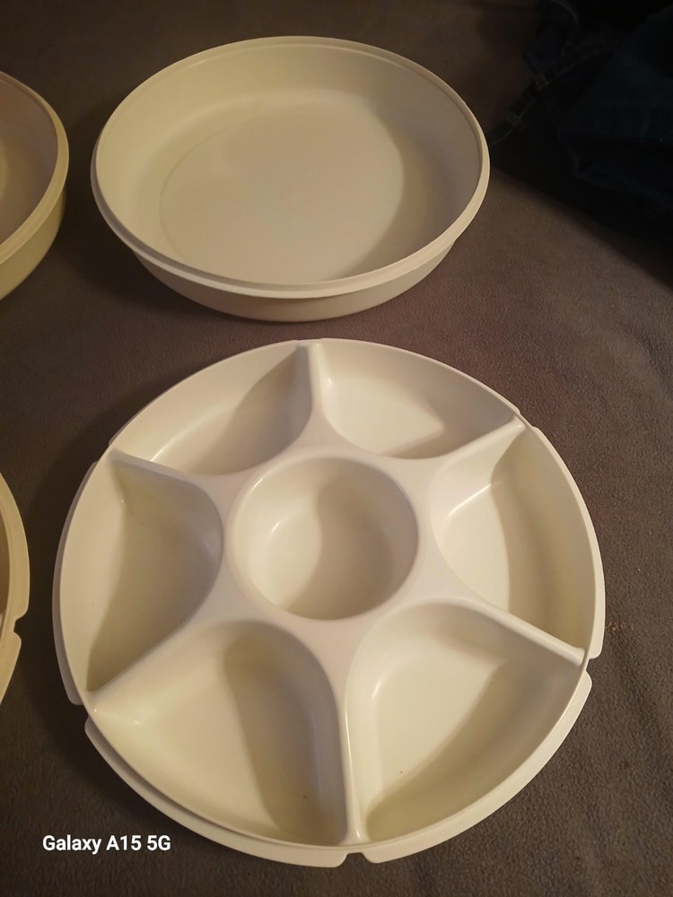 This vintage Tupperware divided veggie tray with lid and almond dip bowl set includes two items, with more than 5 compartments in the round shape tray. Made of plastic, the large size tray features a snap-on lid for easy storage and organization of vegetables or snacks. The retro style set is in original condition and was manufactured in the United States, making it a great addition to any kitchen storage and organization collection.