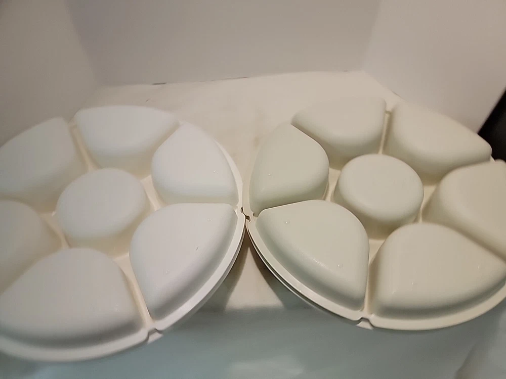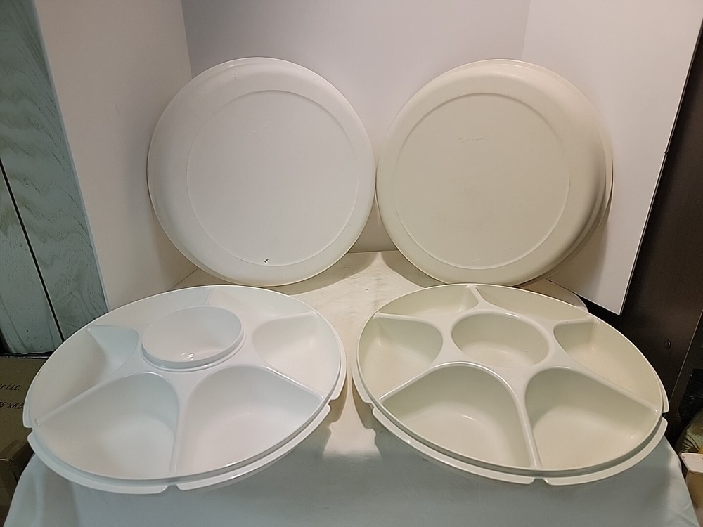 Set of 2 vintage tupperware veggie, serving divider tray. White " 1666-4, hase dip bowl, Almond #1666-1, missing dip bowl. This vintage Tupperware divider tray is perfect for keeping your vegetables fresh and organized. The tray comes with a snap-on lid and measures 14 inches in length and width, with a height of 4 inches. It features more than five compartments, making it easy to store and find your favorite veggies. Made of durable plastic, this tray is built to last and is perfect for everyday use in the kitchen. The almond dip bowl adds a touch of retro style to the tray, making it a great addition to your collection. Whether you're a collector or just looking for a functional and stylish way to store your veggies, this Tupperware tray is the perfect solution.
