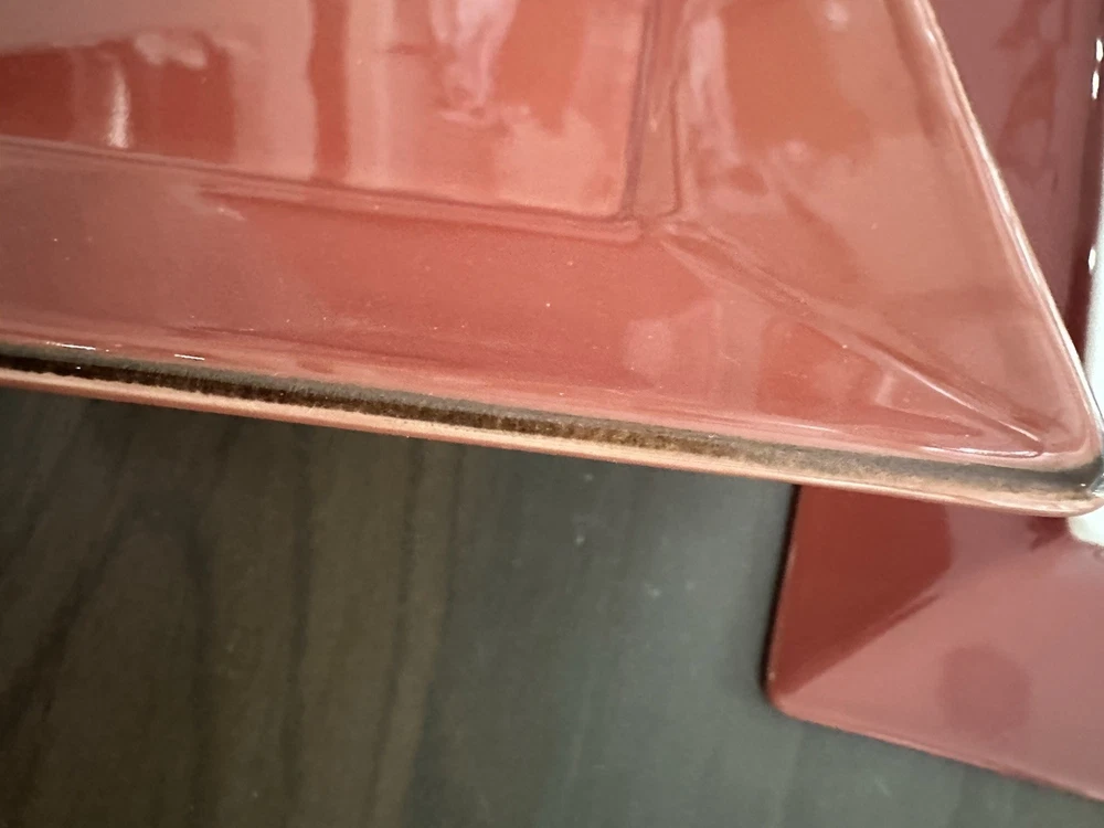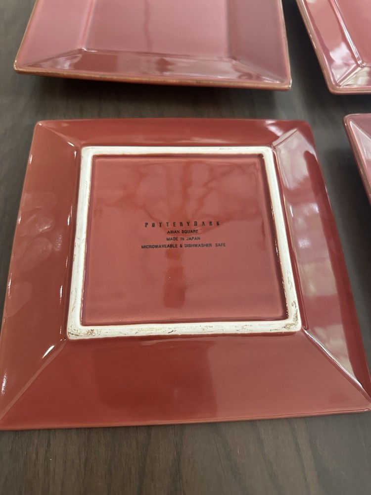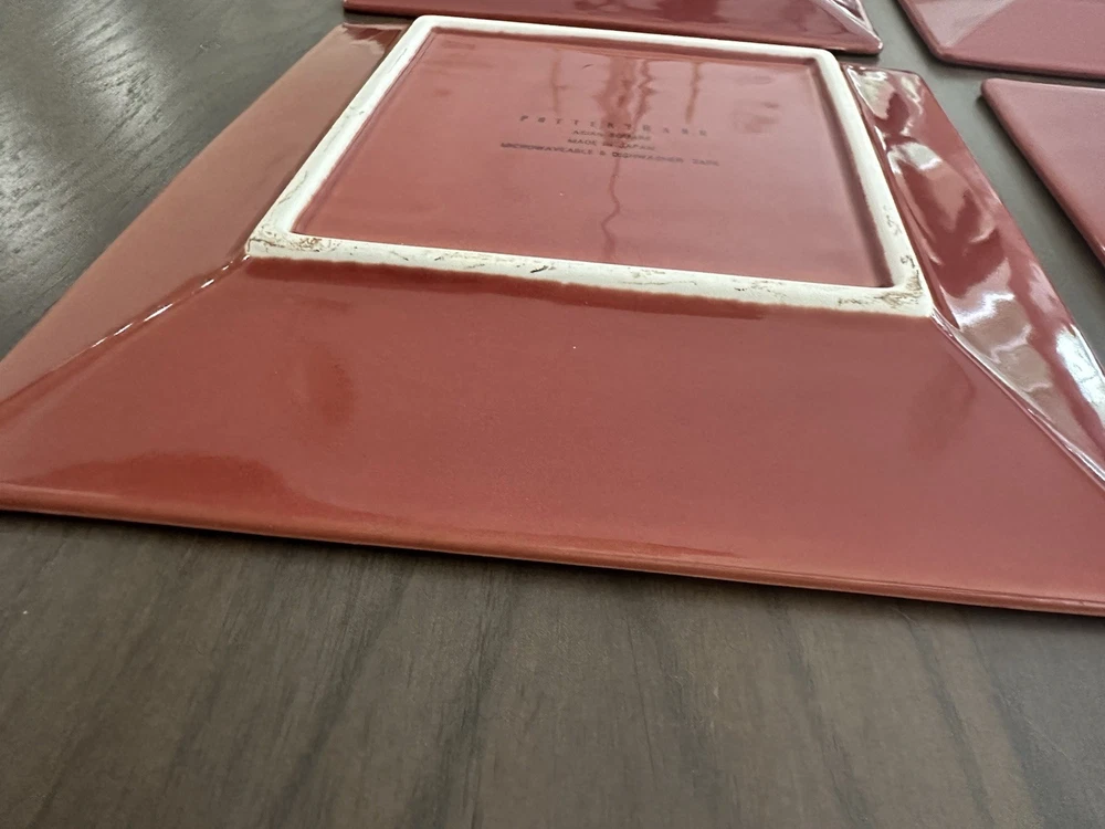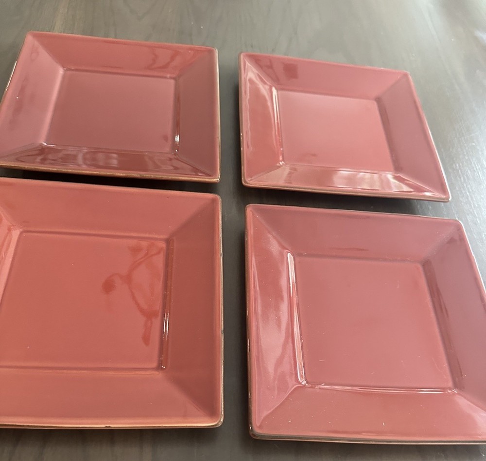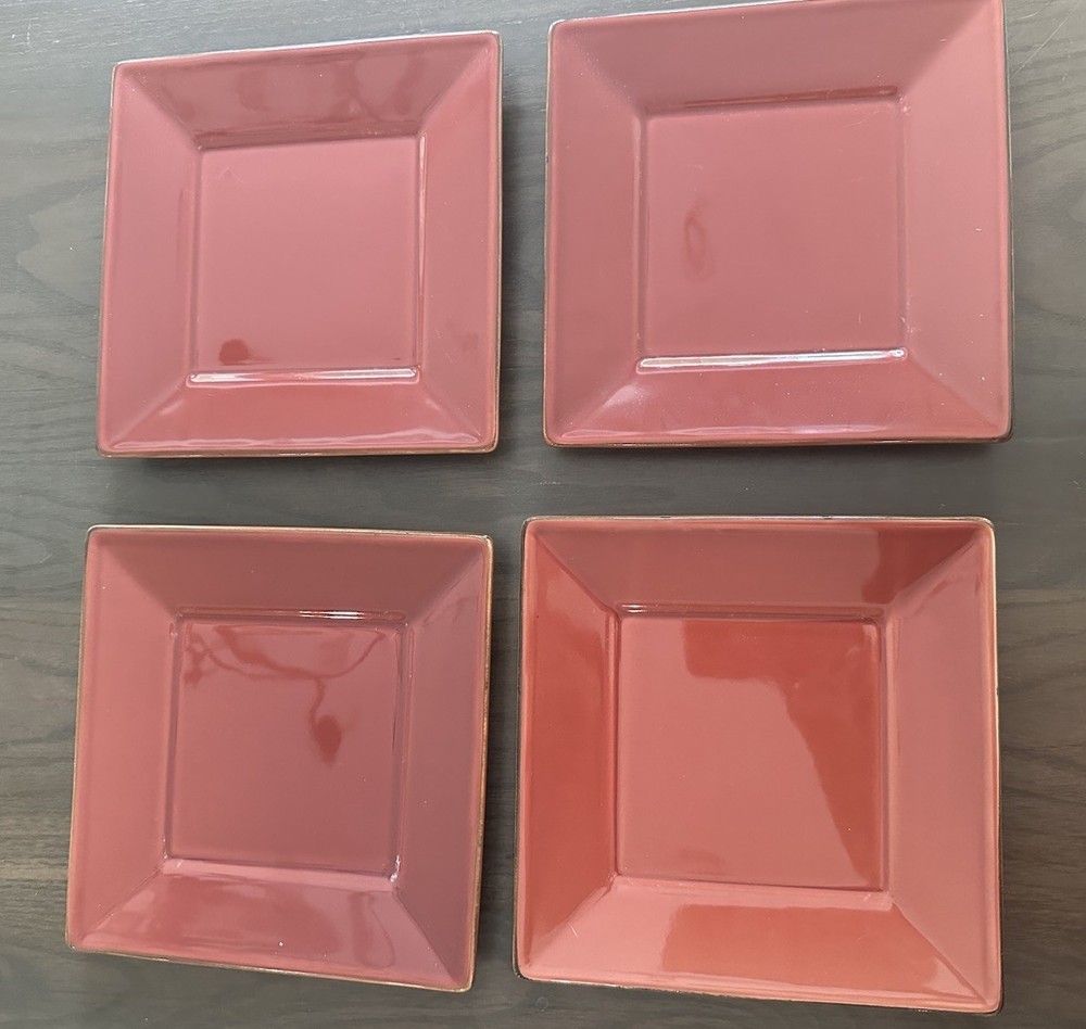 Beautiful Plates with a deep, rich orangish-red color The high gloss makes the color appear lighter with the flash They have never been used and have a subtle brown edge to add interest to these pretty plates