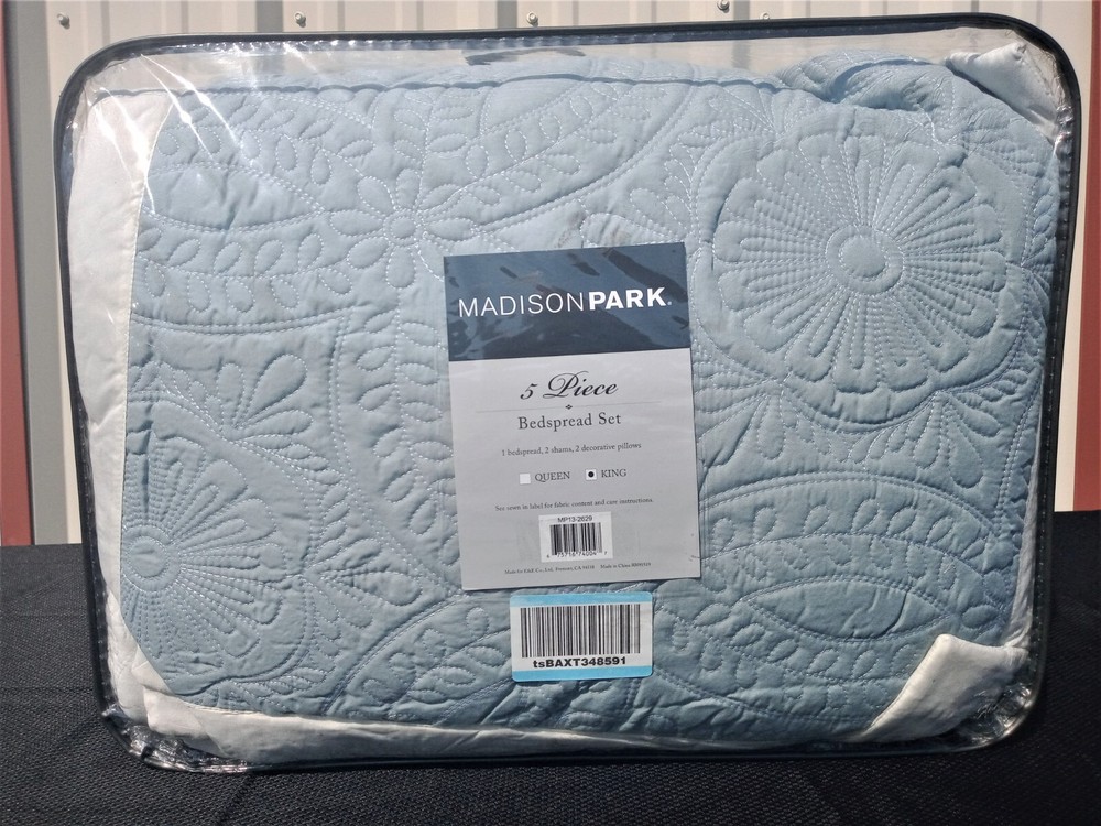 Add color to your traditional space with the Ashbury Bedspread Set. The soft blue is accented with large quilting in a medallion pattern while a large ivory border for a deluxe 'hotel style' bedding. Naturally LIGHTWEIGHT & BREATHABLE Bedding PERFECT FOR SUMMER use or layer it on for cold weather. Set includes: 1 Bedspread: 120"W x 118"L, 2 Decorative Pillows: 12"W x 18"L/18"W x 18"L, 2 King Shams: 20"W x 36"L + 2"D Care instructions: Machine wash cold, gentle cycle, and separately. Do not bleach. Tumble dry low, remove promptly. Do not iron. Spot clean pillow. If there is no free movement in the washer or dryer, use large capacity commercial washer/dryer.