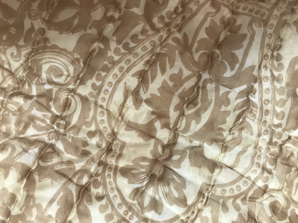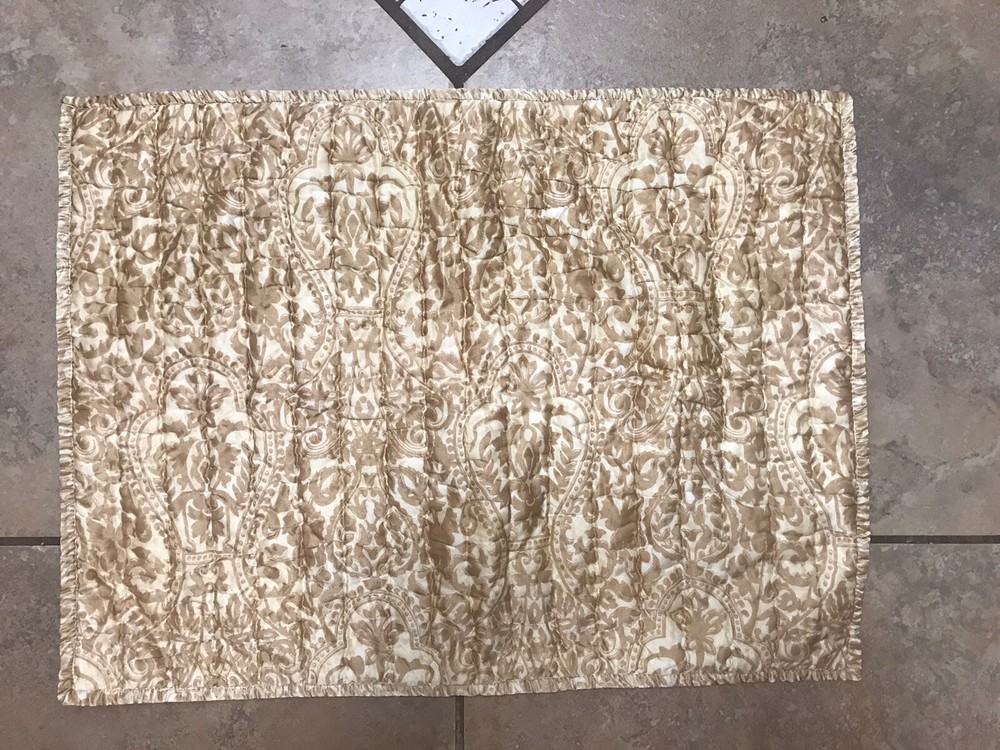 2 Pottery Barn Silk patterned Quilted Pillow Covers. Gold Beige standard 27” rectangles. No damage or stains. Beautiful gold pattern on one side and solid on the other. Envelope entrance. Smoke and pet free home. Thank you!