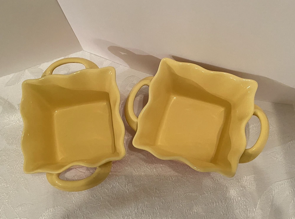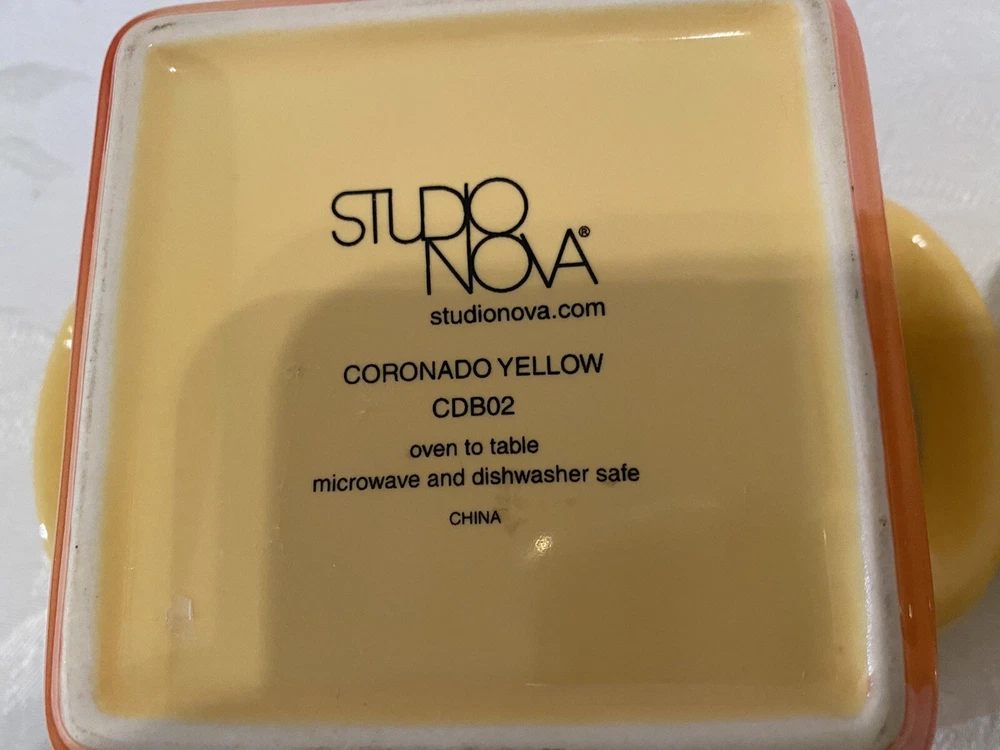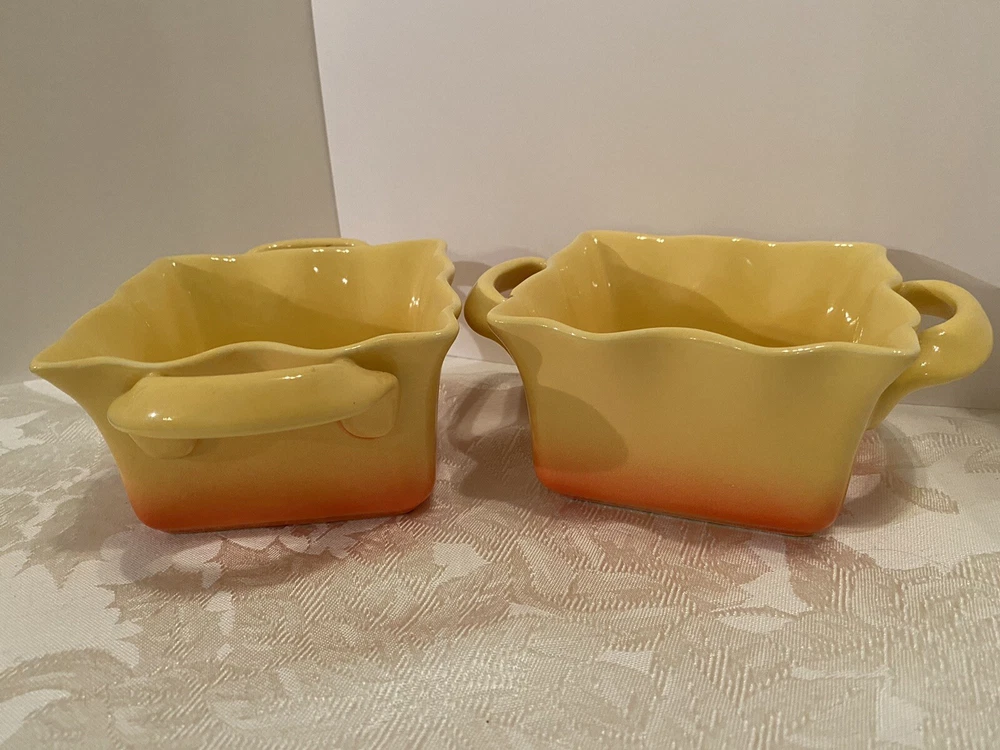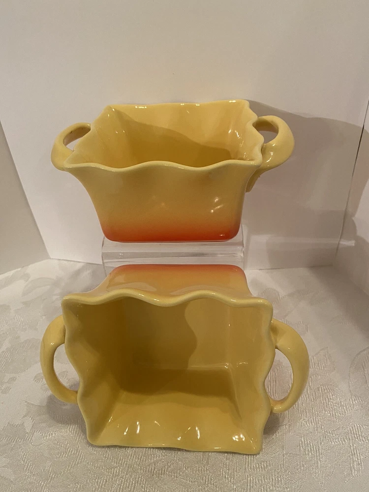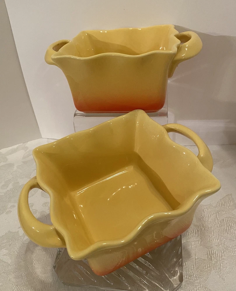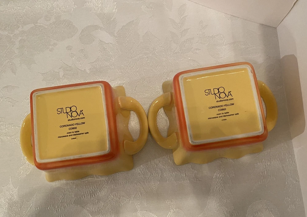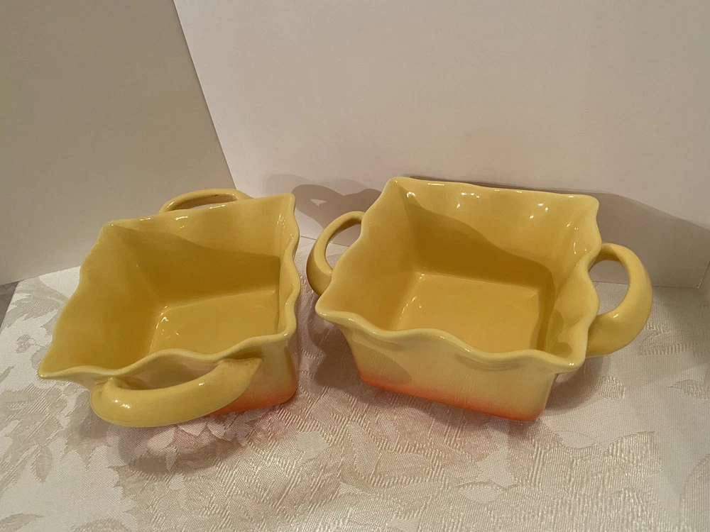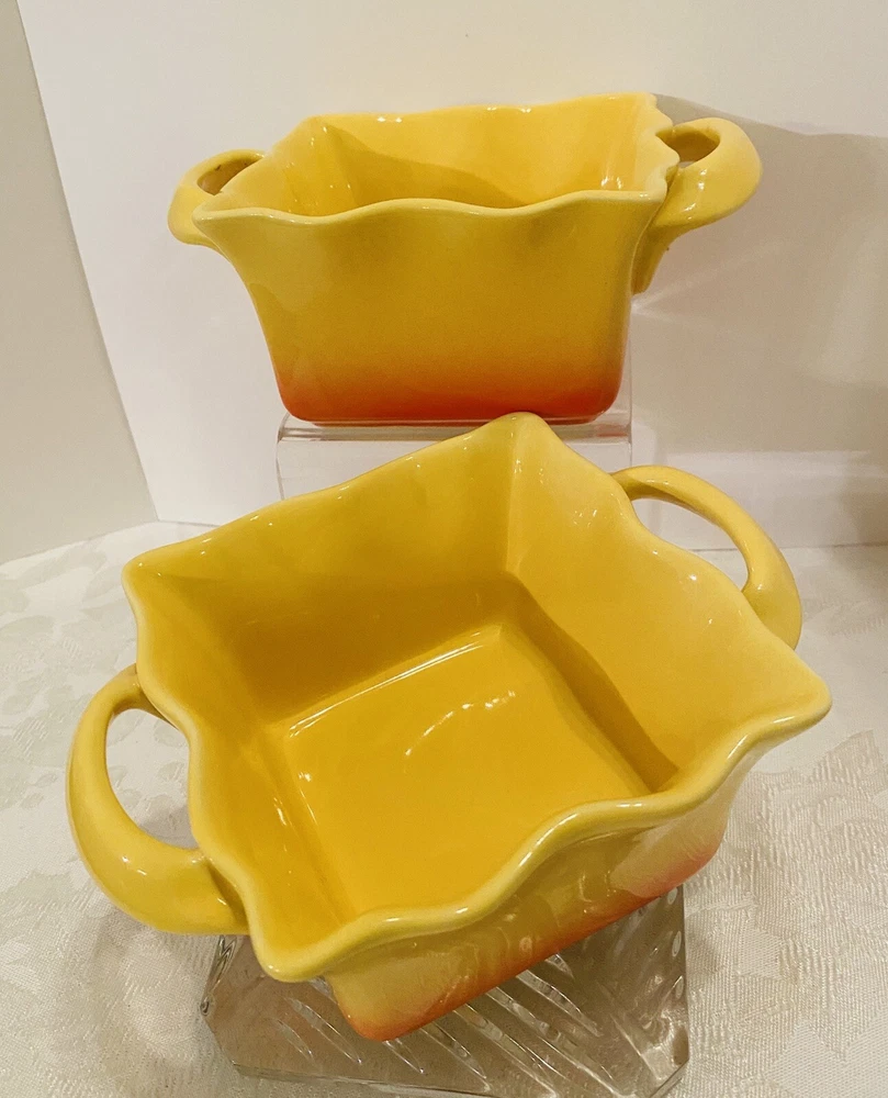 # 707 Set Of 2 Studio Nova Coronado Yellow Orange Baking Dish Souffle Ruffled 16 oz. Excellent Condition, like new. Used. Pets and smoke free I have other yellow pottery for sale. Check my last picture, please. Shipped with USPS Priority Mail.