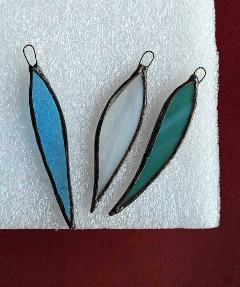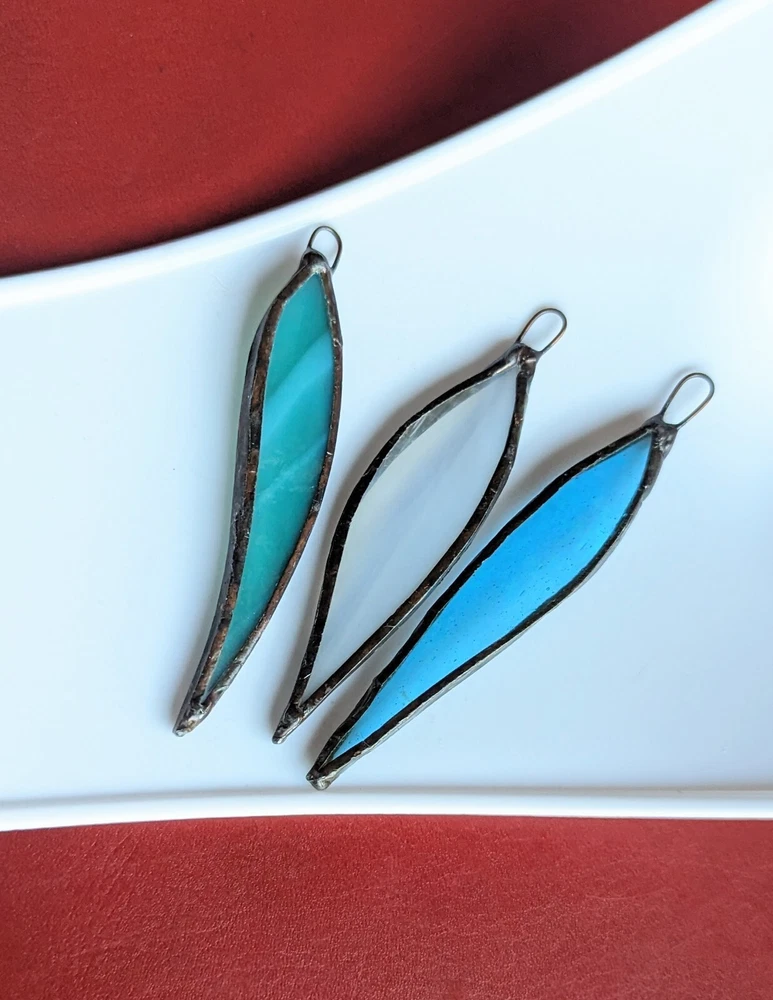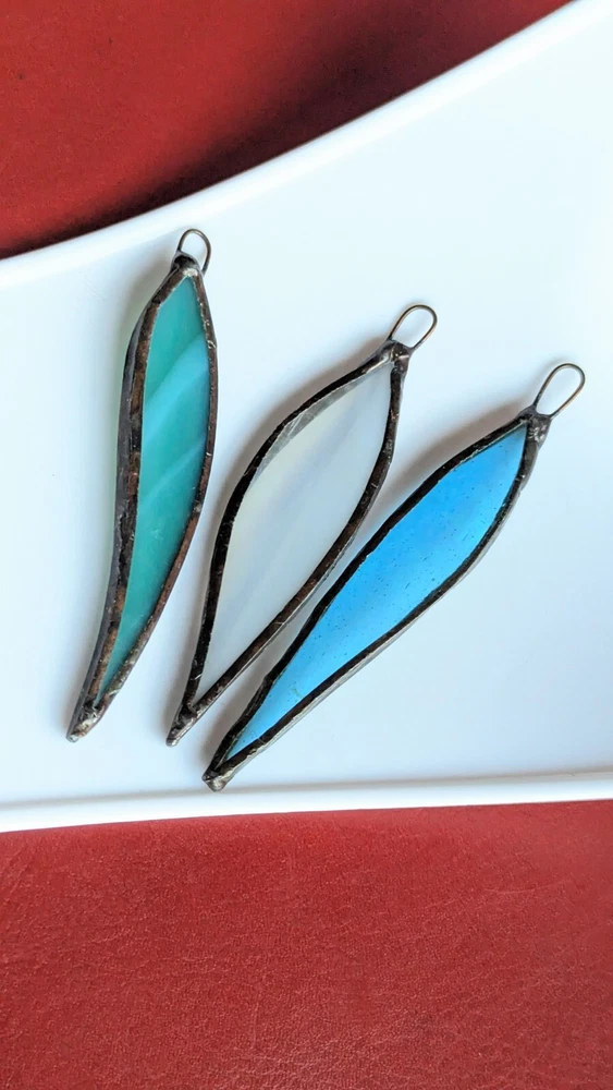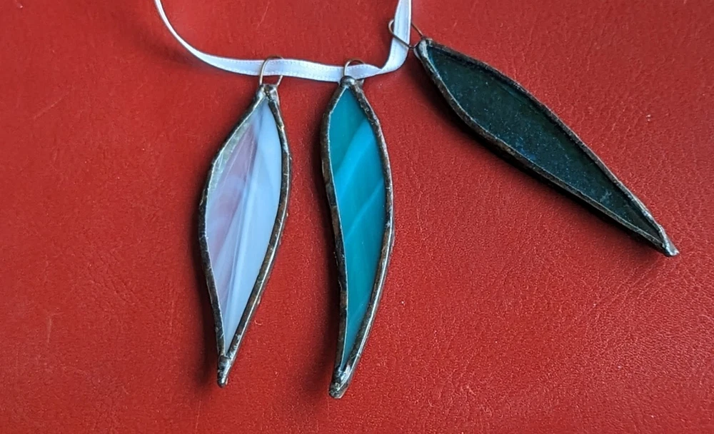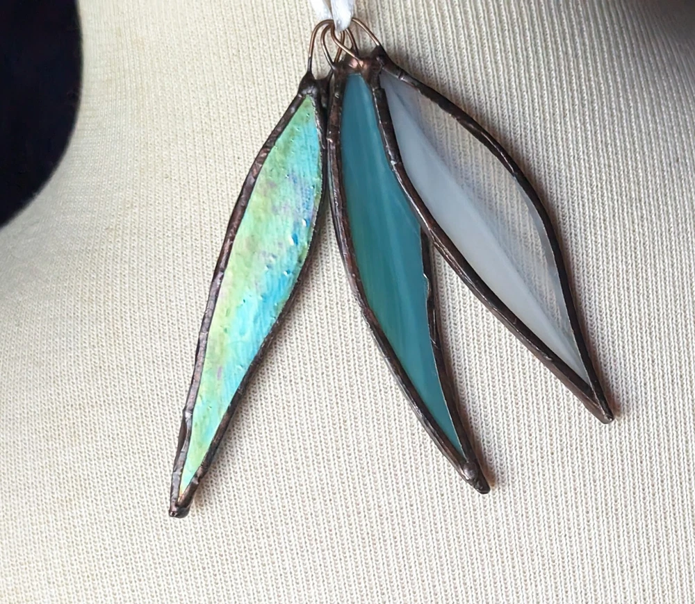 Set Of 3 Studio Stained Glass Blue Green Leaf Feather Shard Necklace Pendants Please check all the photos for best representation of items condition and measurements Measurements approximately 3½" One is dichroic.