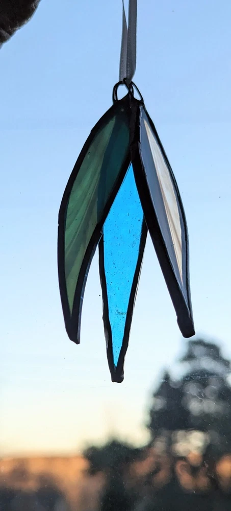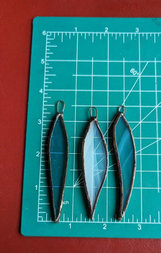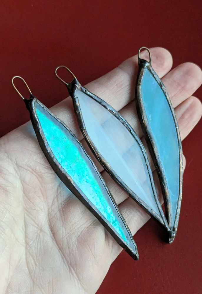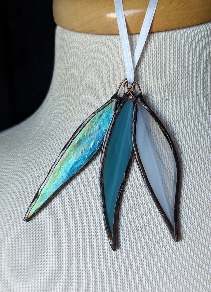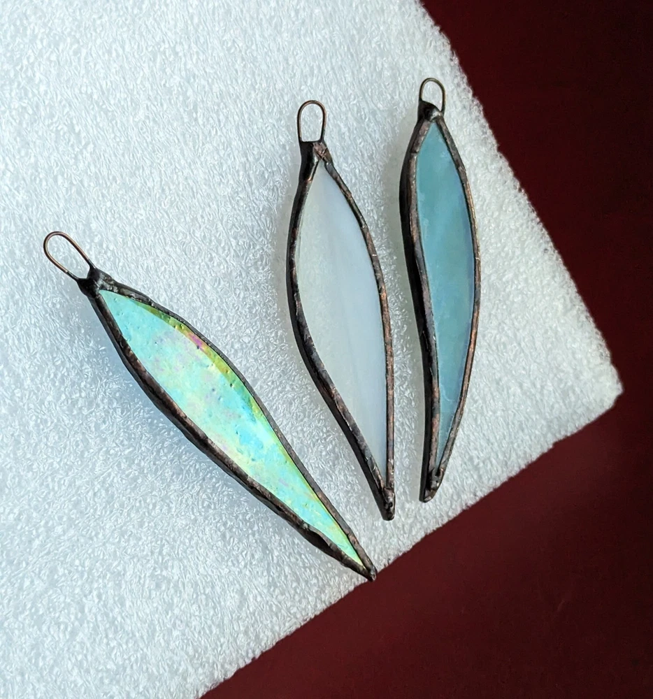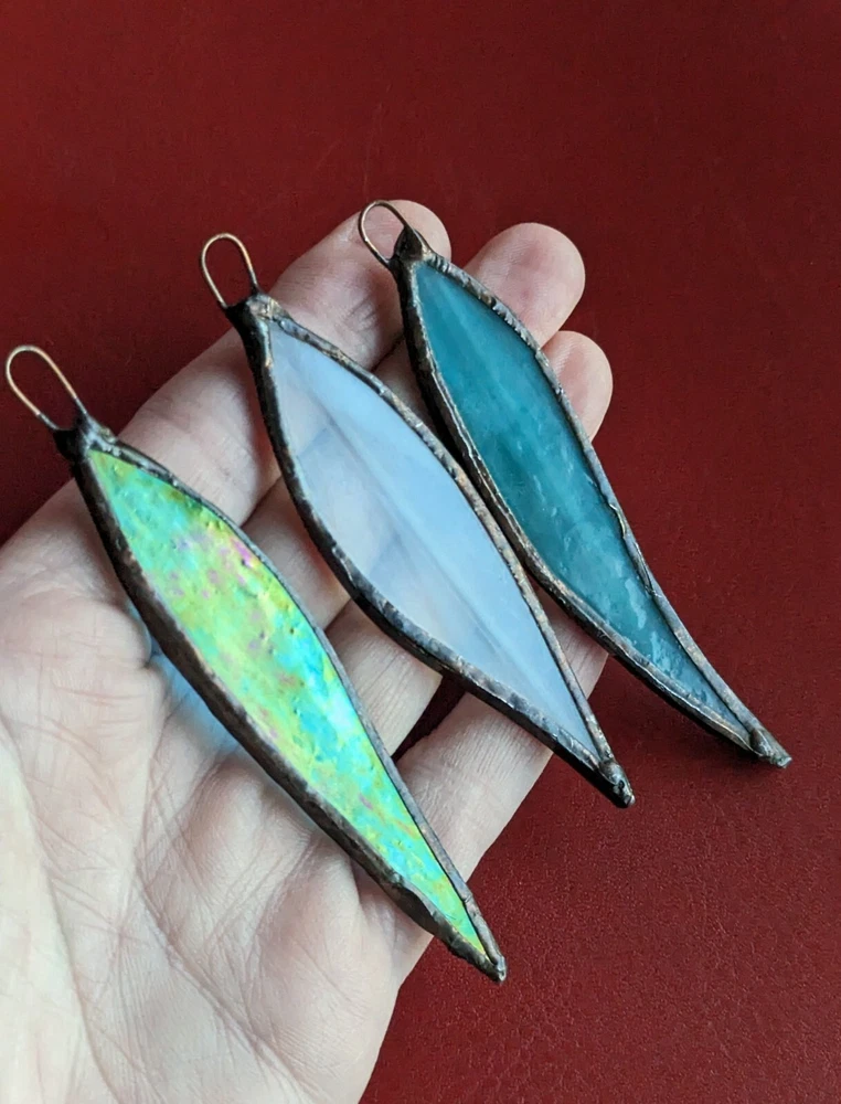 Set Of 3 Studio Stained Glass Blue Green Leaf Feather Shard Necklace Pendants Please check all the photos for best representation of items condition and measurements Measurements approximately 3½" One is dichroic.