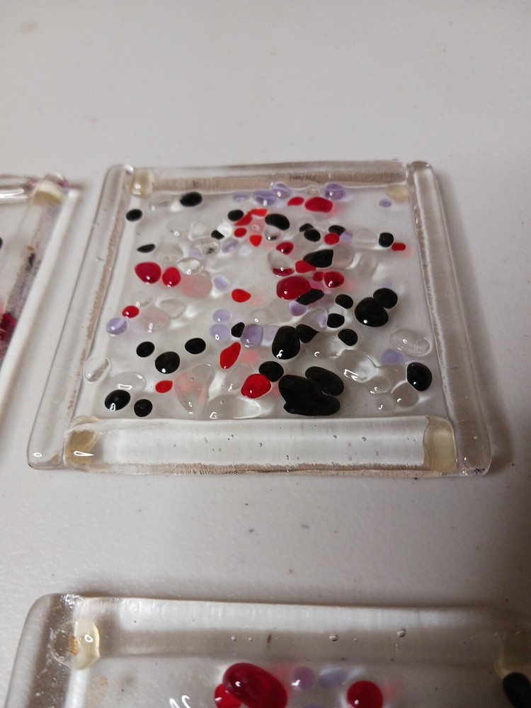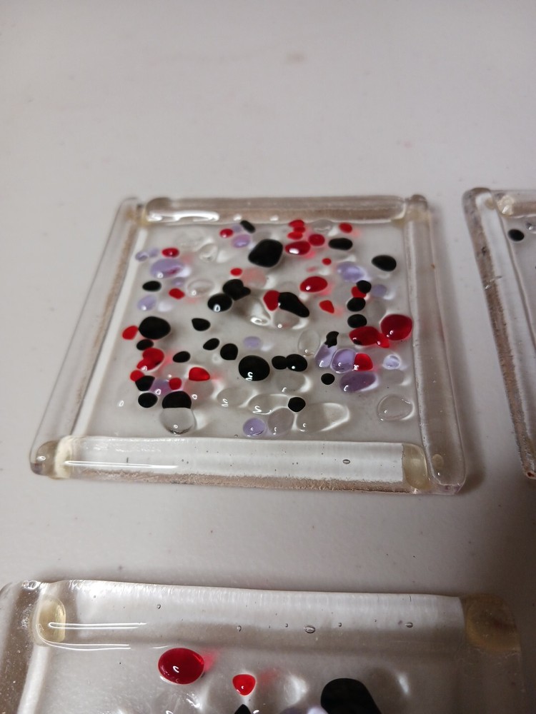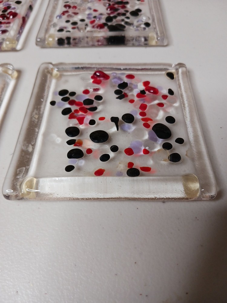 Set of 4 Studio Art Glass Fused Glass dichroic abstract Coaster Tiles measuring 3.75 inches in diameter. These multicolor coasters are vintage items from the late 20th century, featuring an abstract design and handmade production style. Each coaster tile weighs 2.5 lbs and is square in shape, adding a unique touch to your drinkware and barware collection.